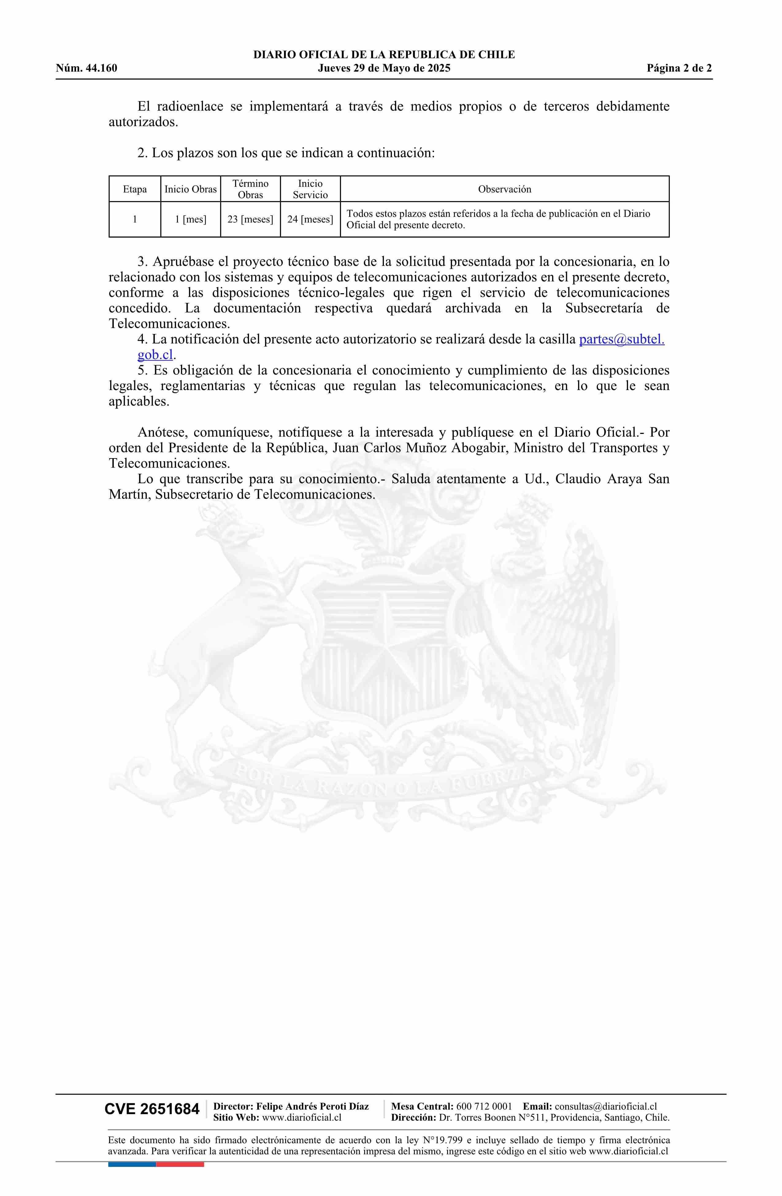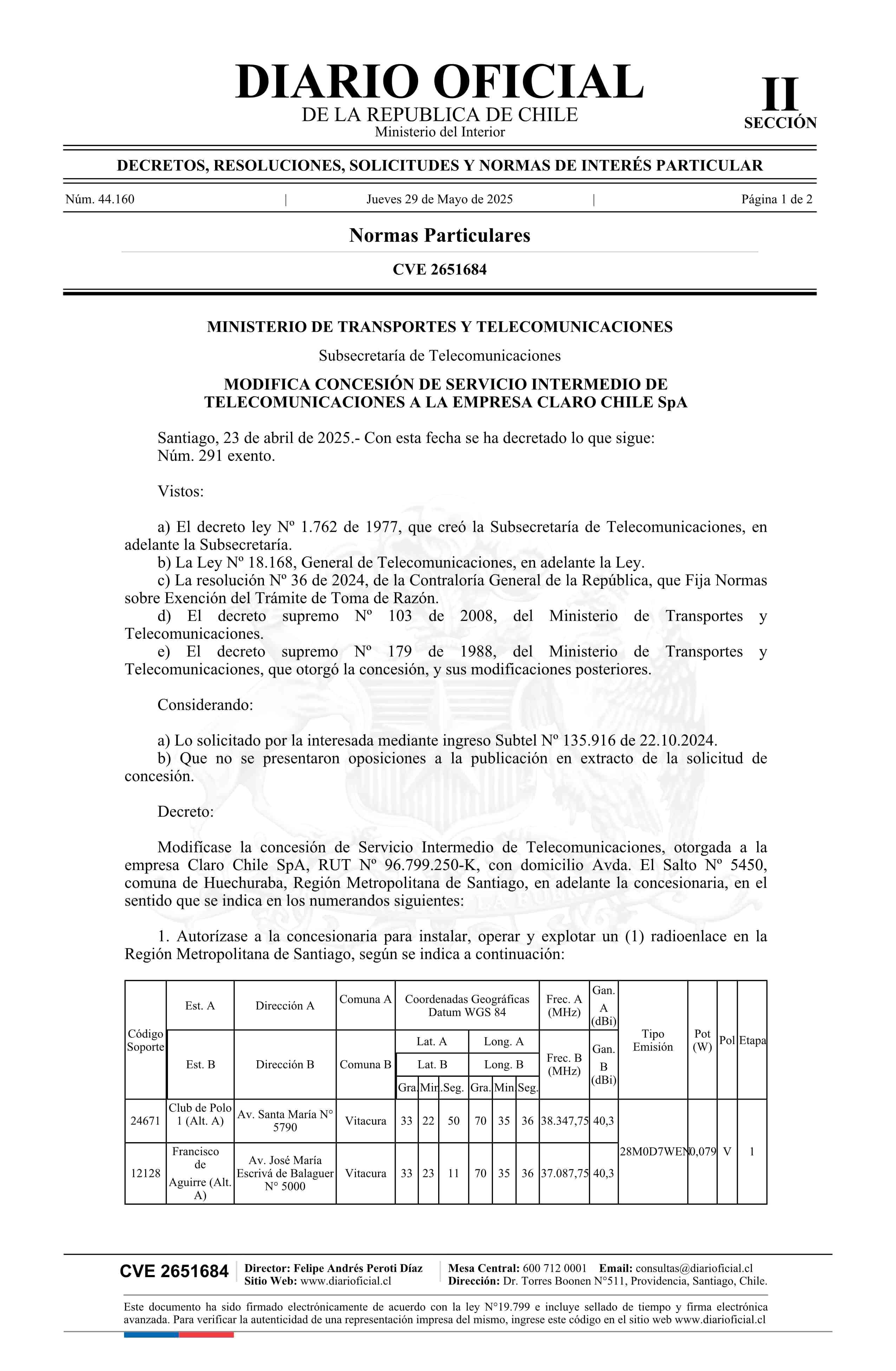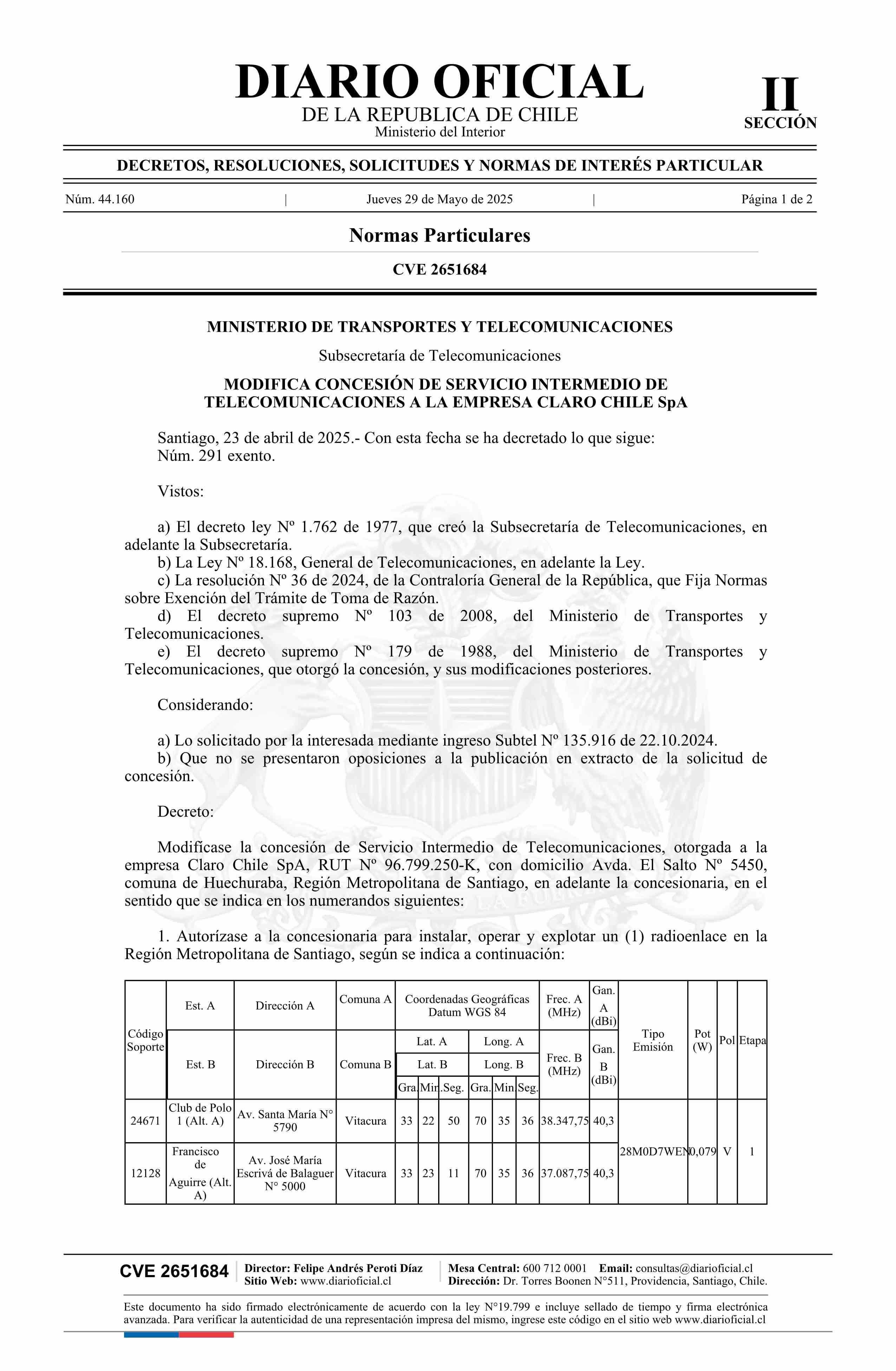 Decreto exento número 291, de 2025.- Modifica concesión de servicio intermedio de telecomunicaciones a la empresa Claro Chile SpA 29-05-2025 Diario Oficial Edición Electrónica |
