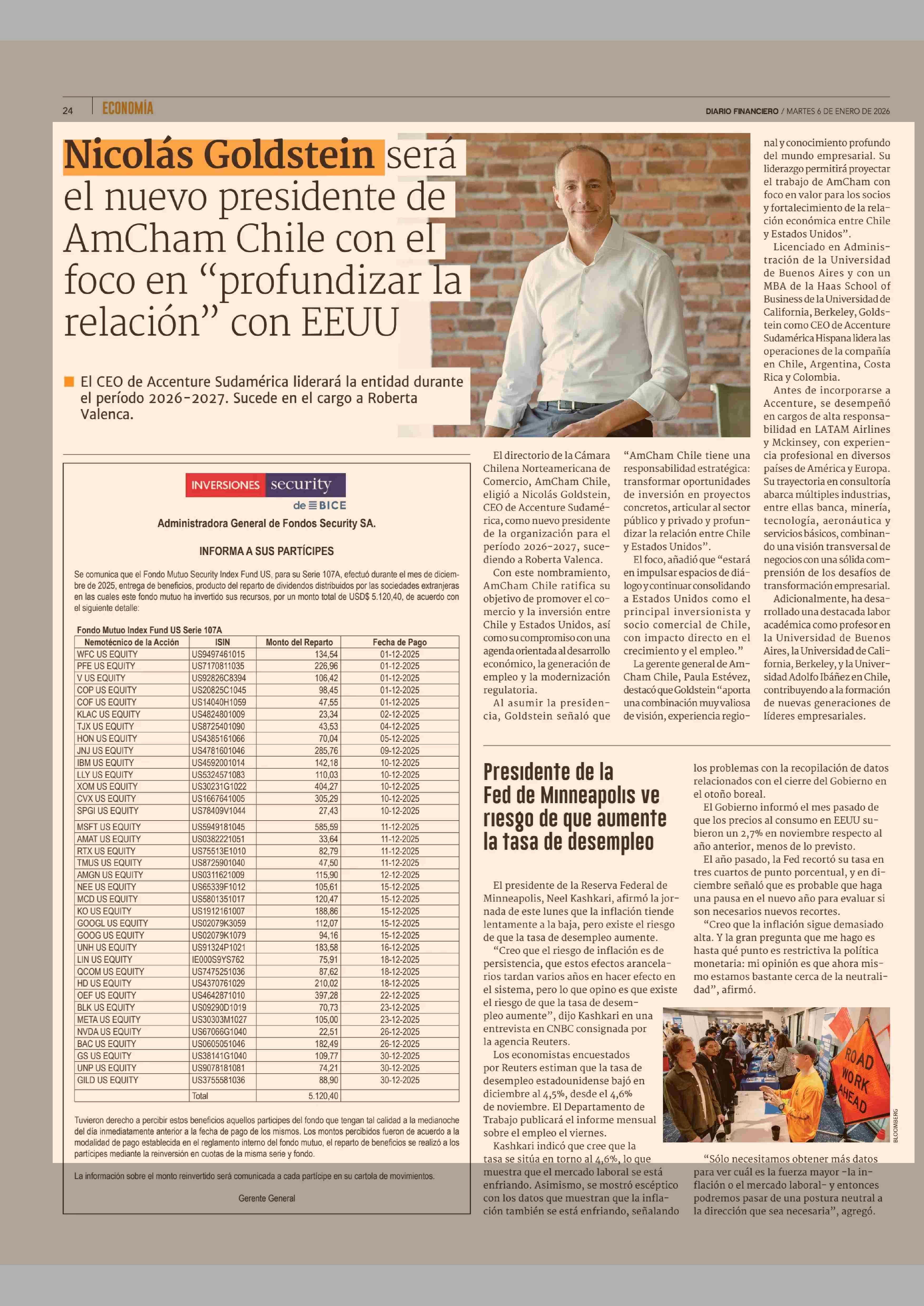 Nicolás Goldstein será el nuevo presidente de AmCham Chile con el foco en "profundizar la relación" con EEUU 06-01-2026 Diario Financiero |