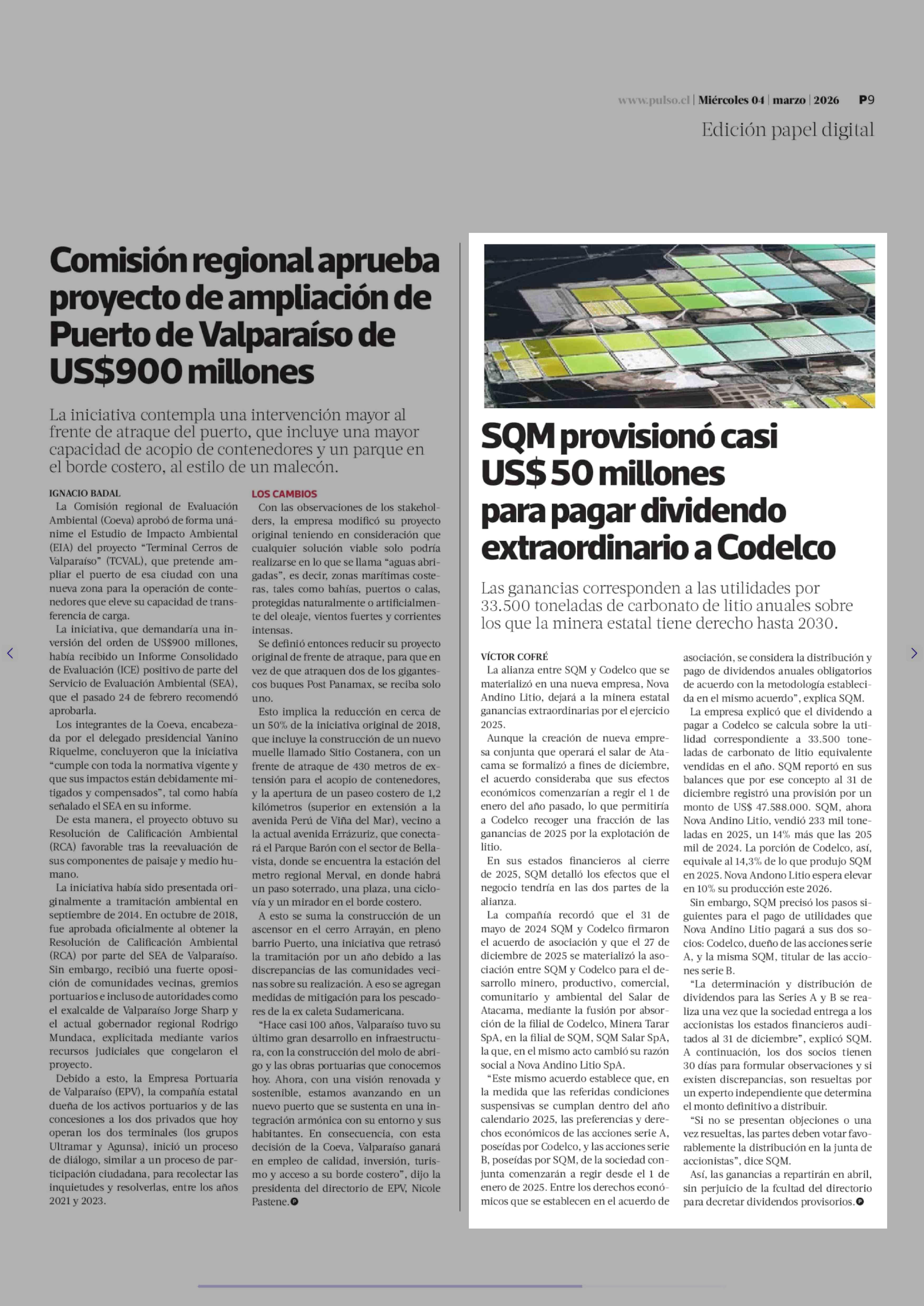 Título: SQM provisionó casi US$ 50 millones para pagar dividendo extraordinario a Codelco