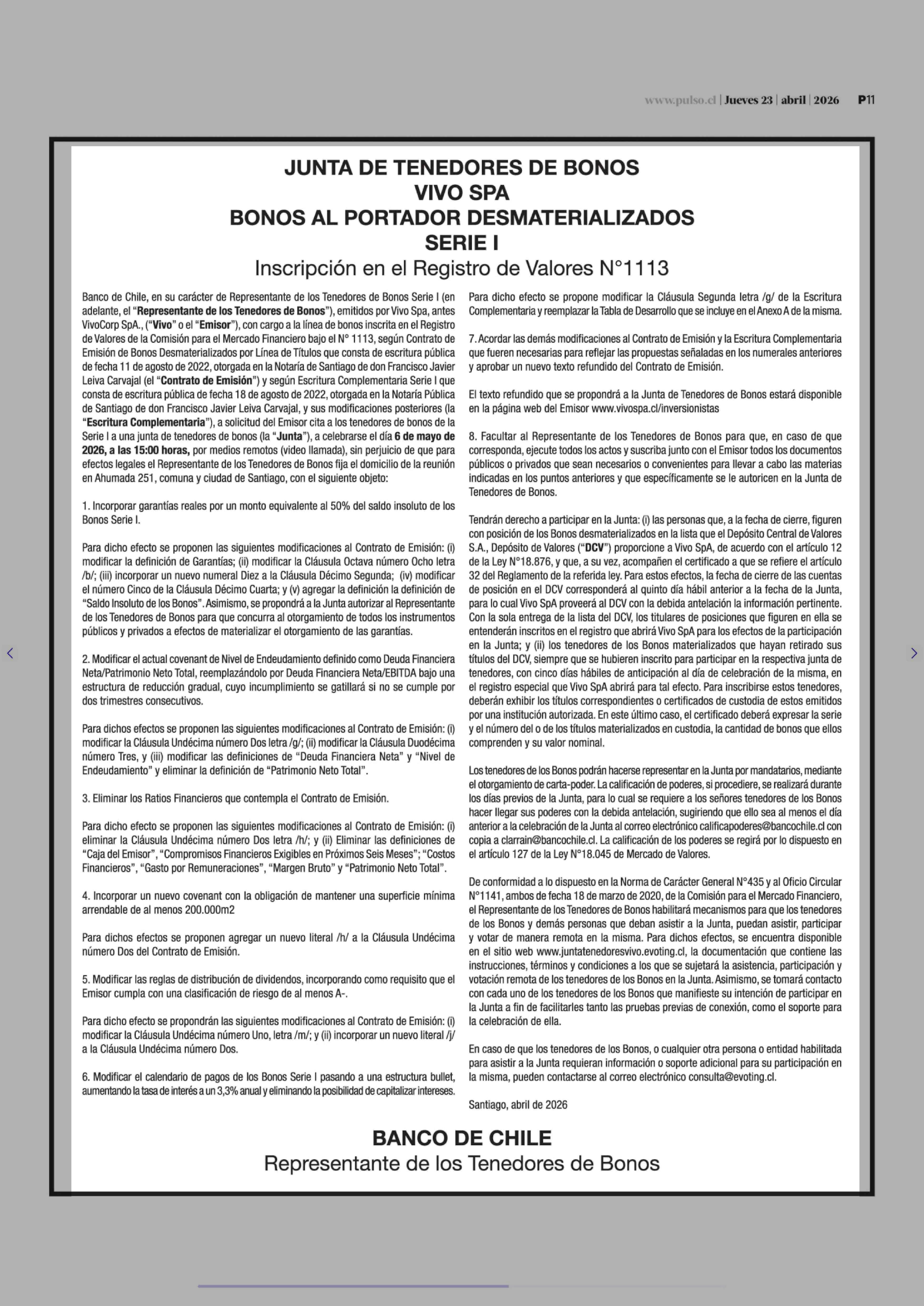 Extractos: JUNTA DE TENEDORES DE BONOS VIVO SPA BONOS AL PORTADOR DESMATERIALIZADOS SERIE I Inscripción en el Registro de Valores Nº1113 23-04-2026 La Tercera |