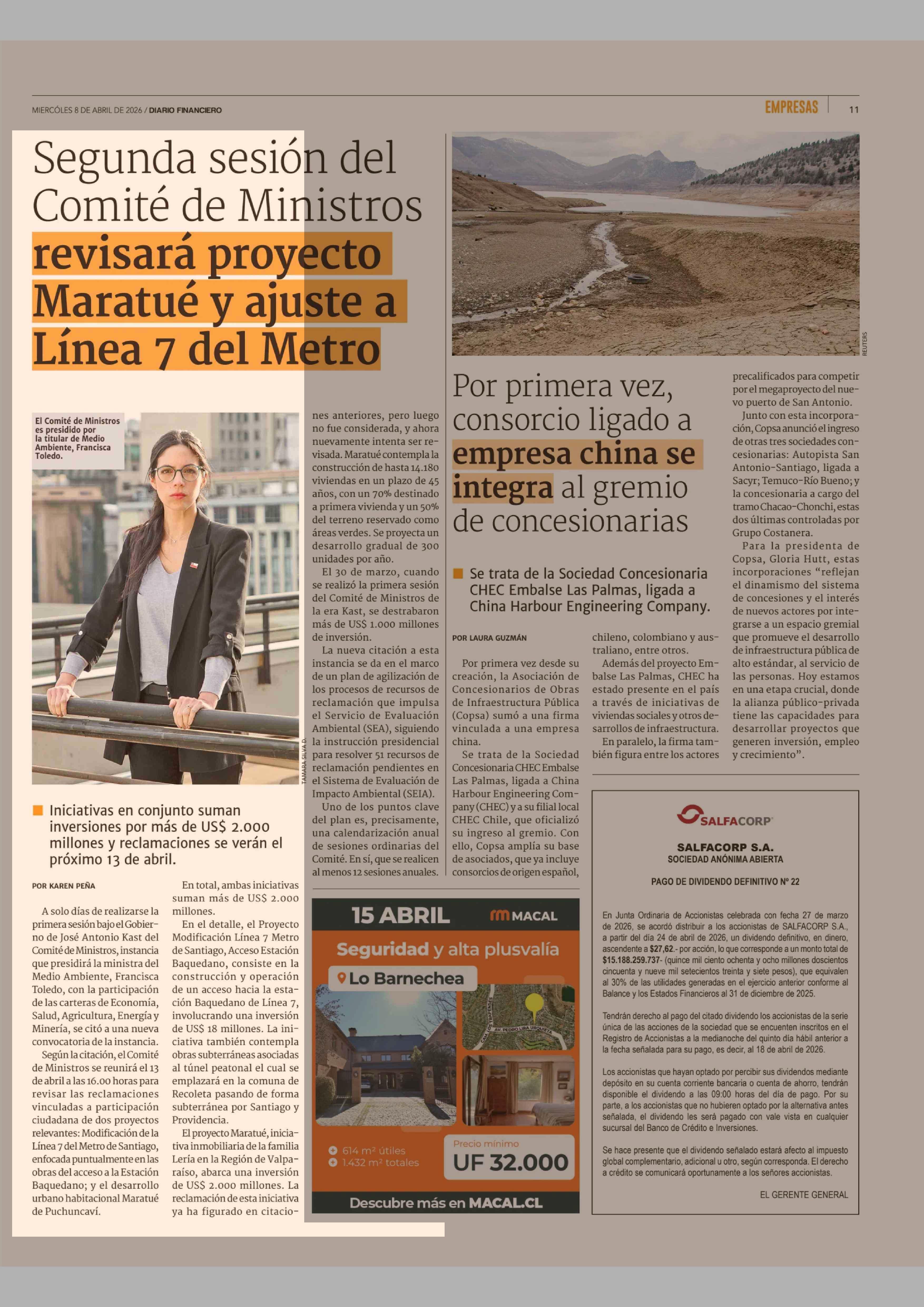 Segunda sesión del Comité de Ministros revisará proyecto Maratué y ajuste a Línea 7 de Metro 08-04-2026 Diario Financiero |