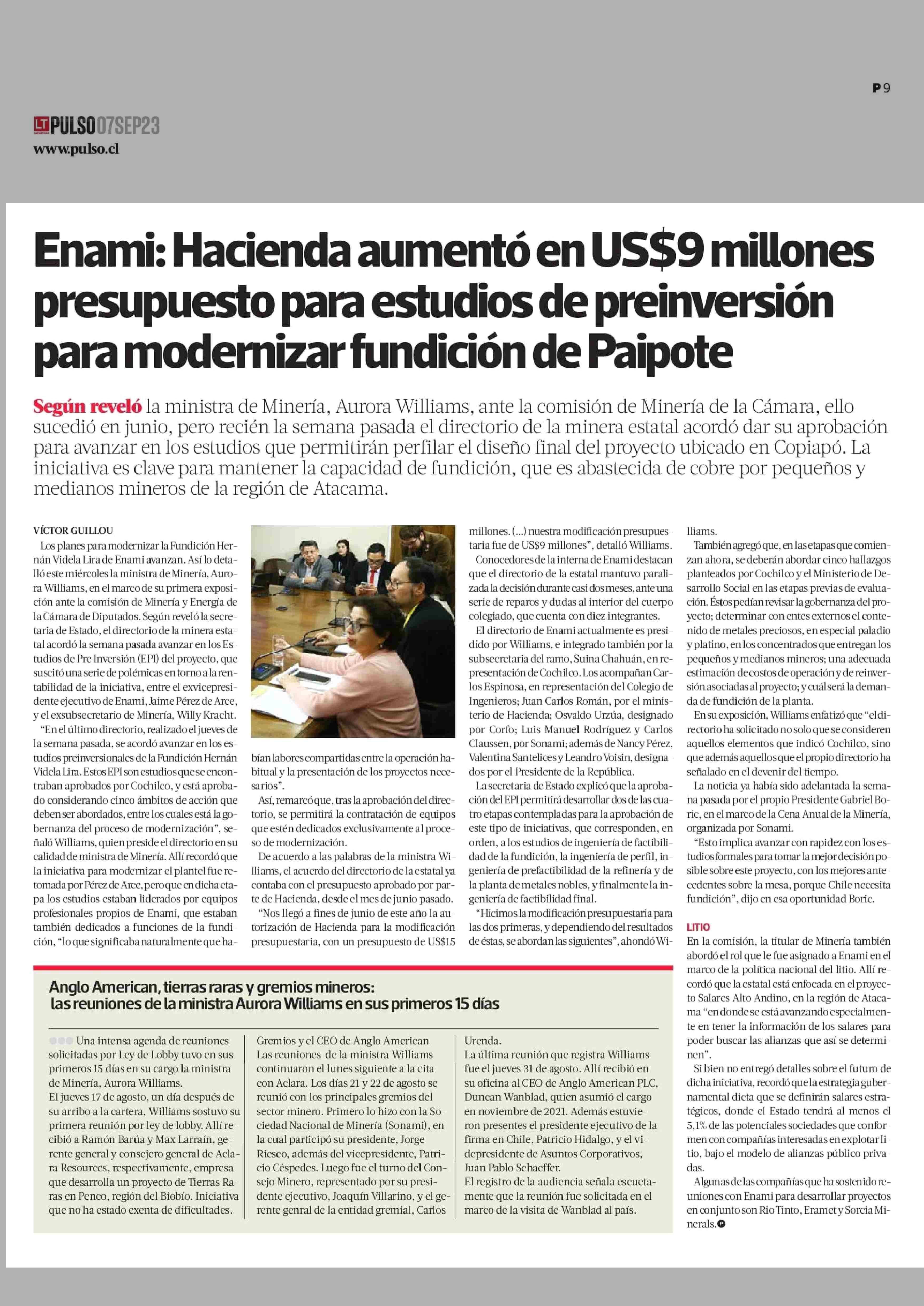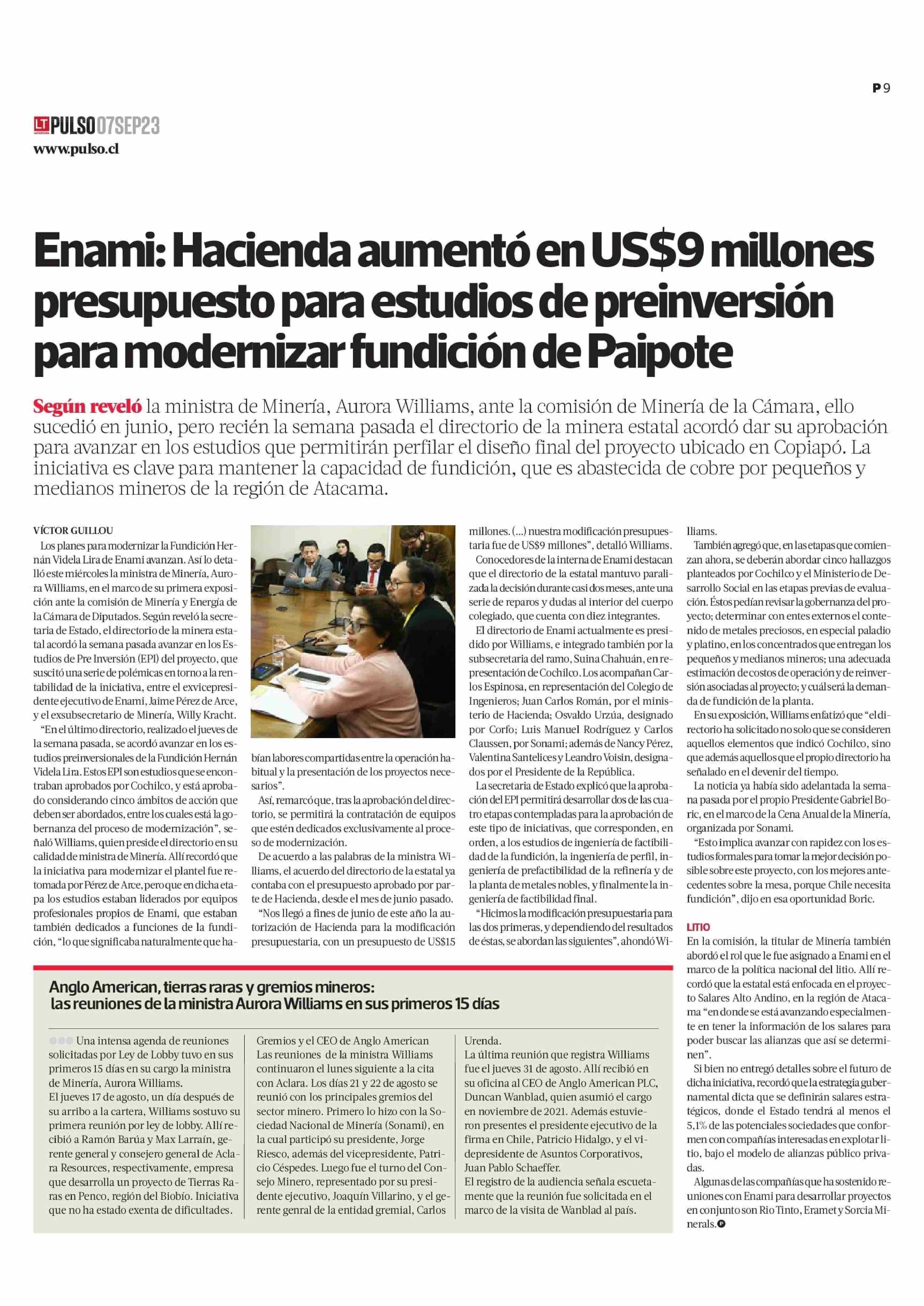 Enami: Hacienda aumentó en USS9 millones presupuesto para estudios de preinversión para modemizar fundición de Paipote 07-09-2023 La Tercera |