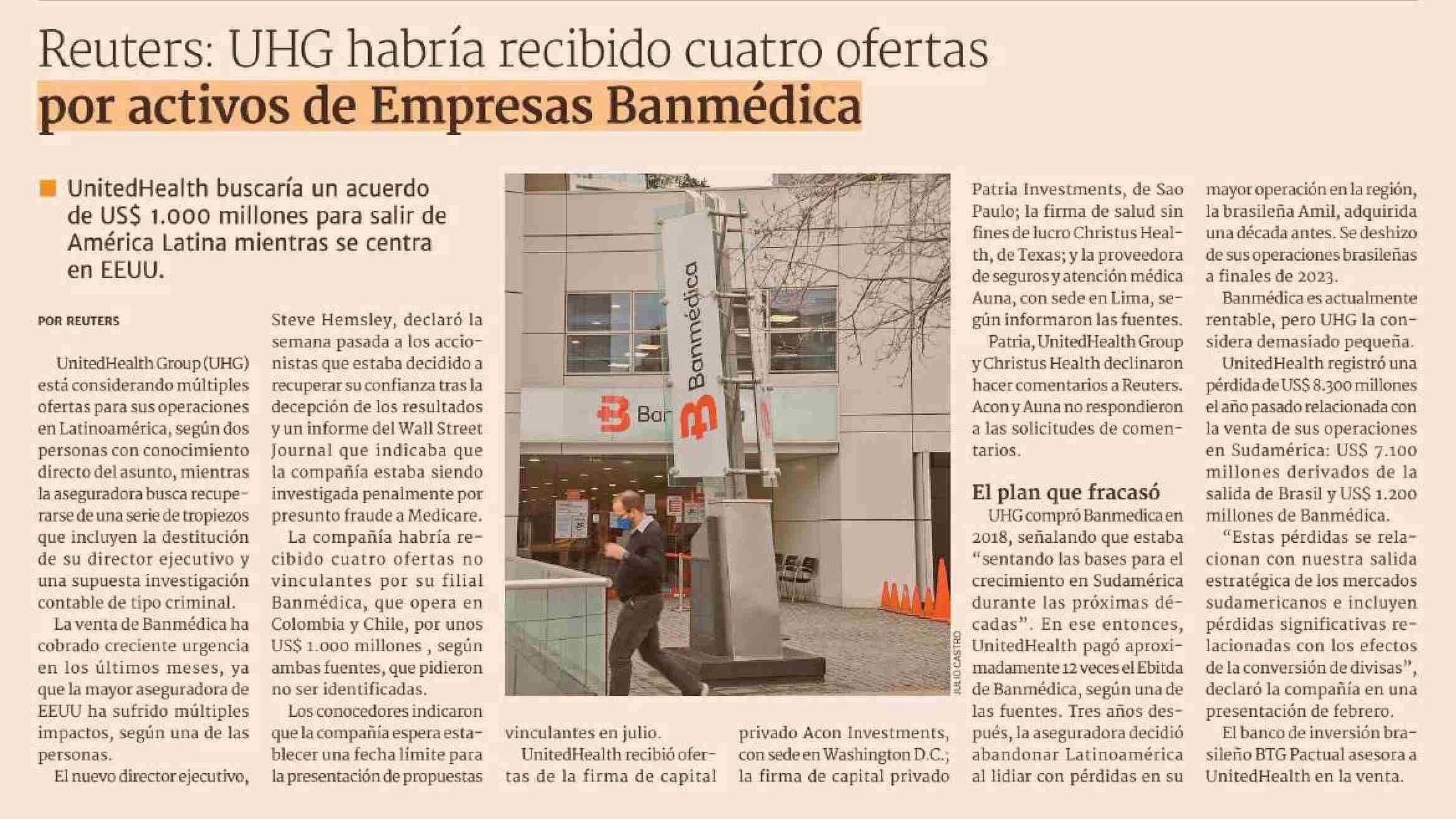 Reuters: UHG habría recibido cuatro ofertas por activos de Empresas Banmédica 10-06-2025 Diario Financiero |