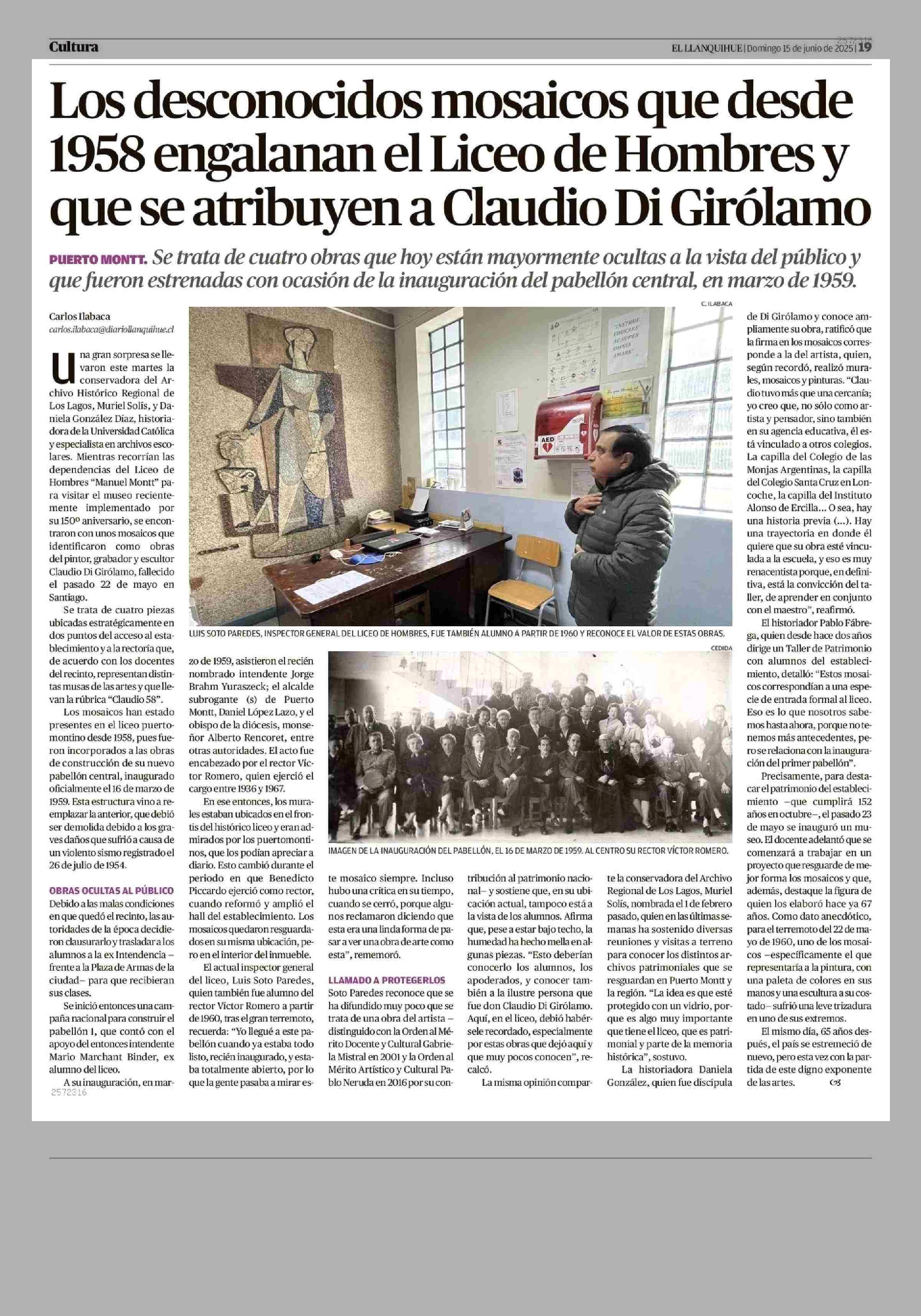 Los desconocidos mosaicos que desde 1958 engalanan el Liceo de Hombres y que se atribuyen a Claudio Di Girolamo 15-06-2025 El Llanquihue |