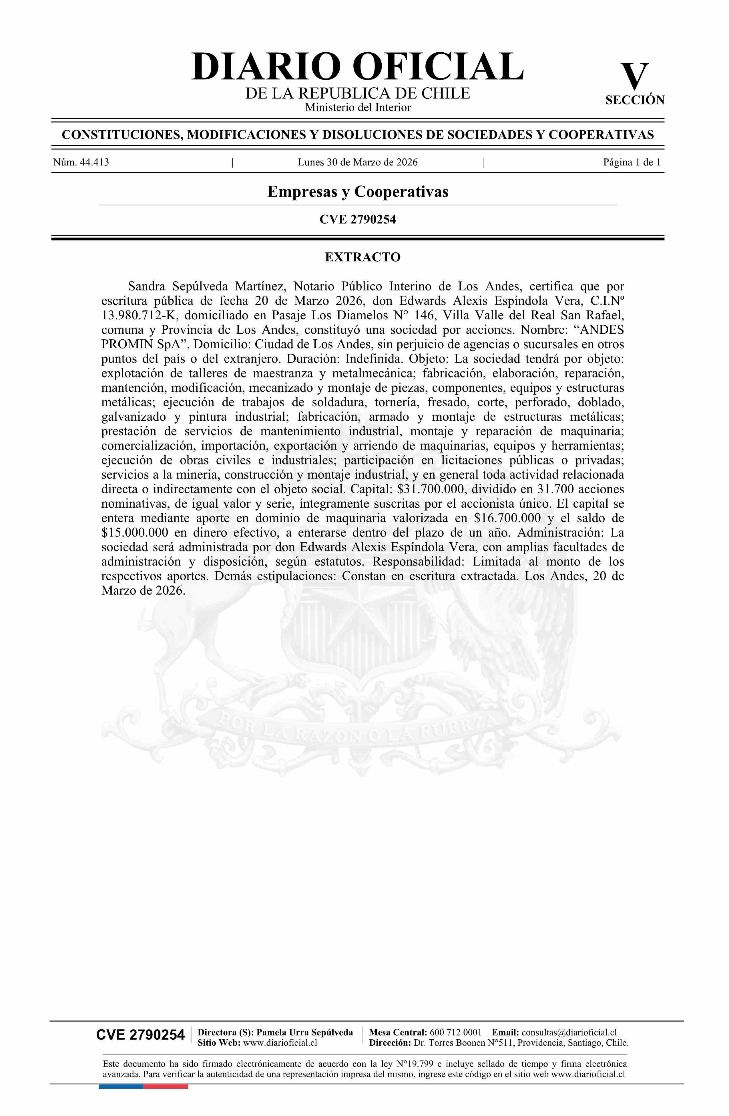 ANDES PROMIN SpA 30-03-2026 Diario Oficial Edición Electrónica |