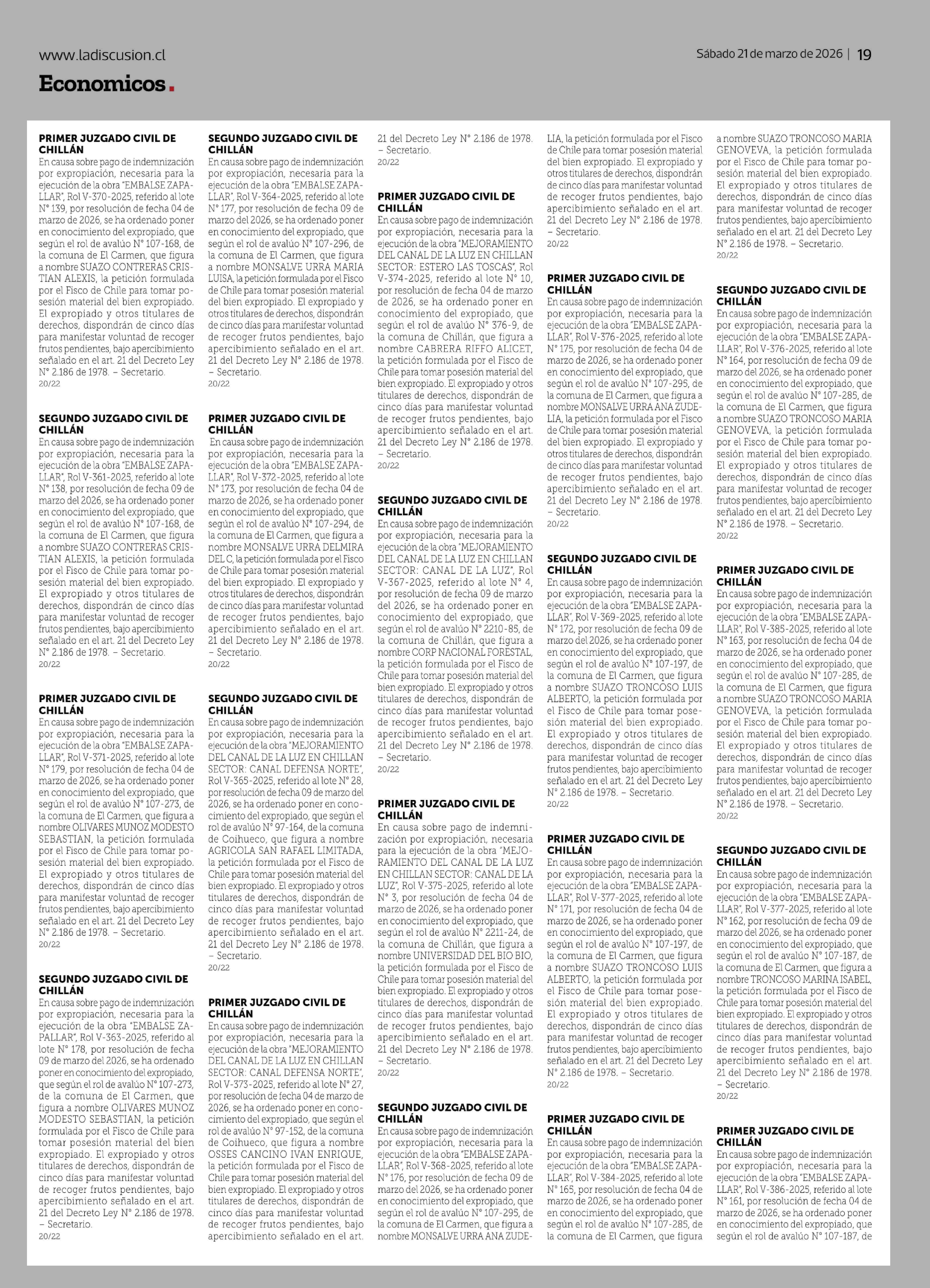 | Título: | SEGUNDO JUZGADO CIVIL DE CHILLÁN En causa sobre pago de indemnización por expropiación, necesaria para la ejecución de la obra "EMBALSE ZAPALLAR", Rol V-351-2025, referido al lote Nº 167, por resolución de fecha 09 de marzo del 2026, se ha ordenado poner en conocimiento del expropiado, que según el |