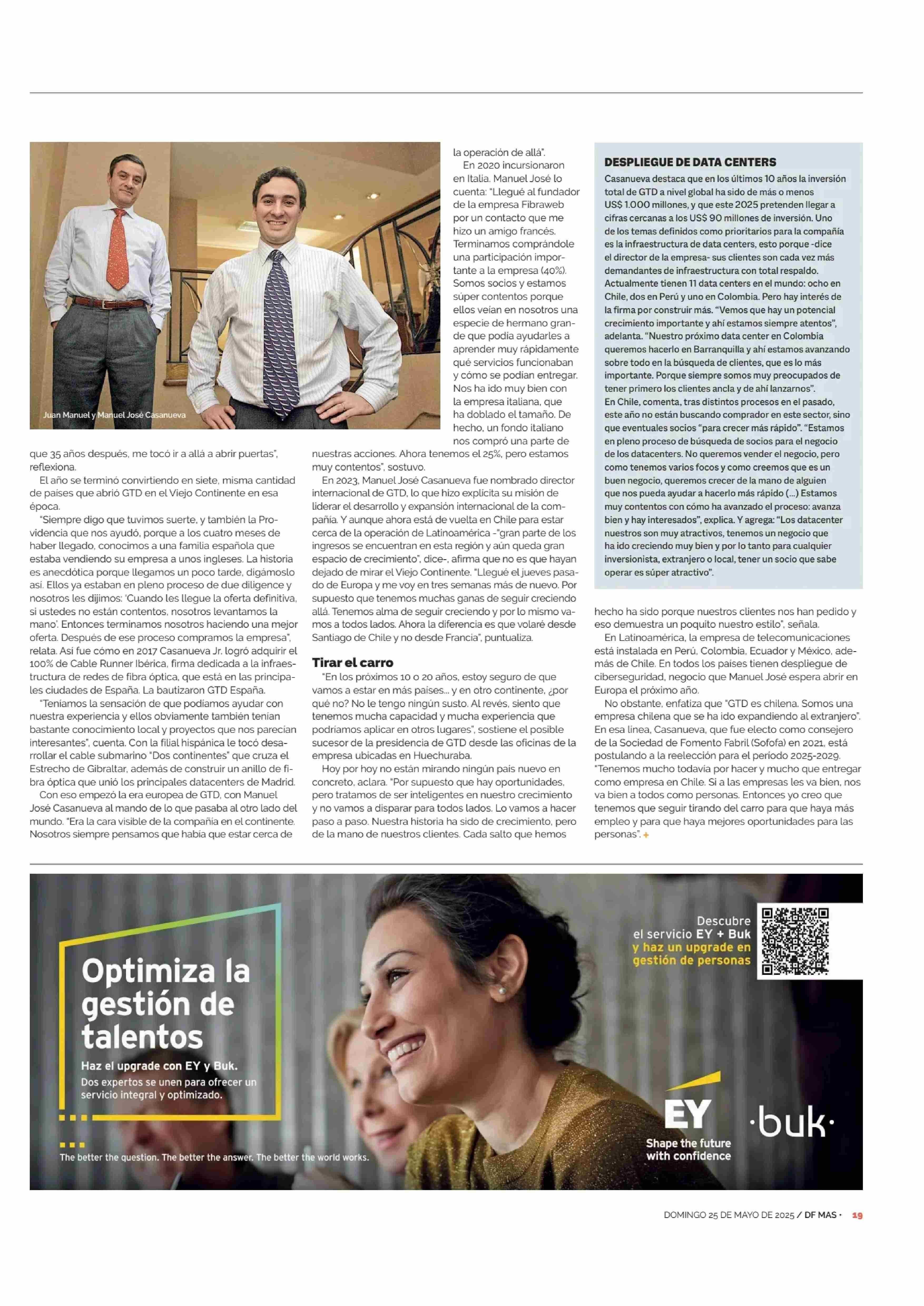 MANUEL JOSE CASANUEVA Y LA SUCESION DE GTD: “ES UN PROCESO QUE ESTAMOS TODOS CAMINANDO Y YA SE VERA SI CORRESPONDE HACER LA POSTA” 25-05-2025 Diario Financiero |