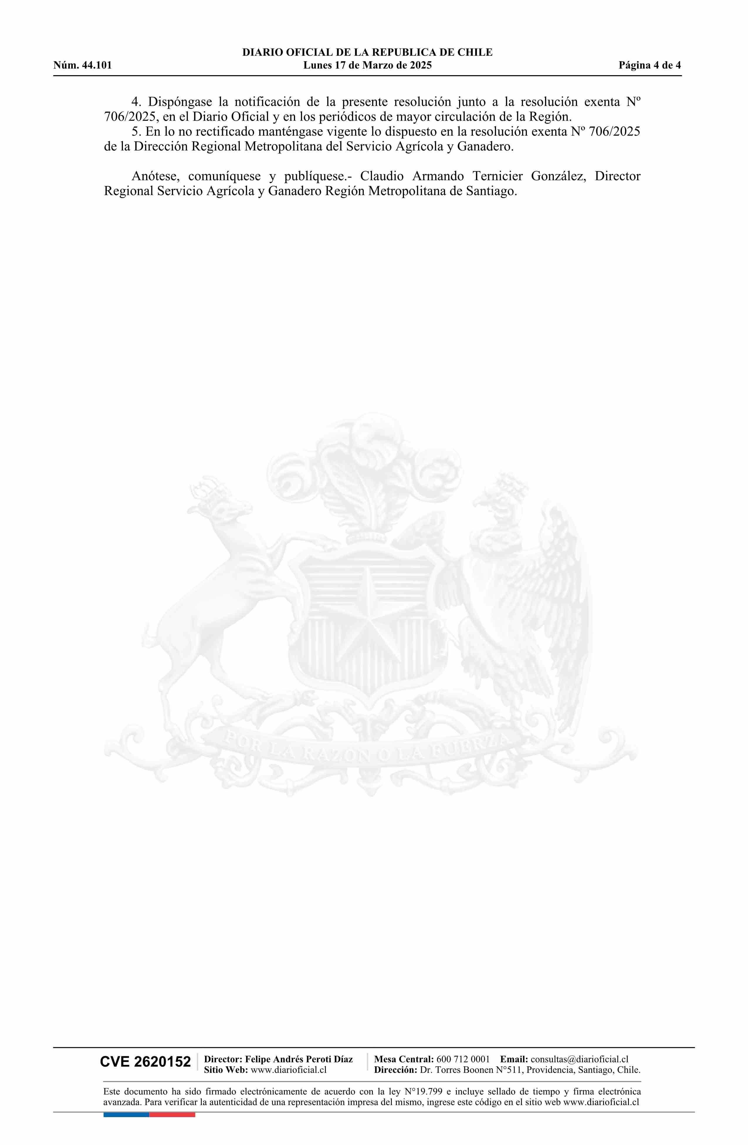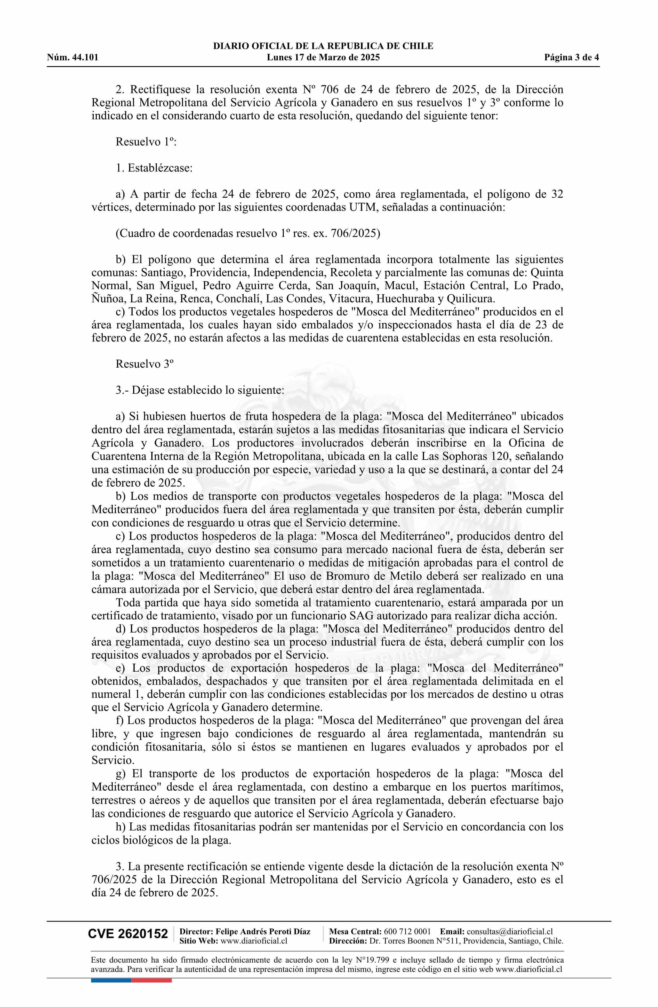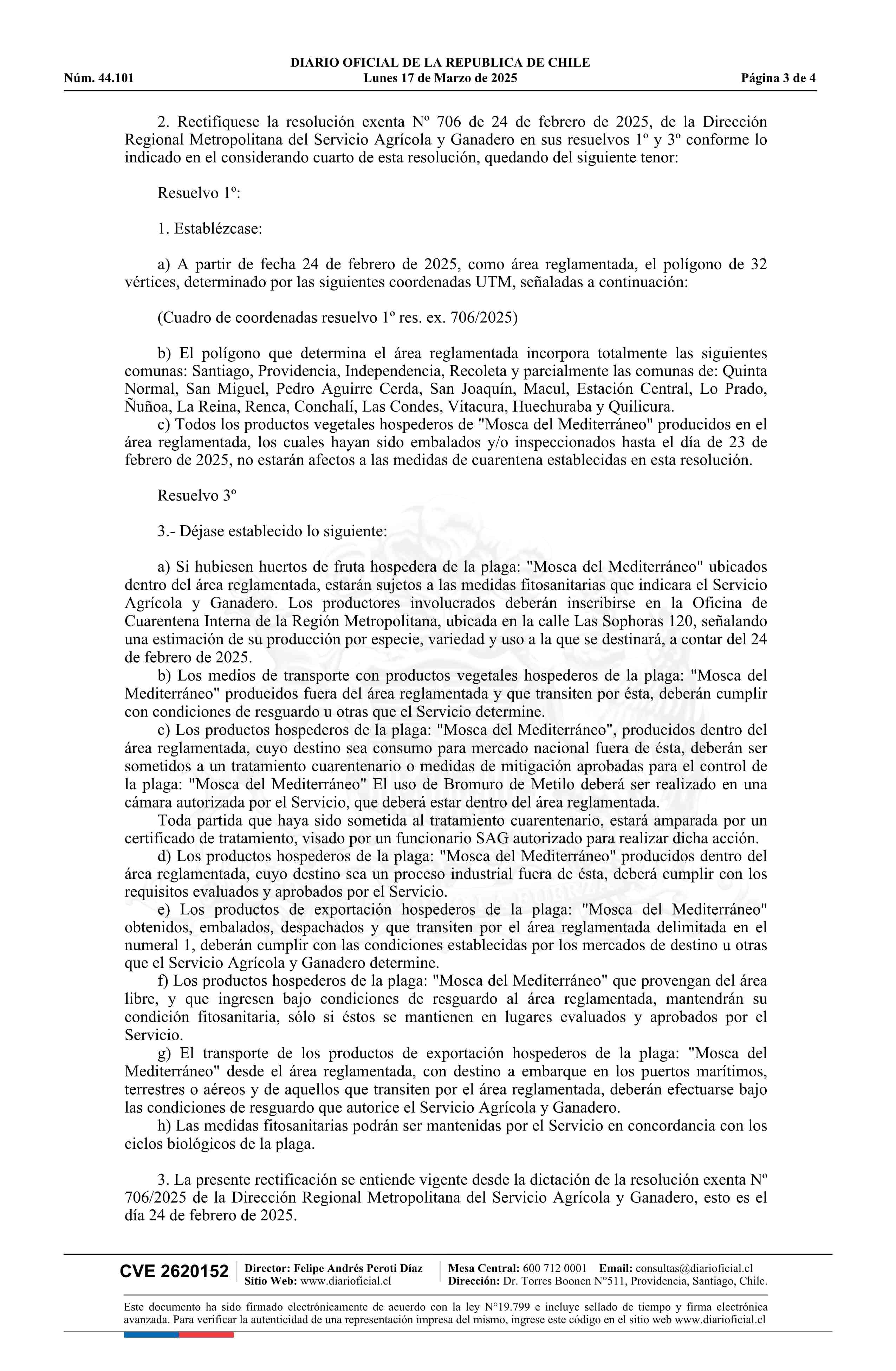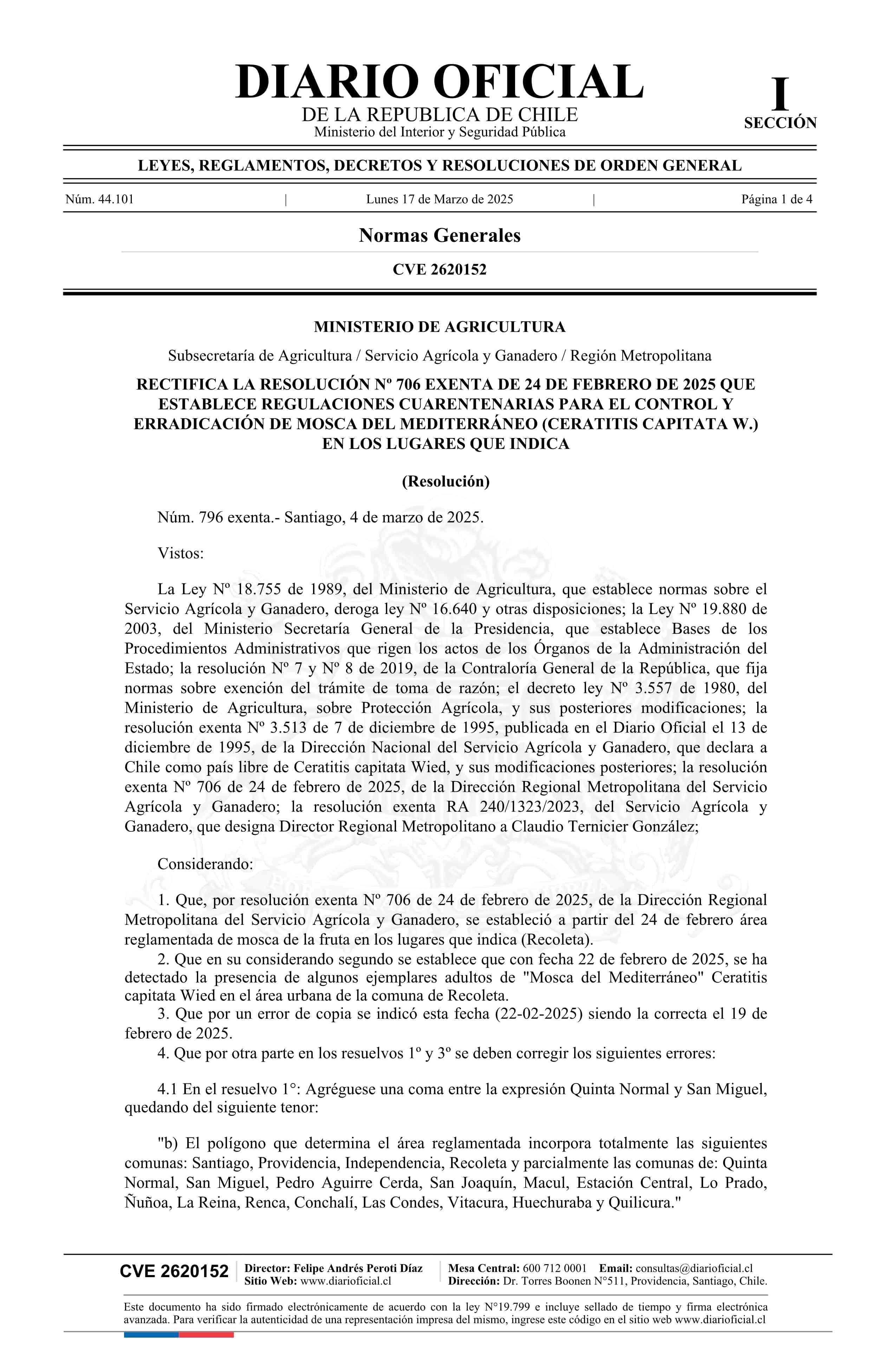 | Título: | Resolución exenta número 796, de 2025.- Rectifica la resolución Nº 706 exenta, de 2025, que establece regulaciones cuarentenarias para el control y erradicación de Mosca del Mediterráneo (Ceratitis capitata W.) en los lugares que indica |