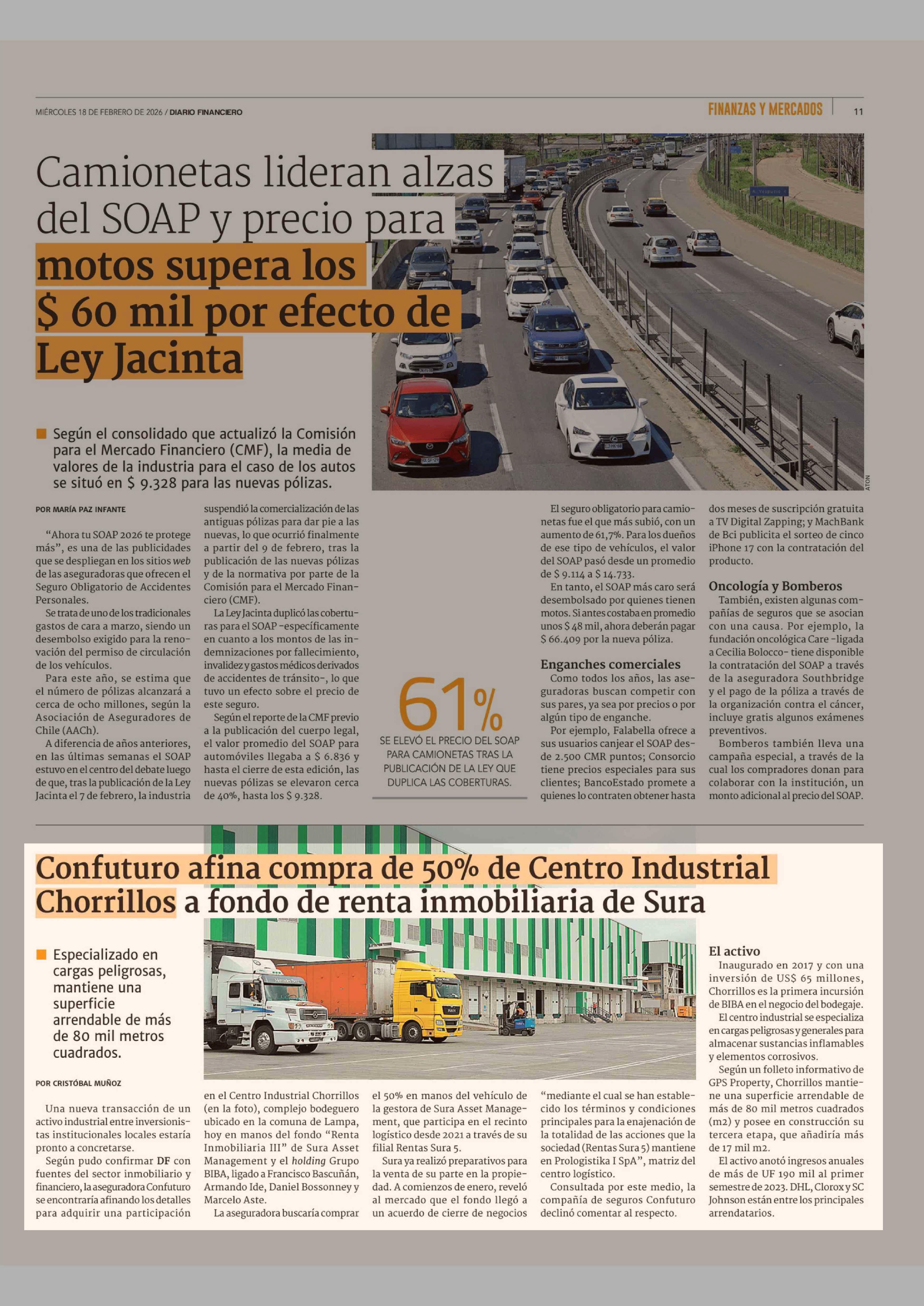Confuturo afina compra de 50% de Centro Industrial Chorrillos a fondo de renta inmobiliaria de Sura 18-02-2026 Diario Financiero |