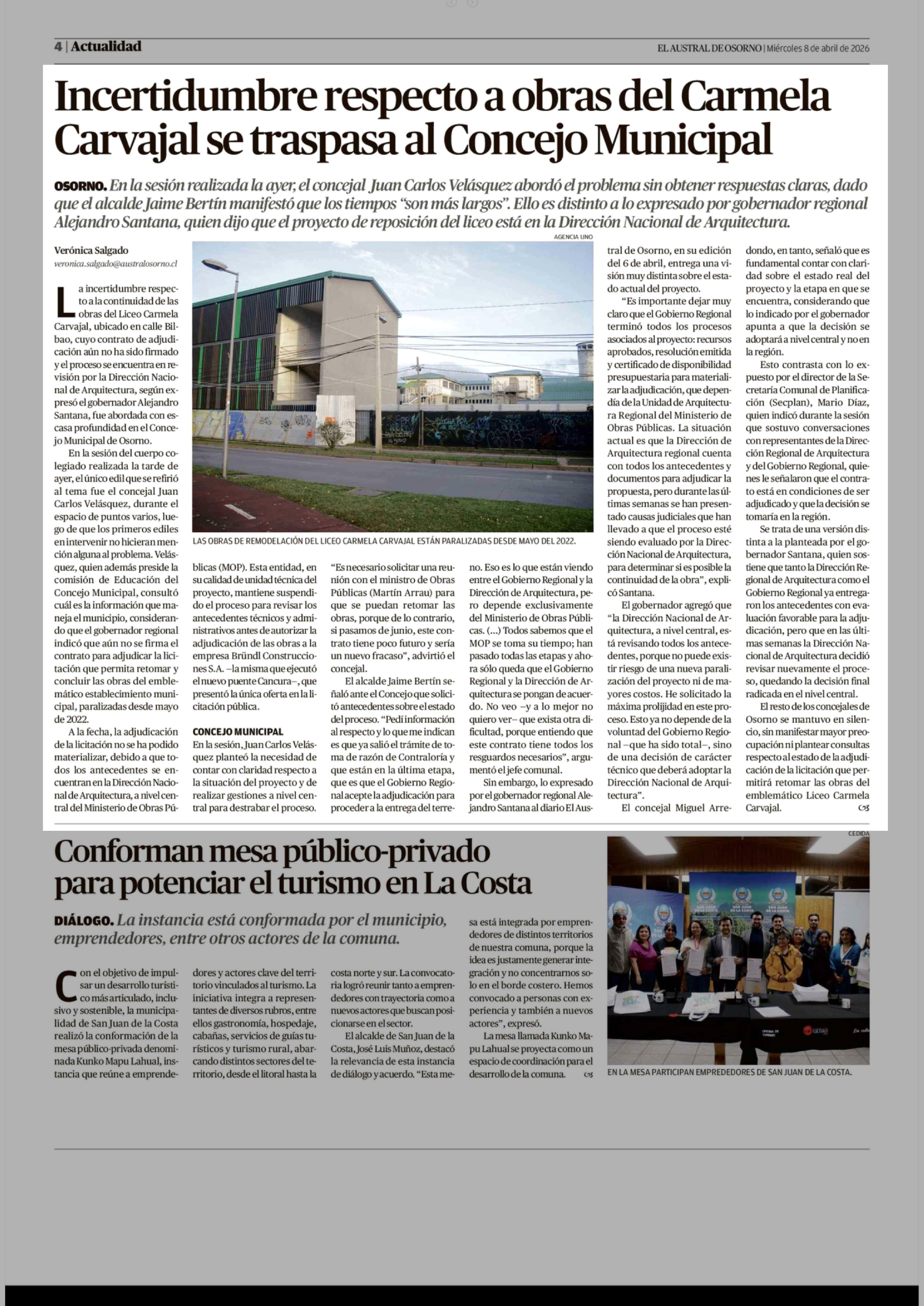 Incertidumbre respecto a obras del Carmela Carvajal se traspasa al Concejo Municipal 08-04-2026 El Austral de Osorno |