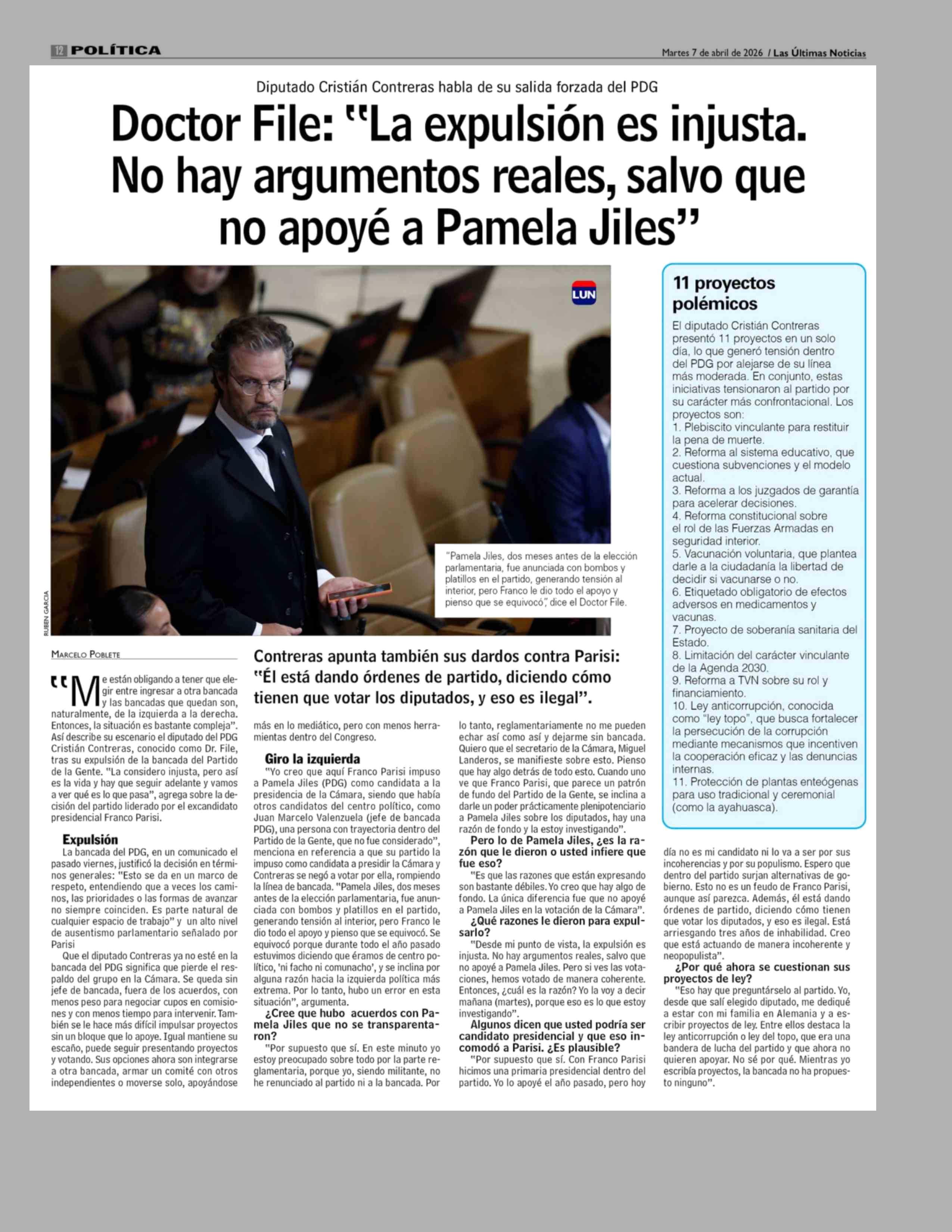Título: Doctor File: "La expulsión es injusta. No hay argumentos reales, salvo que no apoye a Pamela Jiles"