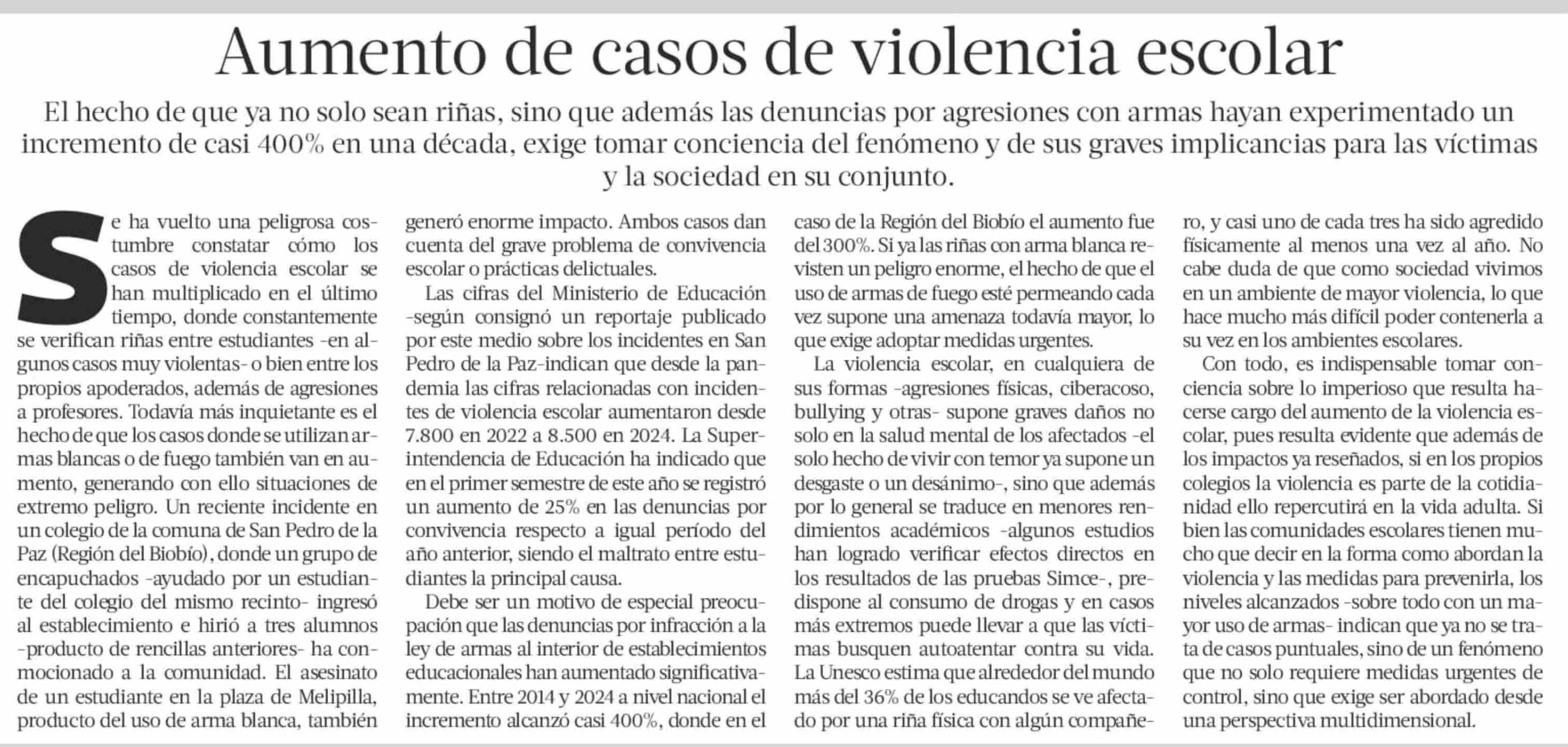 Editorial: Aumento de casos de violencia escolar 10-06-2025 La Tercera |