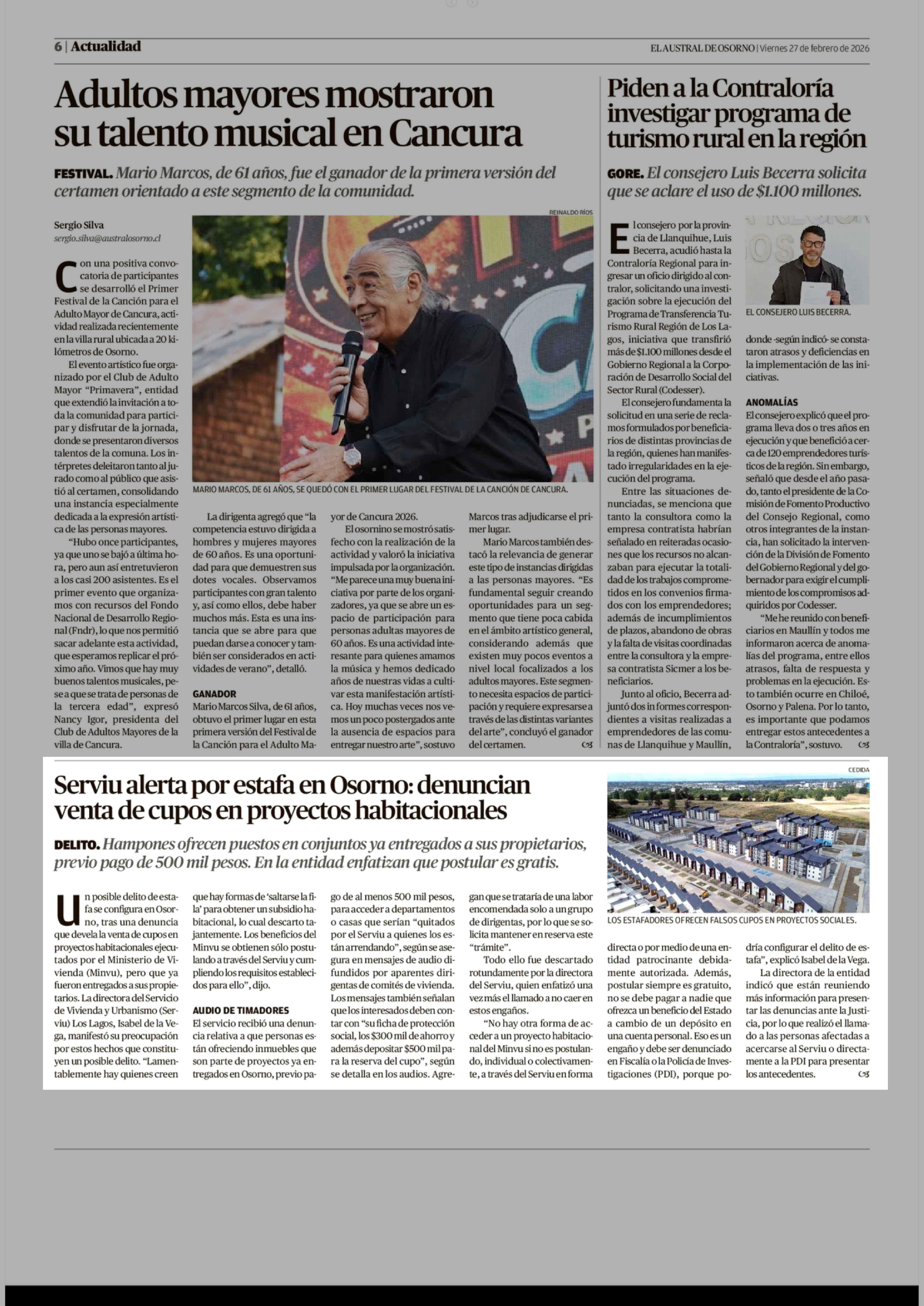 Serviu alerta por estafa en Osorno: denuncian venta de cupos en proyectos habitacionales 27-02-2026 El Austral de Osorno |