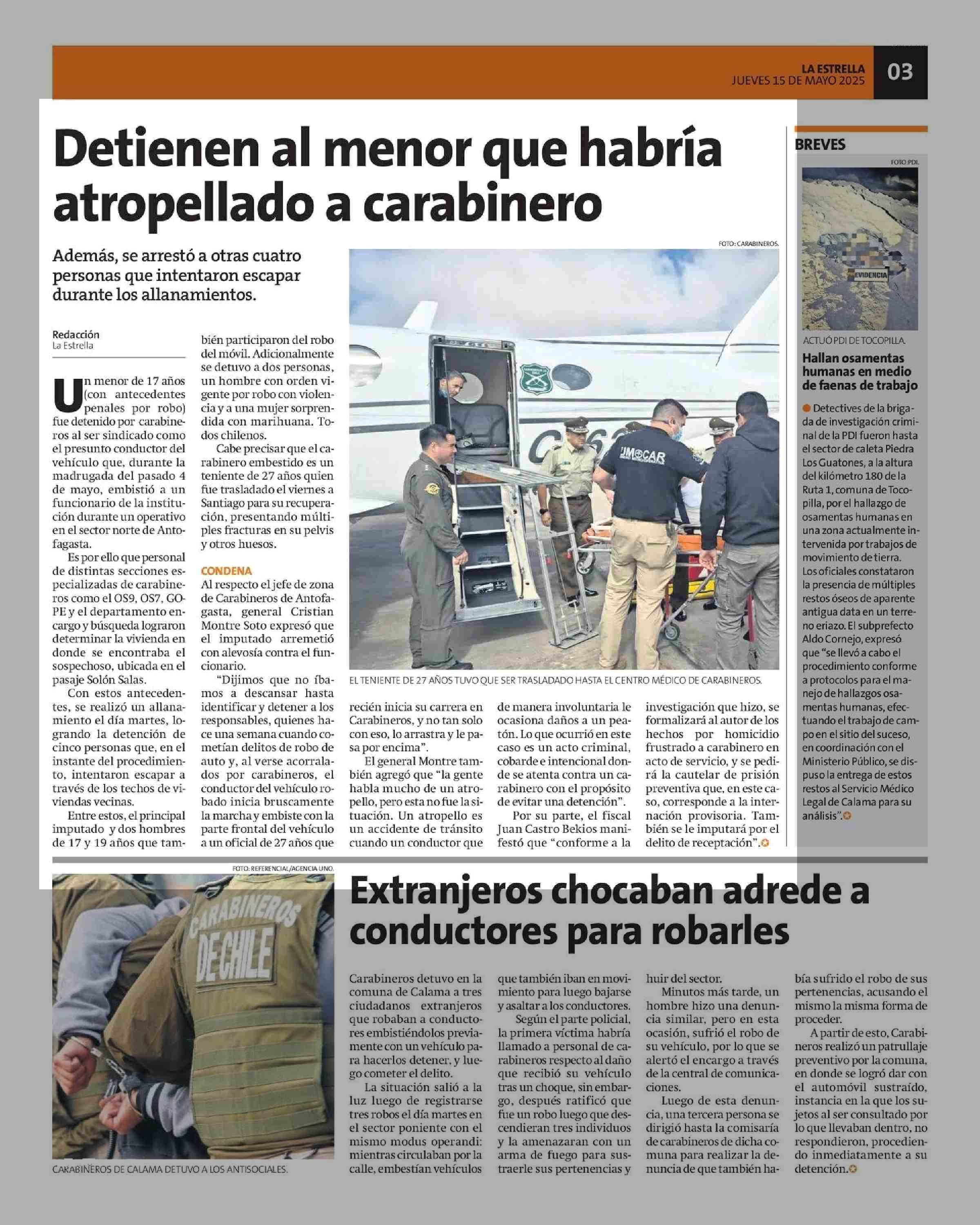 Detienen al menor que habria atropellado a carabinero 15-05-2025 La Estrella de Antofagasta |