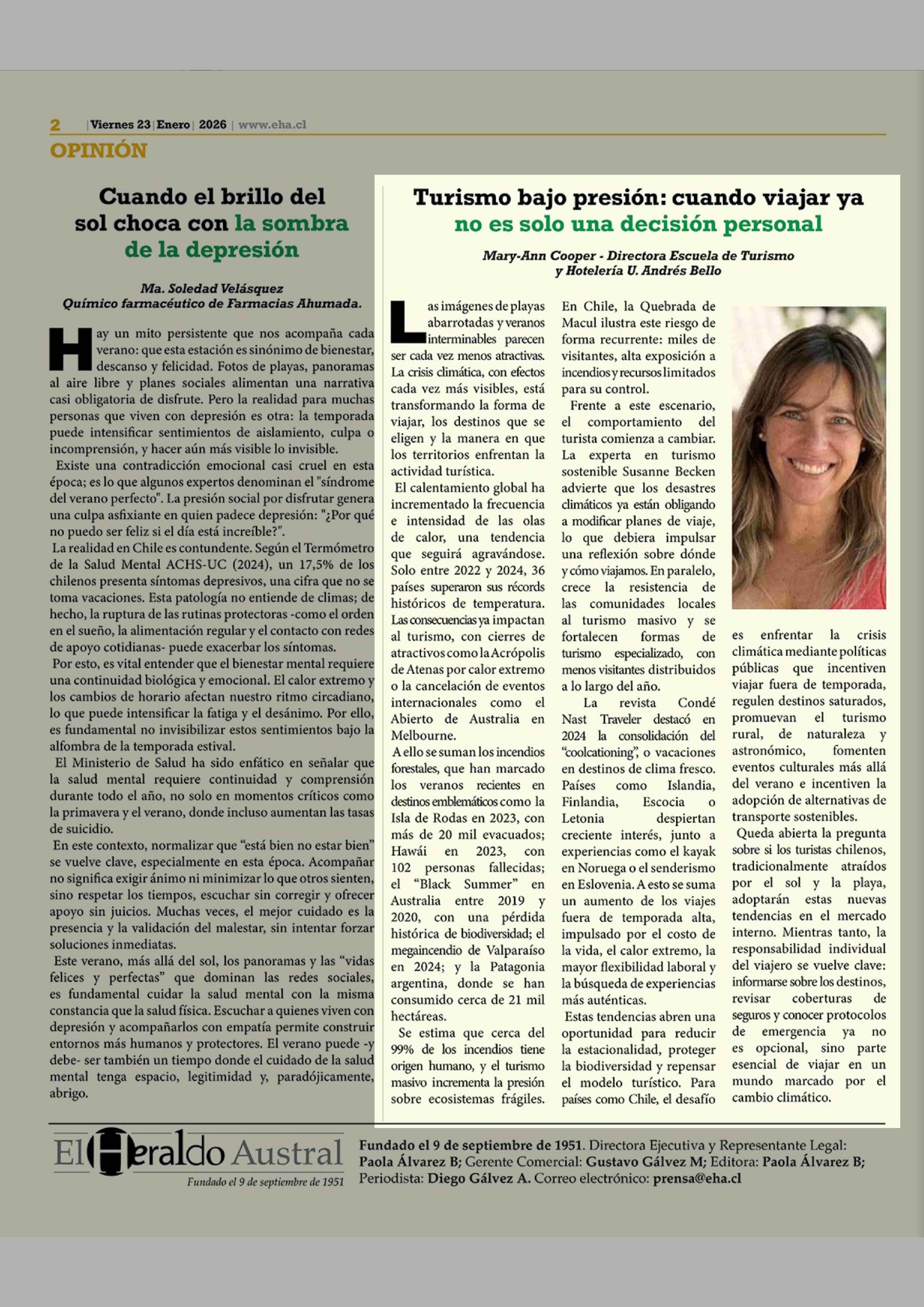 Columnas de Opinión: Turismo bajo presión: cuando viajar ya no es solo una decisión personal 23-01-2026 El Heraldo Austral |