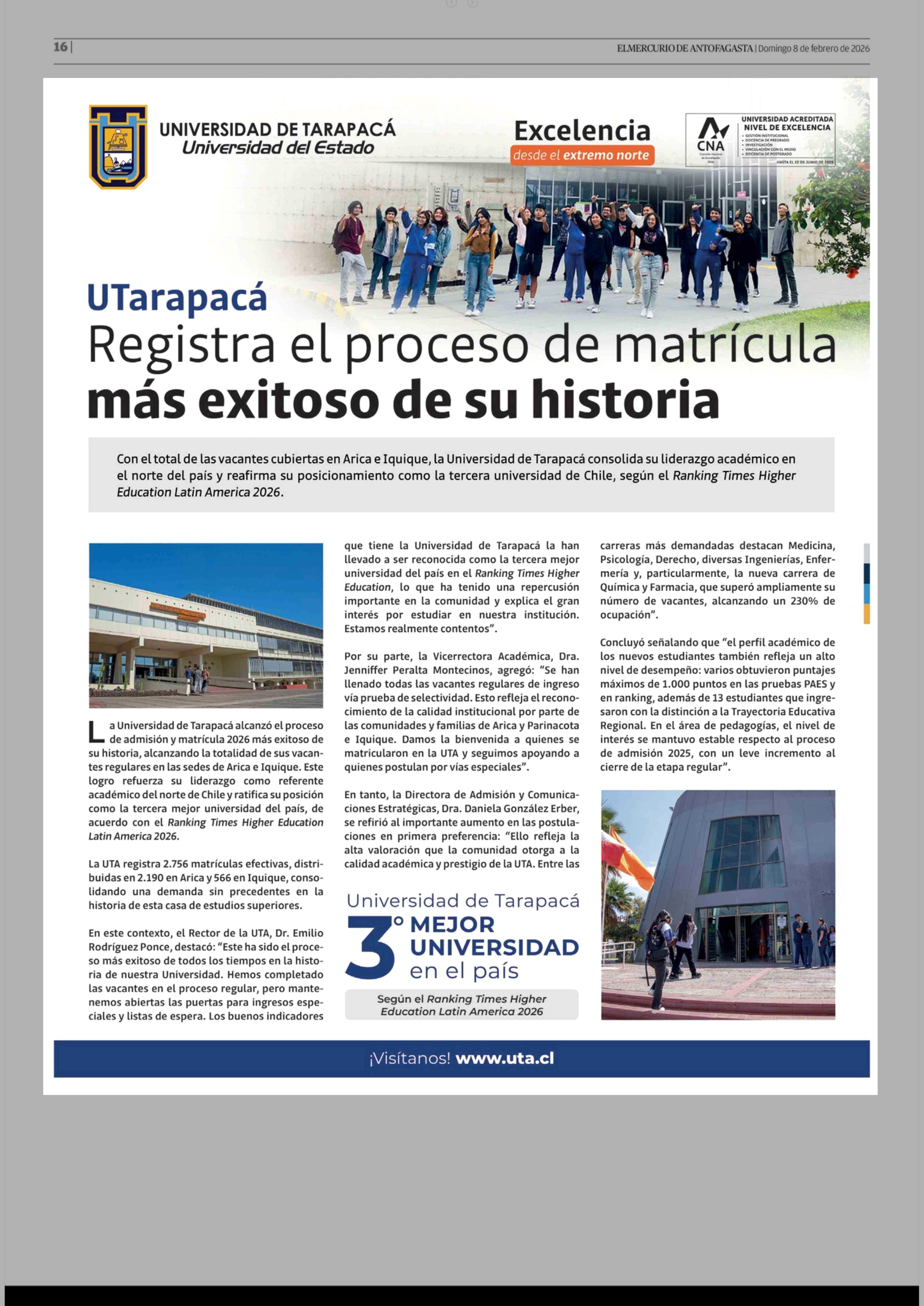UTarapacá Registra el proceso de matrícula más exitoso de su historia 08-02-2026 El Mercurio de Antofagasta |