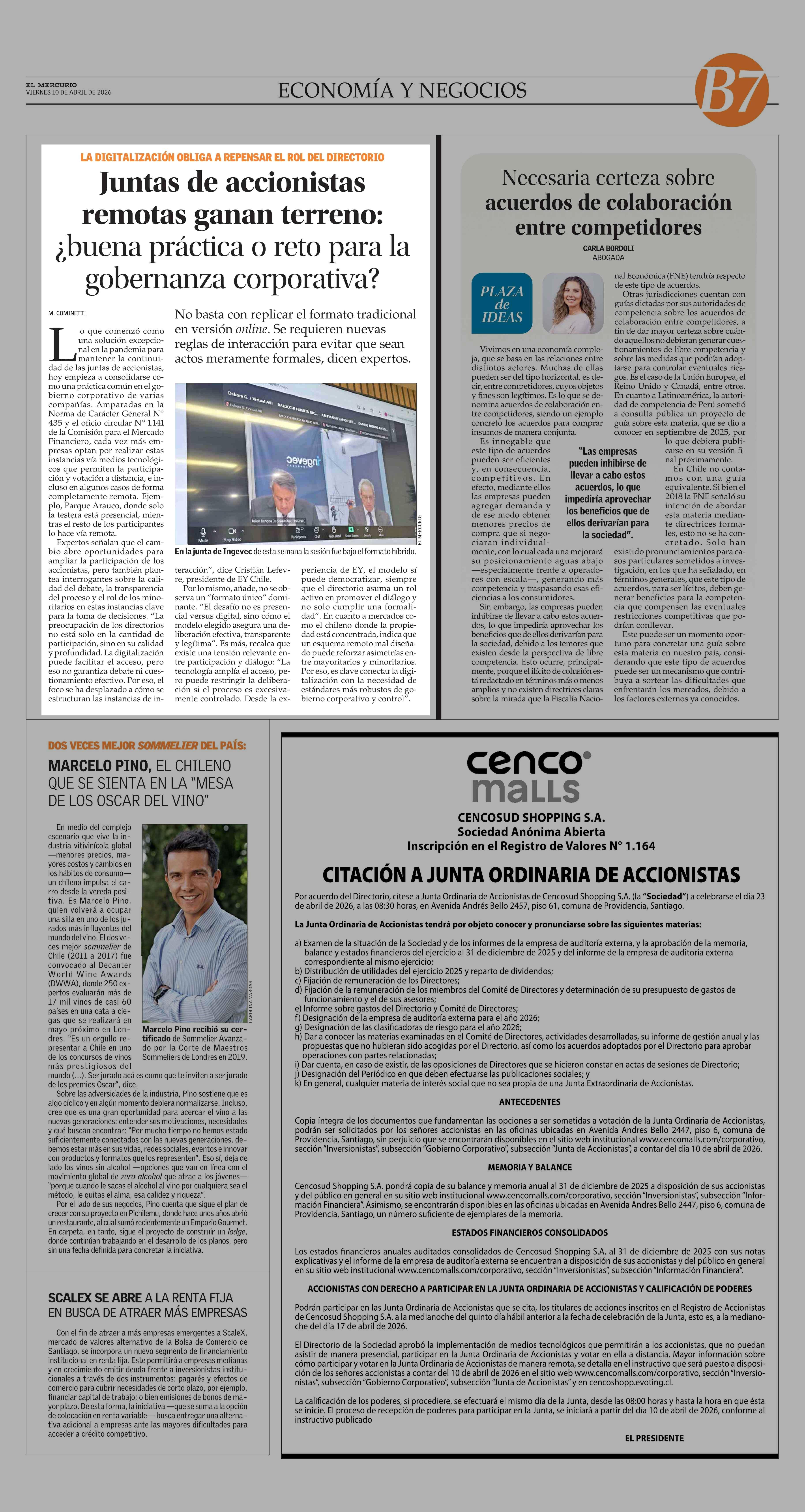 Juntas de accionistas remotas ganan terreno: ¿buena práctica o reto para la gobernanza corporativa? 10-04-2026 El Mercurio |