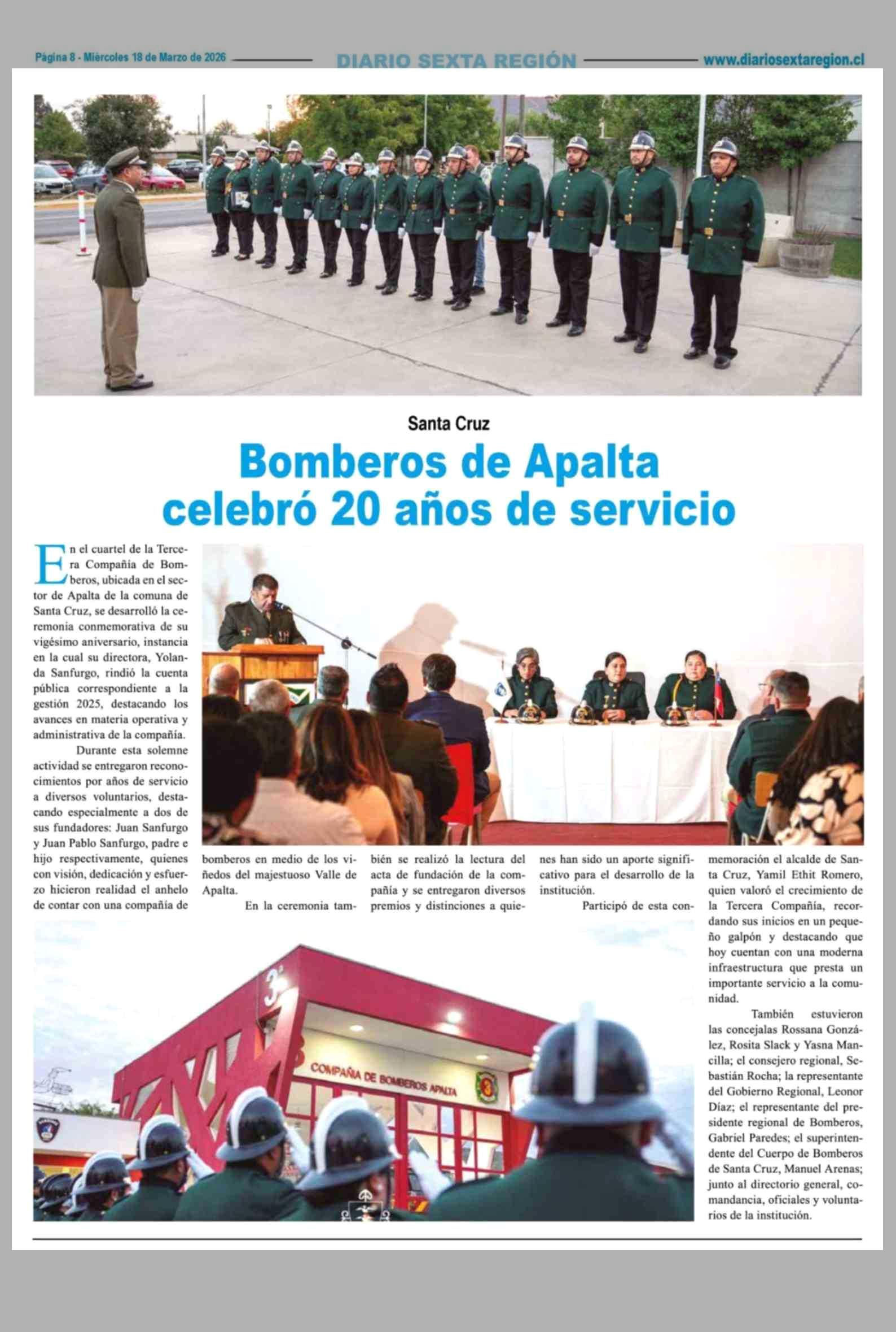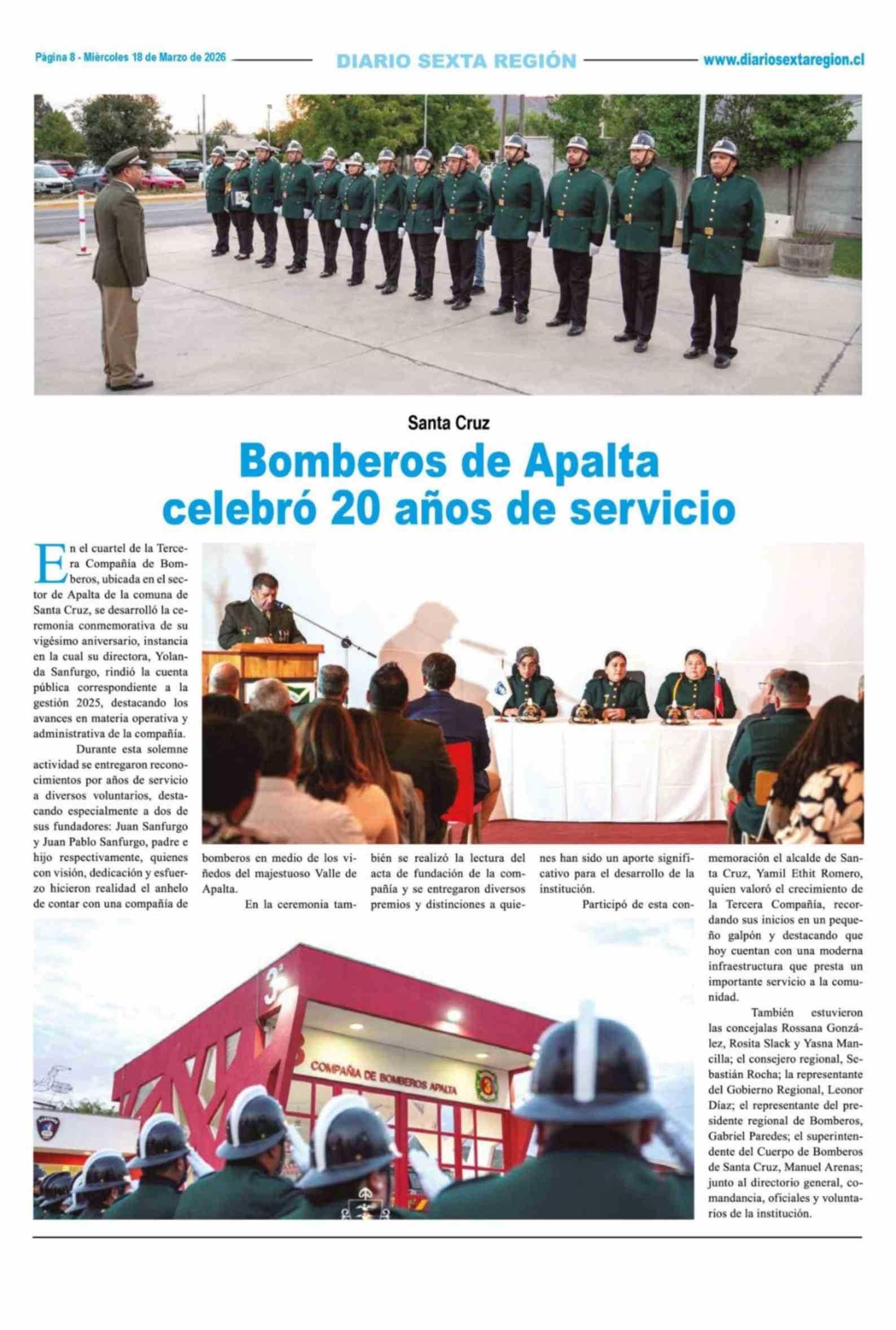 Bomberos de Apalta celebró 20 años de servicio 18-03-2026 Diario VI Región |