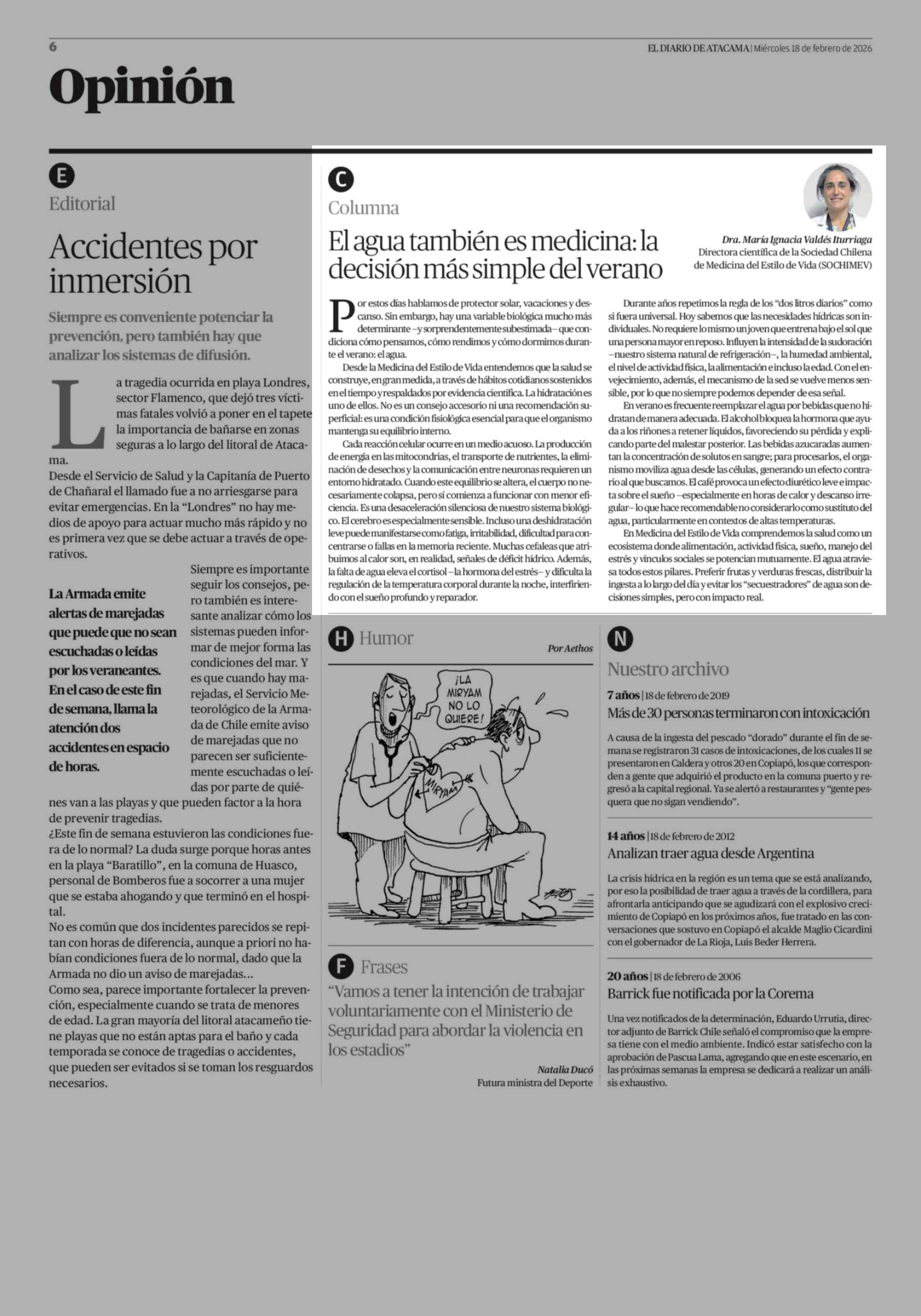 Columnas de Opinión: El agua también es medicina: la decisión más simple del verano 18-02-2026 El Diario de Atacama |