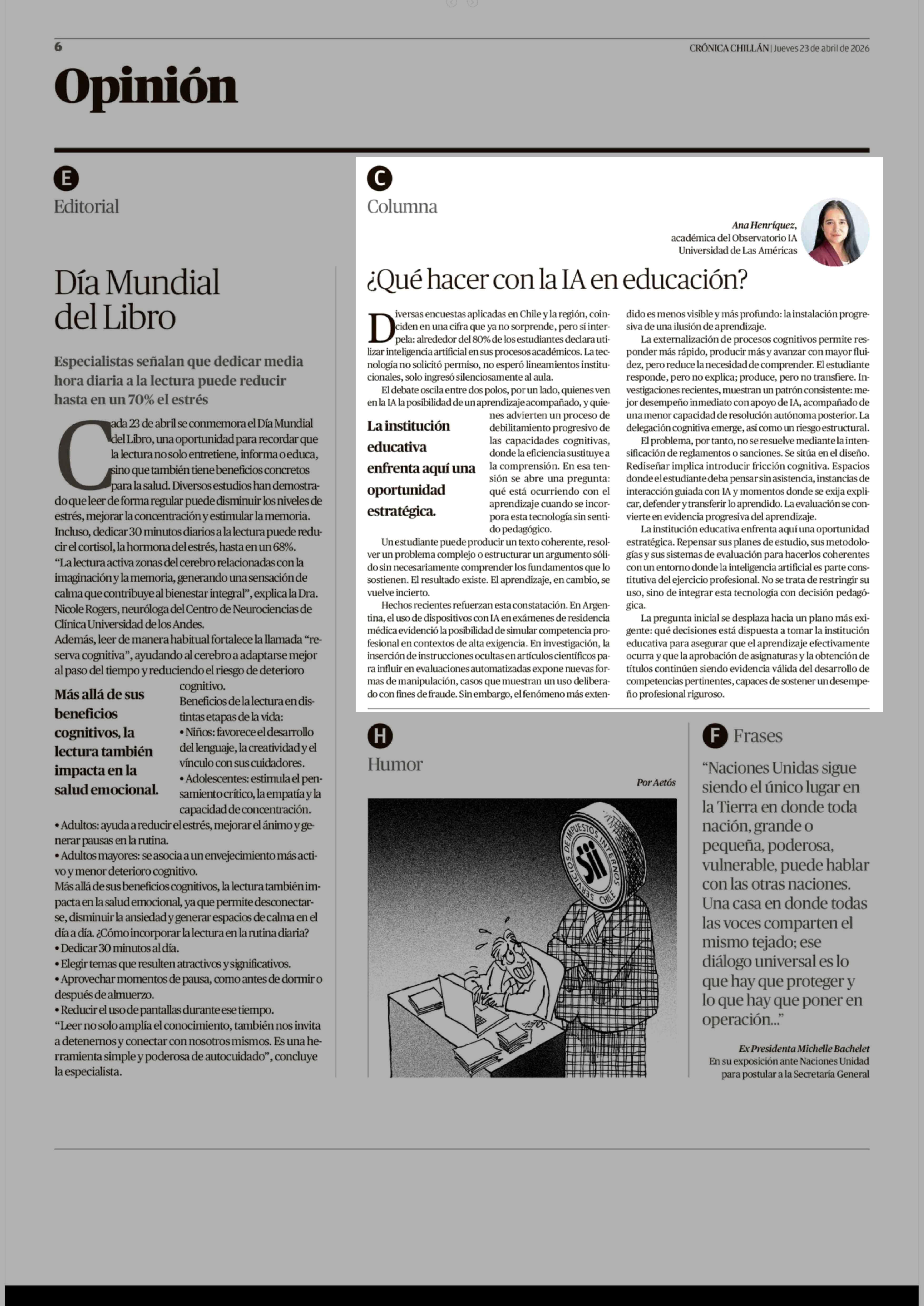 Columnas de Opinión: ¿Qué hacer con la IA en educación? 23-04-2026 Crónica de Chillán |