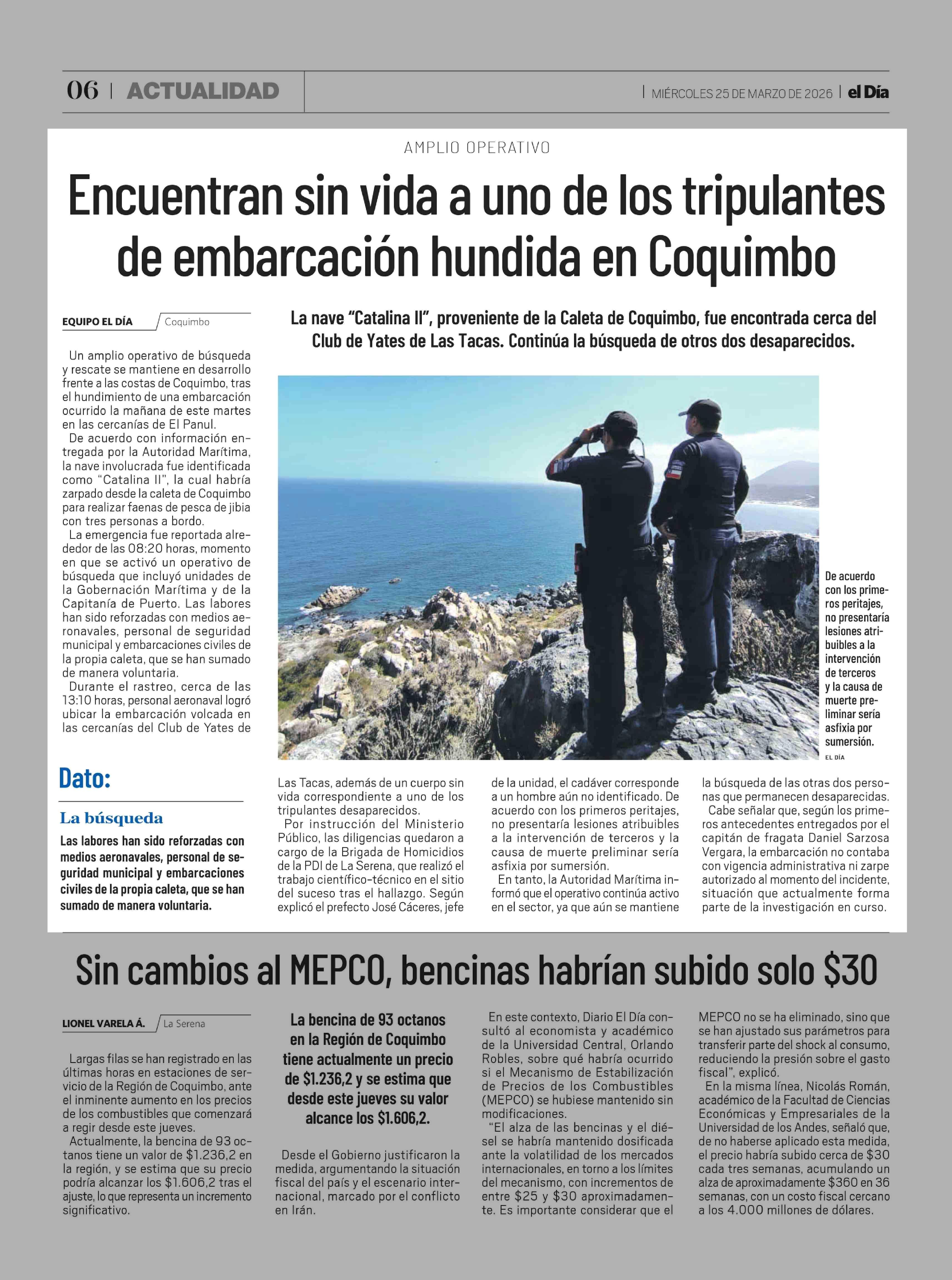 Encuentran sin vida a uno de los tripulantes de embarcación hundida en Coquimbo 25-03-2026 El Día |