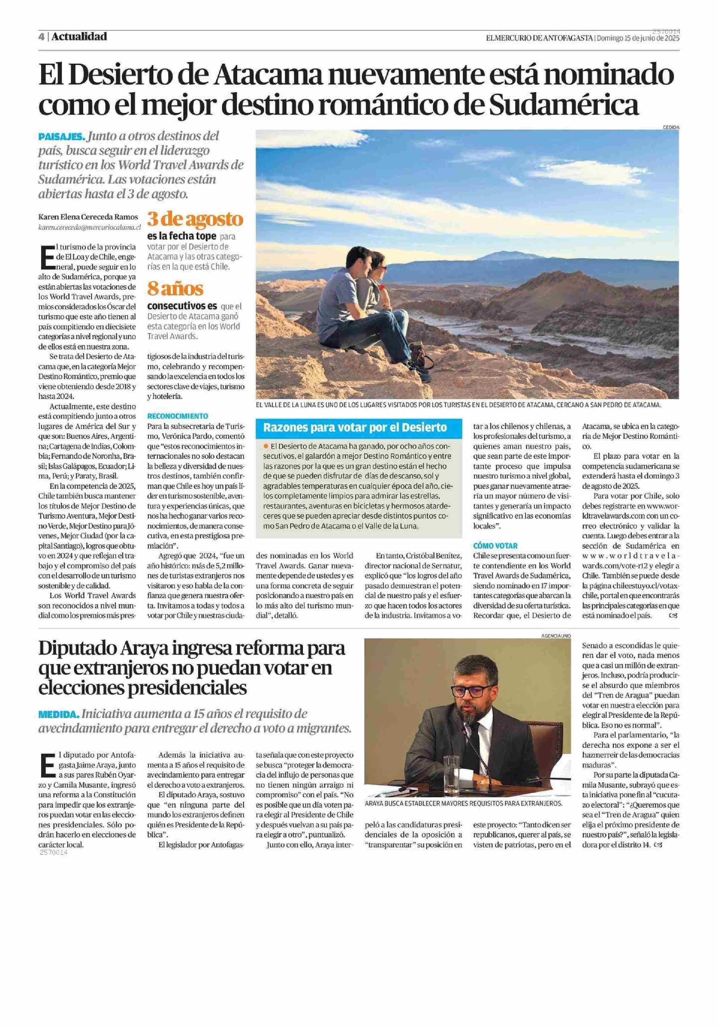 Diputado Araya ingresa reforma para que extranjeros no puedan votar en elecciones presidenciales 15-06-2025 El Mercurio de Antofagasta |