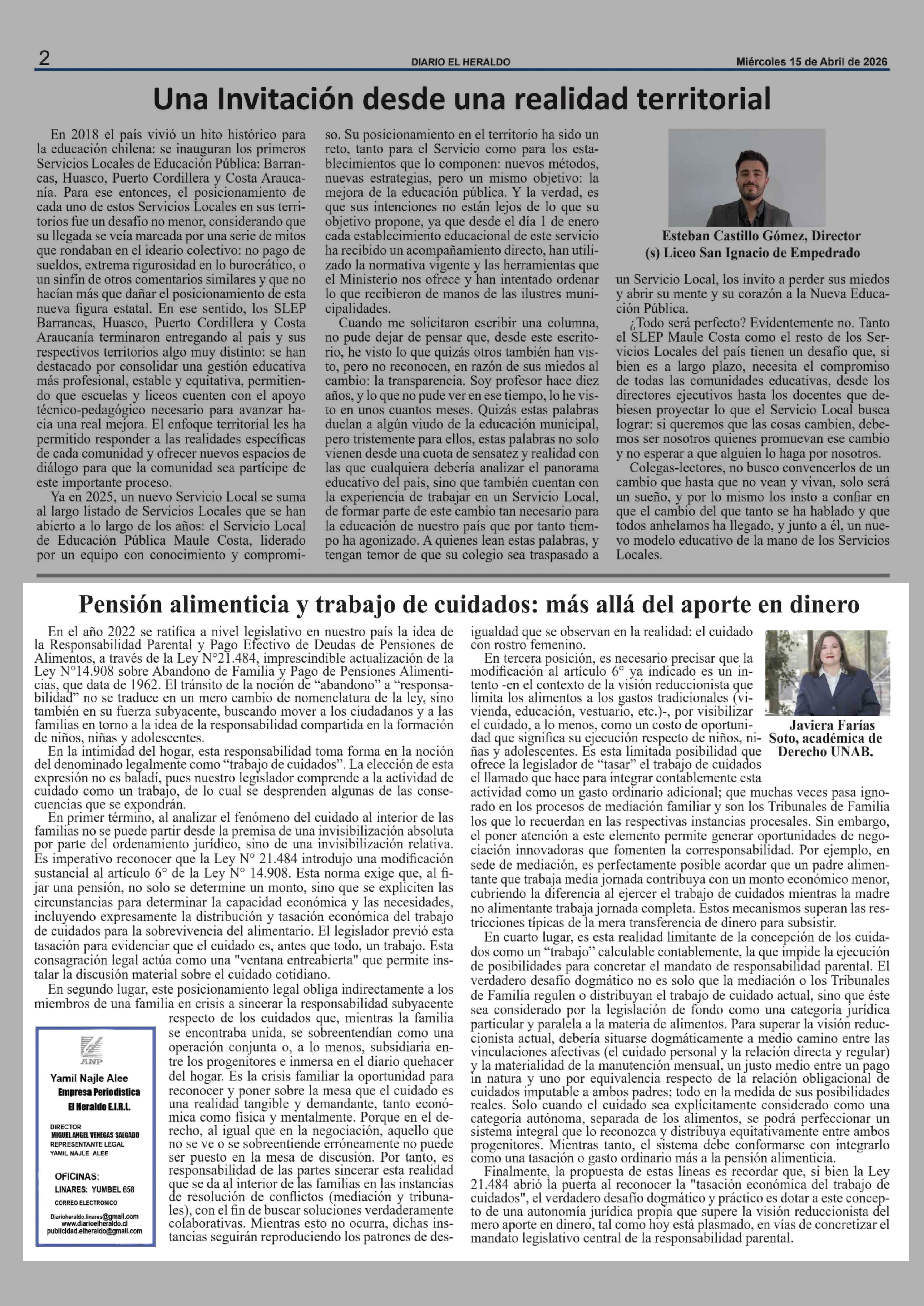 Columnas de Opinión: Pensión alimenticia y trabajo de cuidados: más allá del aporte en dinero 15-04-2026 El Heraldo |