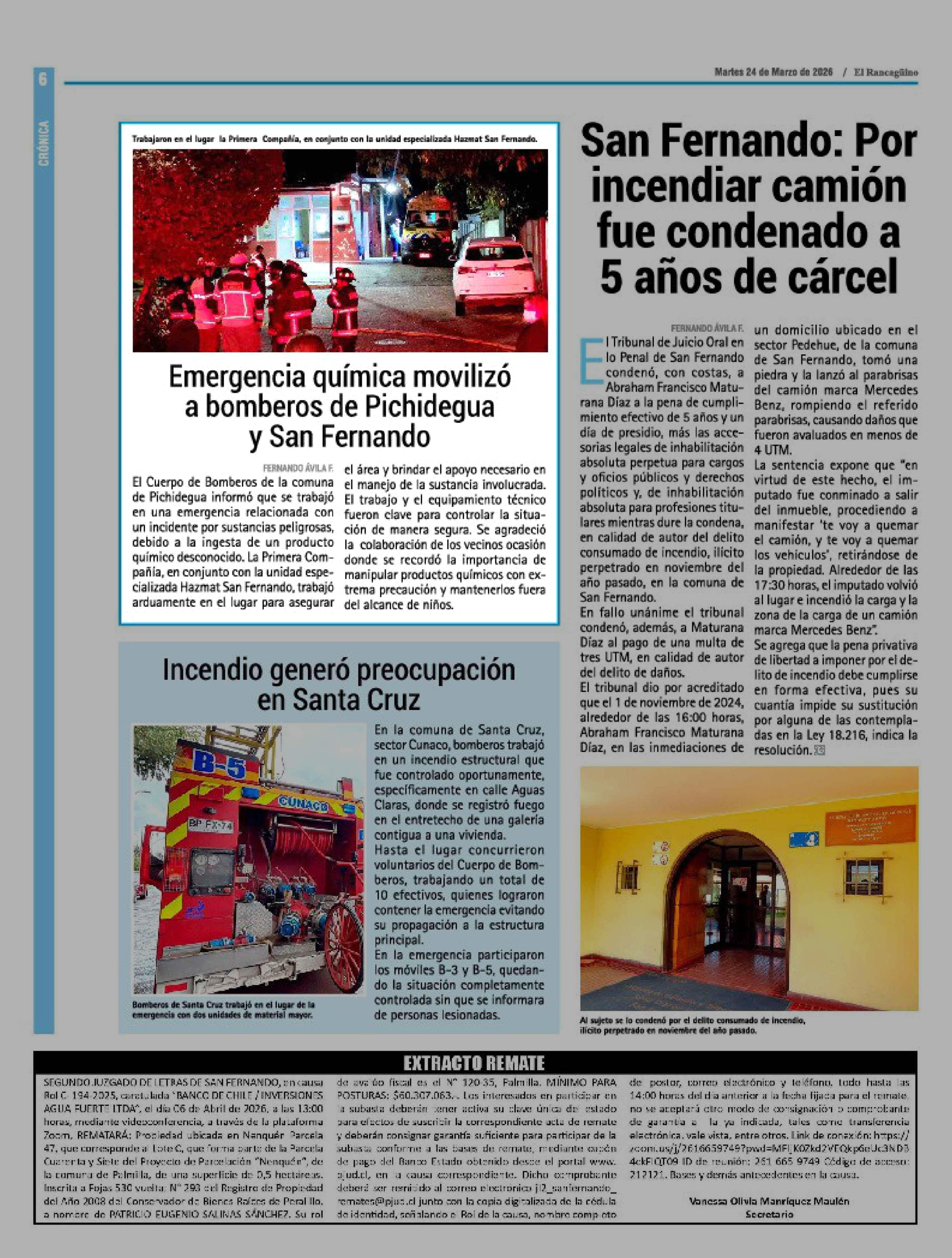 Emergencia química movilizó a bomberos de Pichidegua y San Fernando 24-03-2026 El Rancagüino |