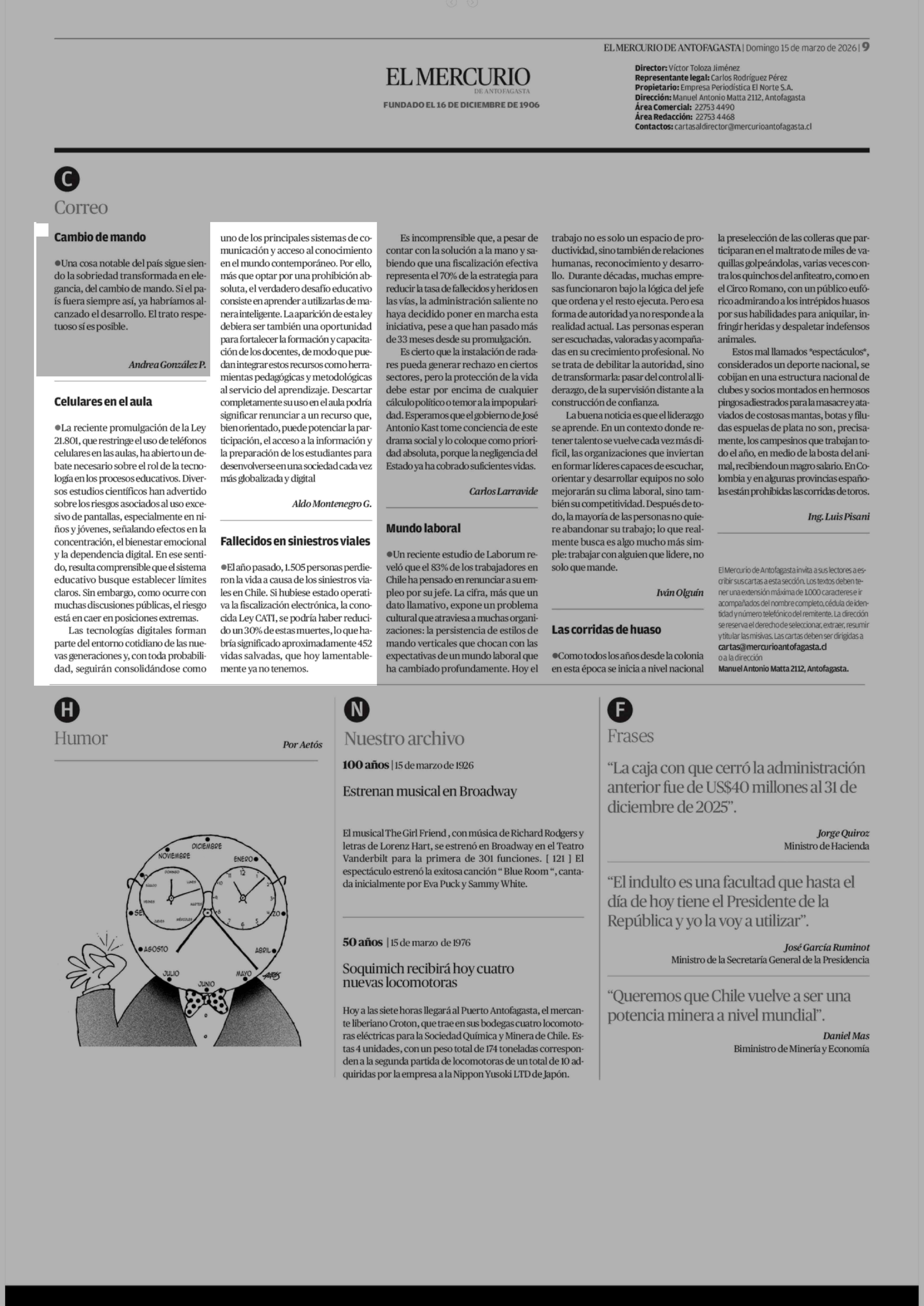 CARTAS: Celulares en el aula 15-03-2026 El Mercurio de Antofagasta |