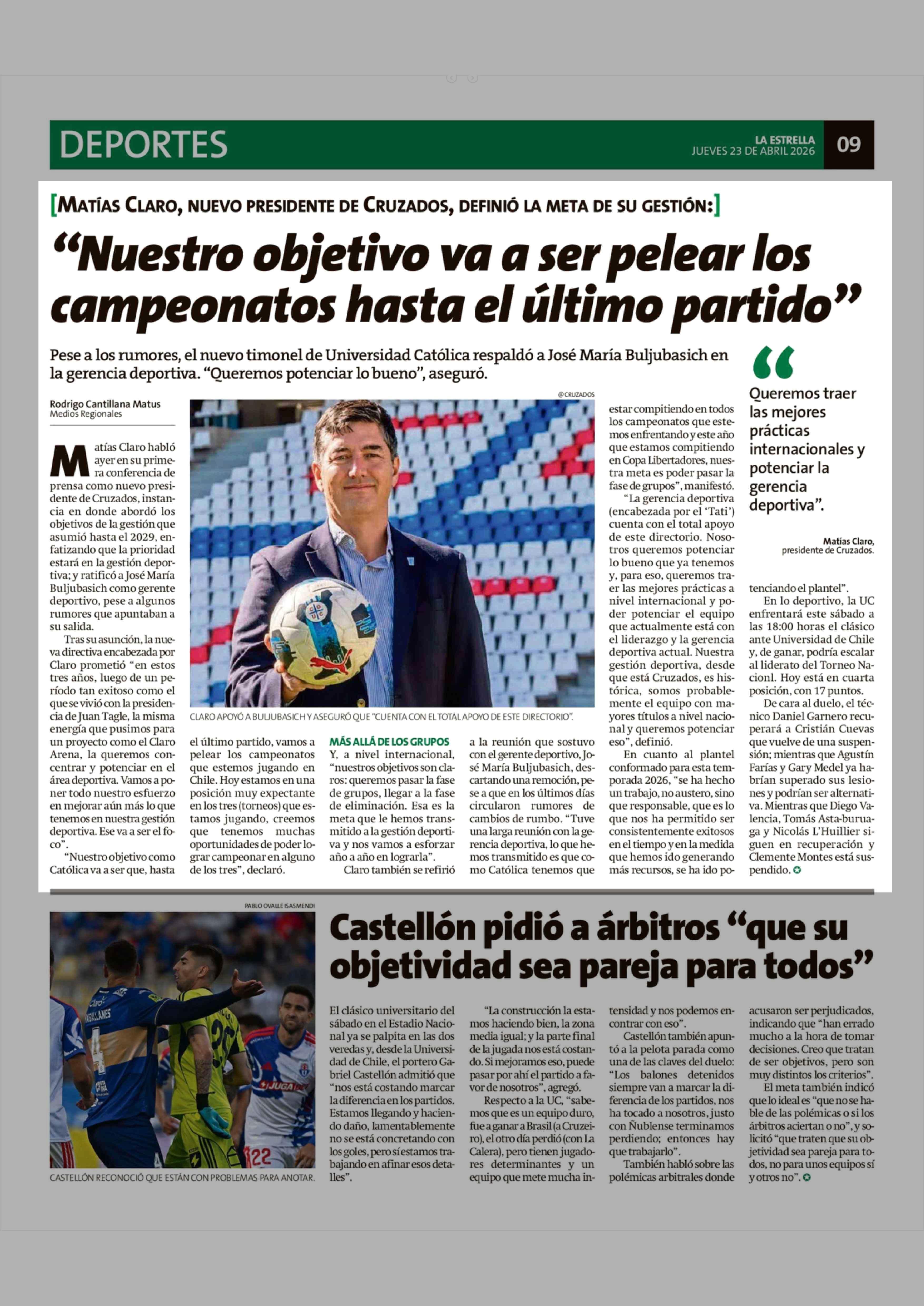 "Nuestro objetivo va a ser pelear los campeonatos hasta el último partido" 23-04-2026 La Estrella de Chiloé |