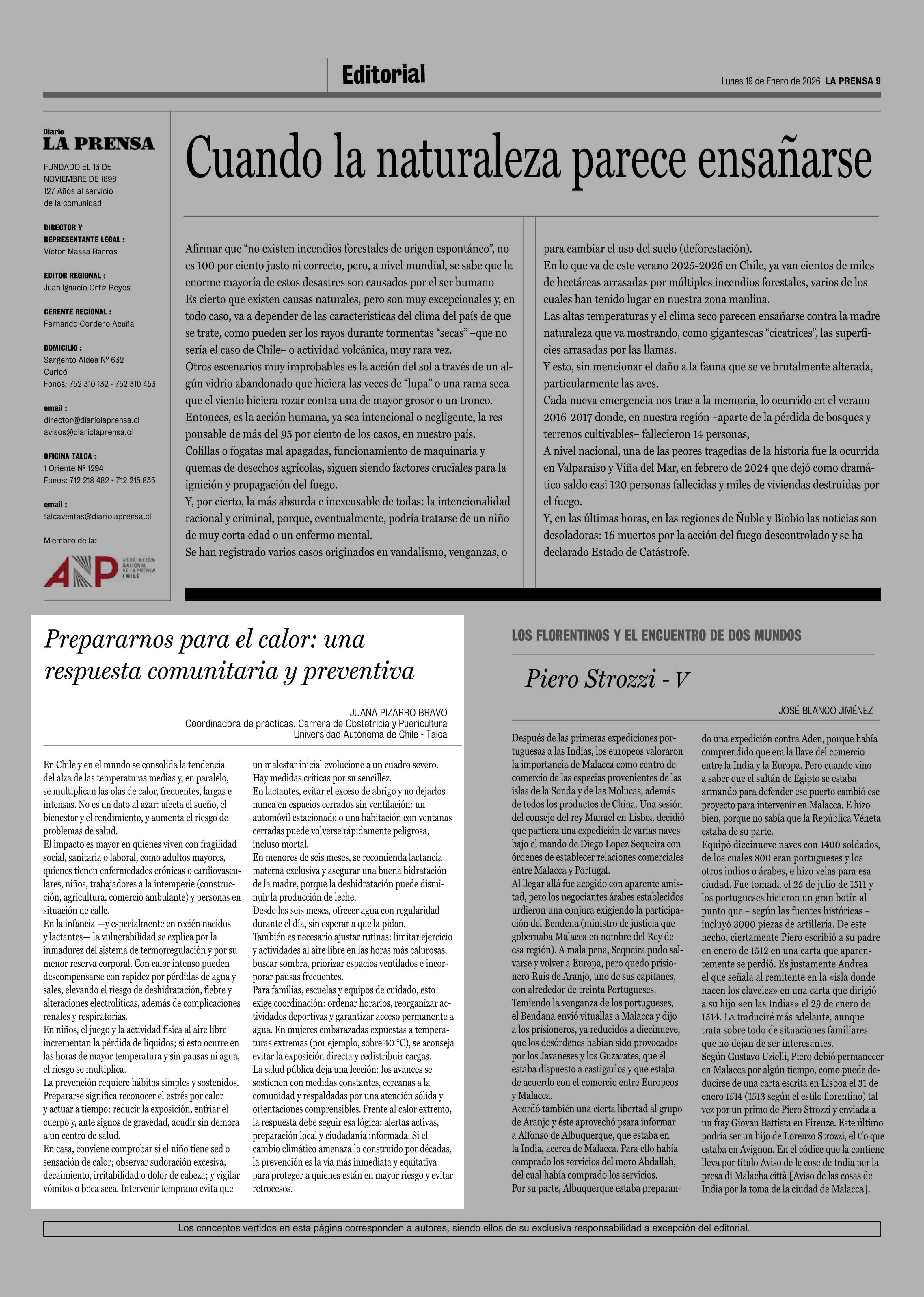 Cartas: Prepararnos para el calor: una respuesta comunitaria y preventiva 19-01-2026 La Prensa de Curicó |