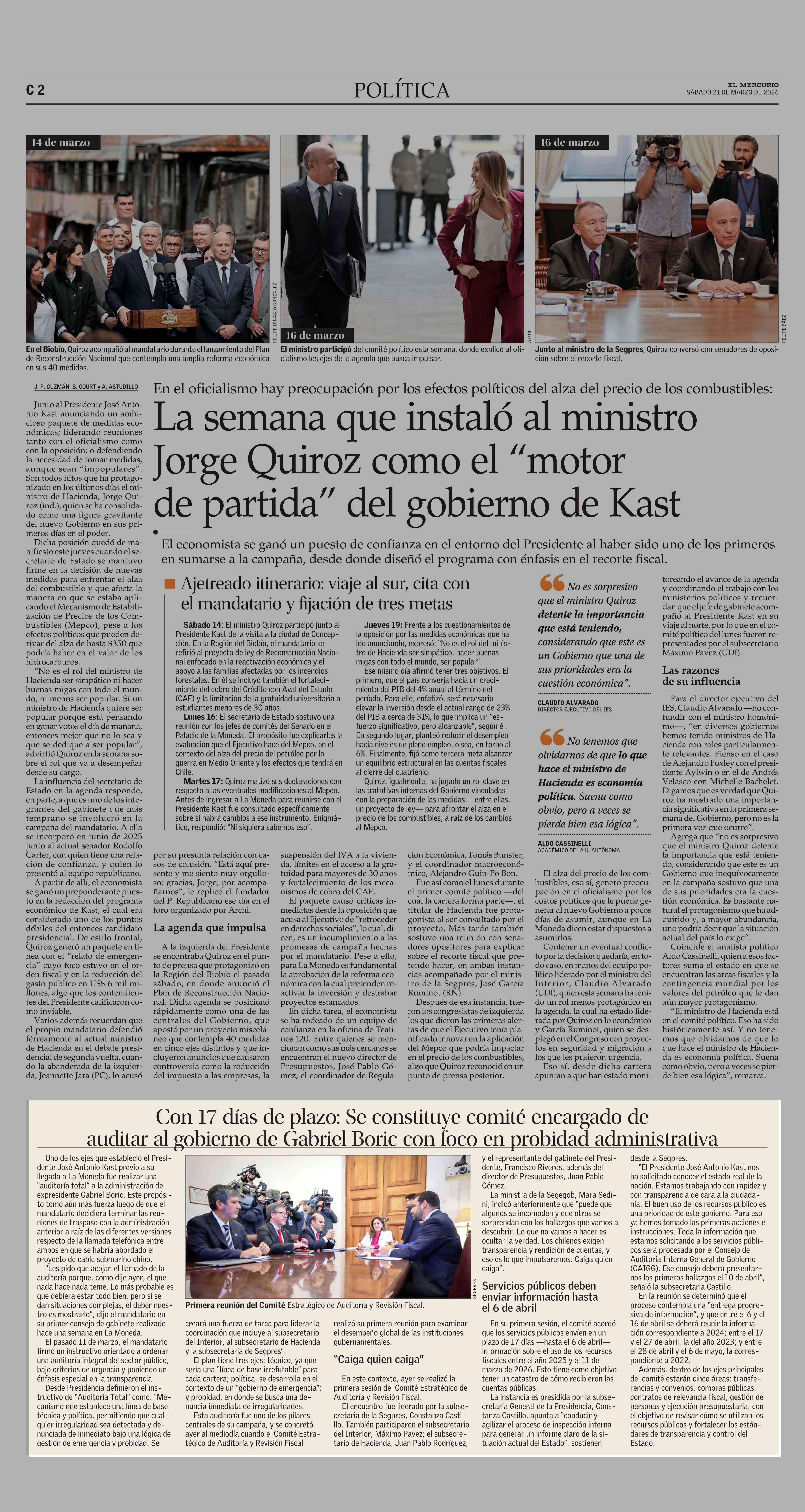 Con 17 días de plazo: Se constituye comité encargado de auditar al gobierno de Gabriel Boric con foco en probidad administrativa 21-03-2026 El Mercurio |