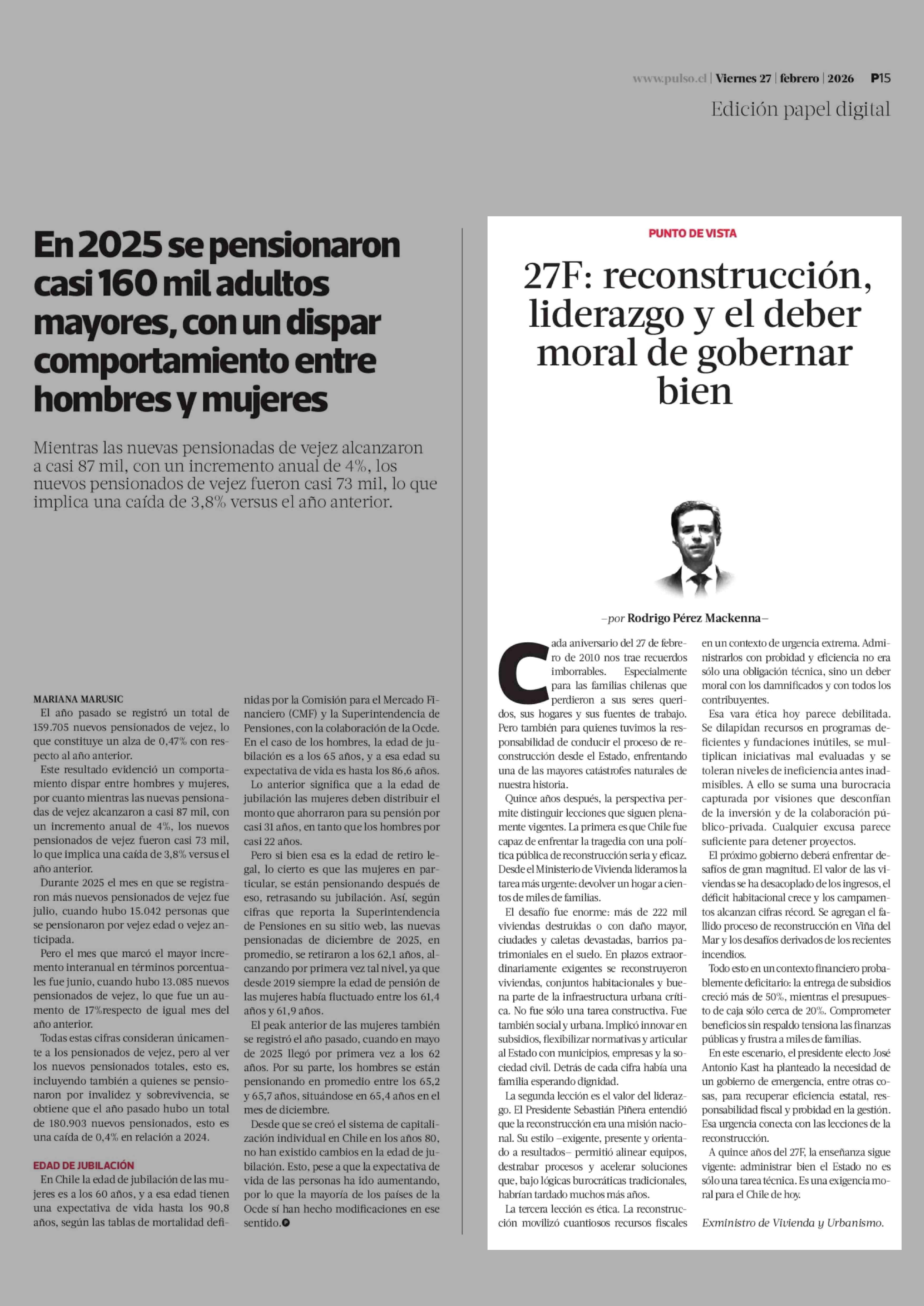 Columnas de Opinión: 27F: reconstrucción, liderazgo y el deber moral de gobernar bien 27-02-2026 La Tercera |