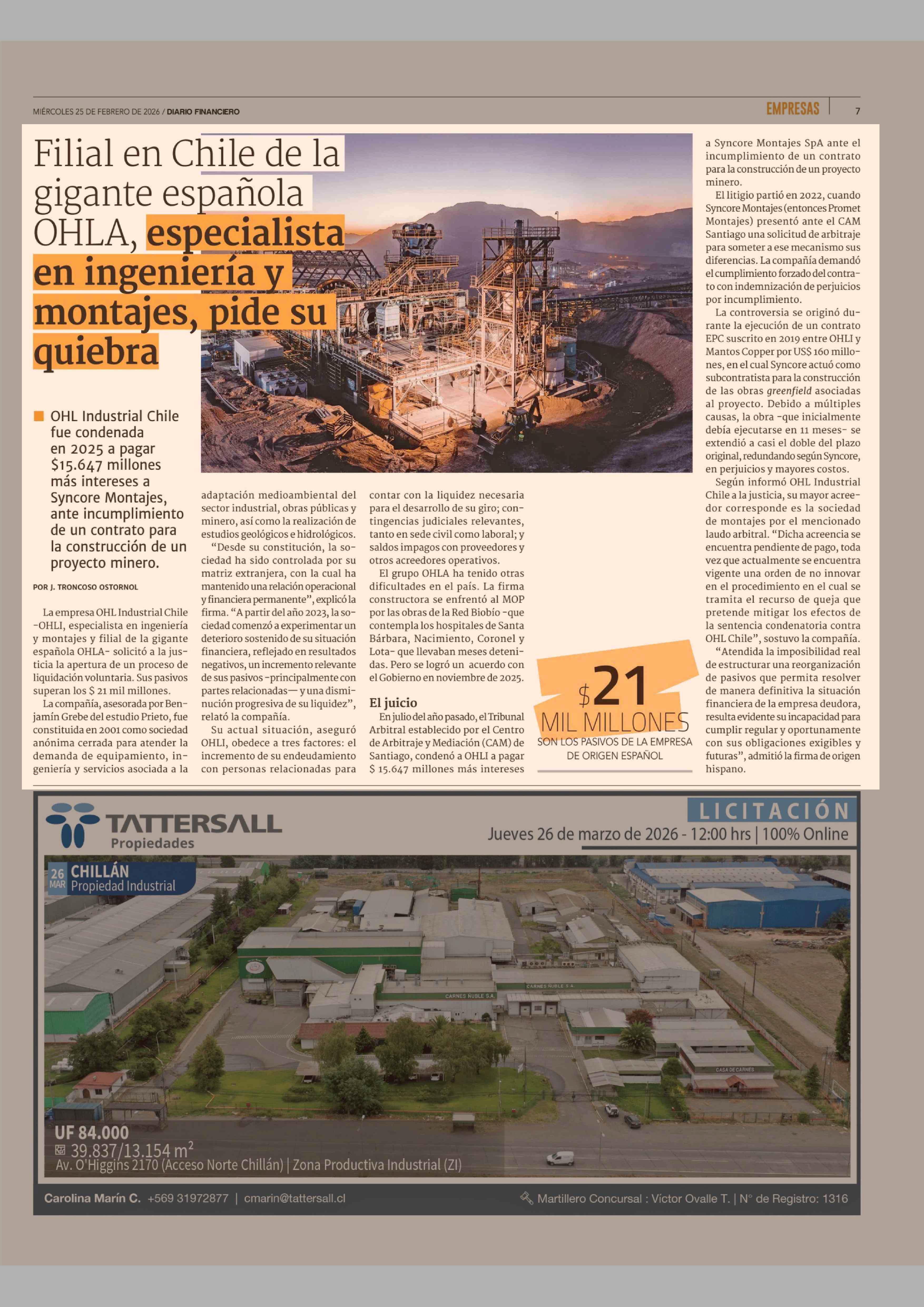 Filial en Chile de la gigante española OHLA, especialista en ingeniería y montajes, pide su quiebra 25-02-2026 Diario Financiero |