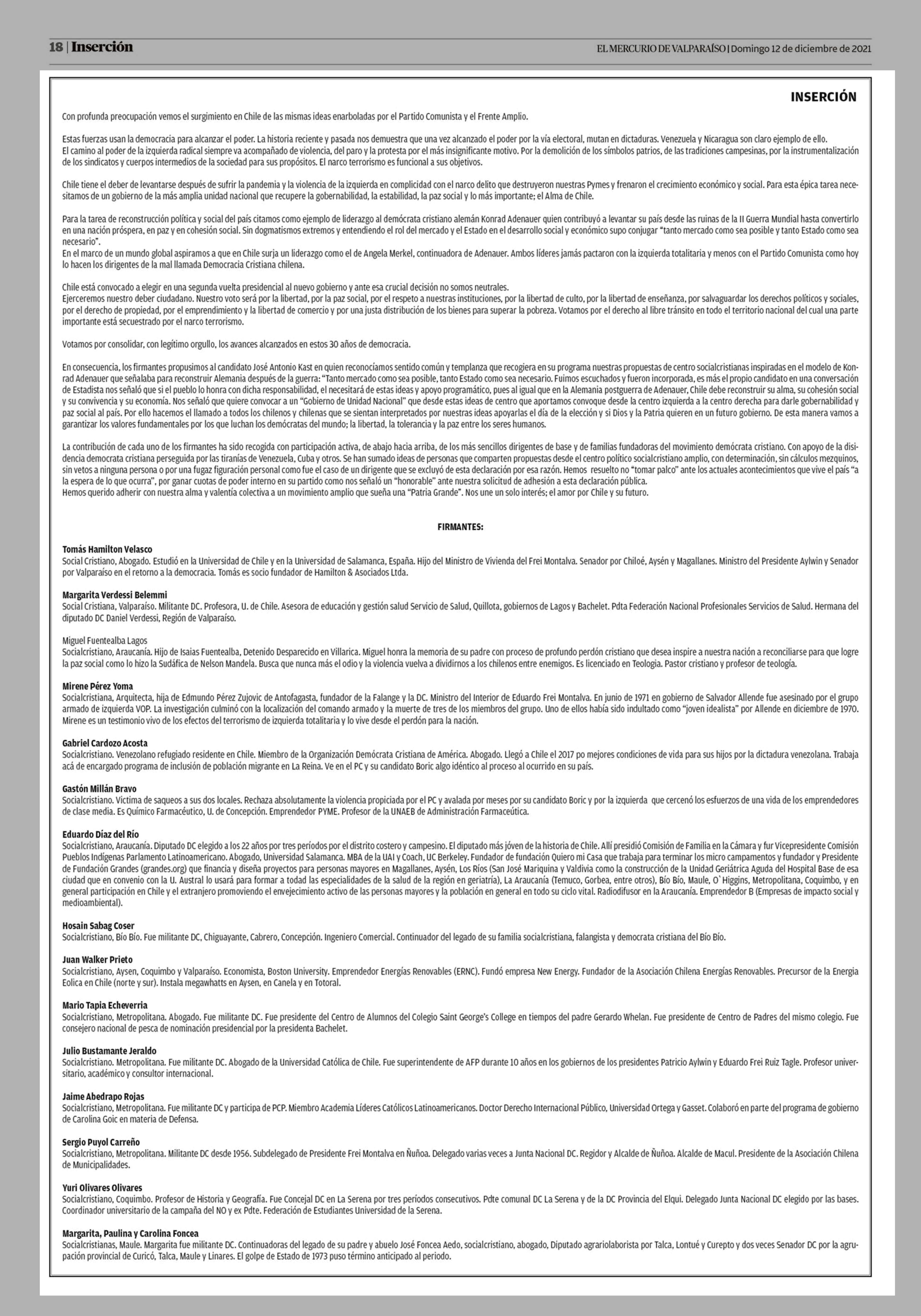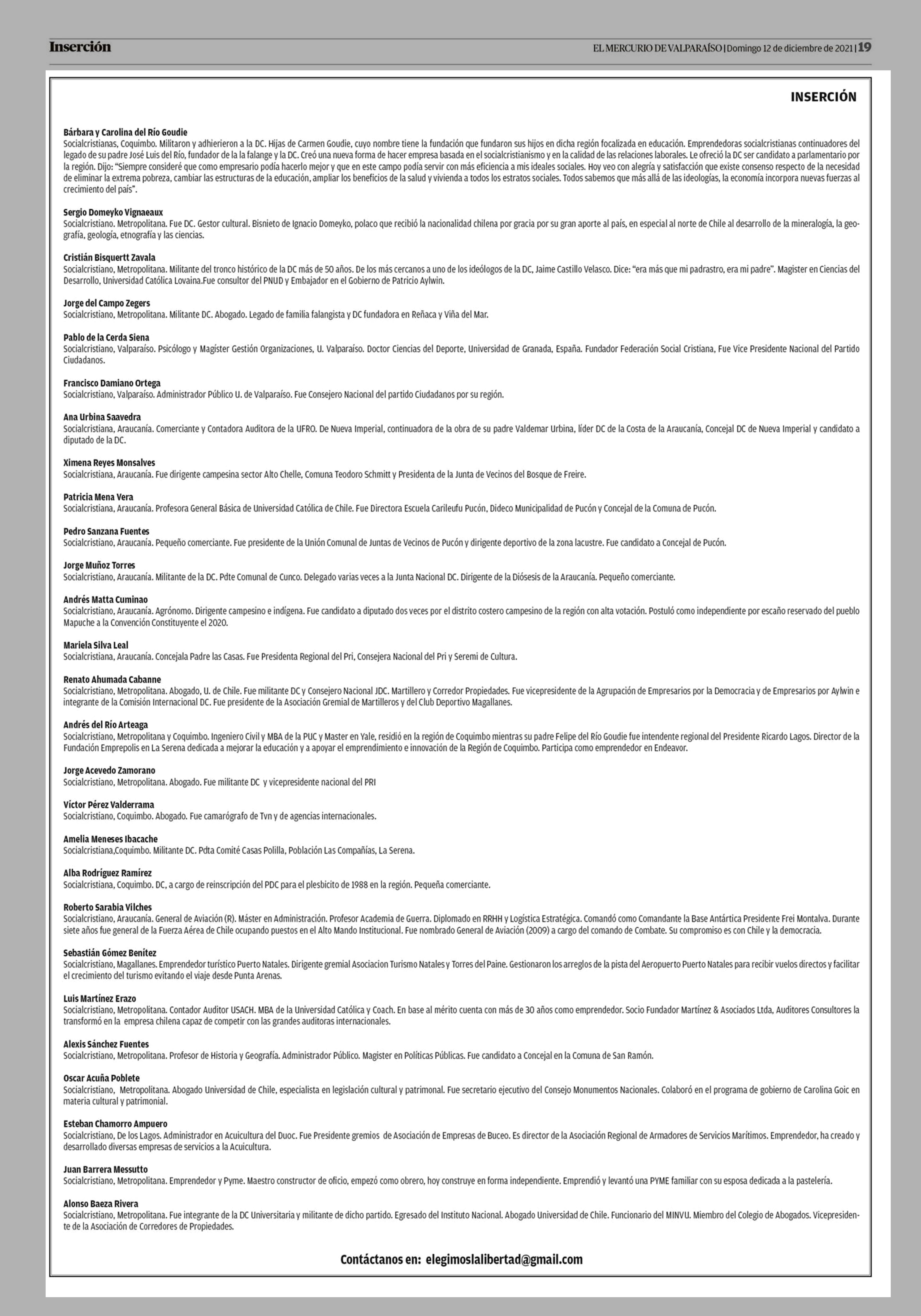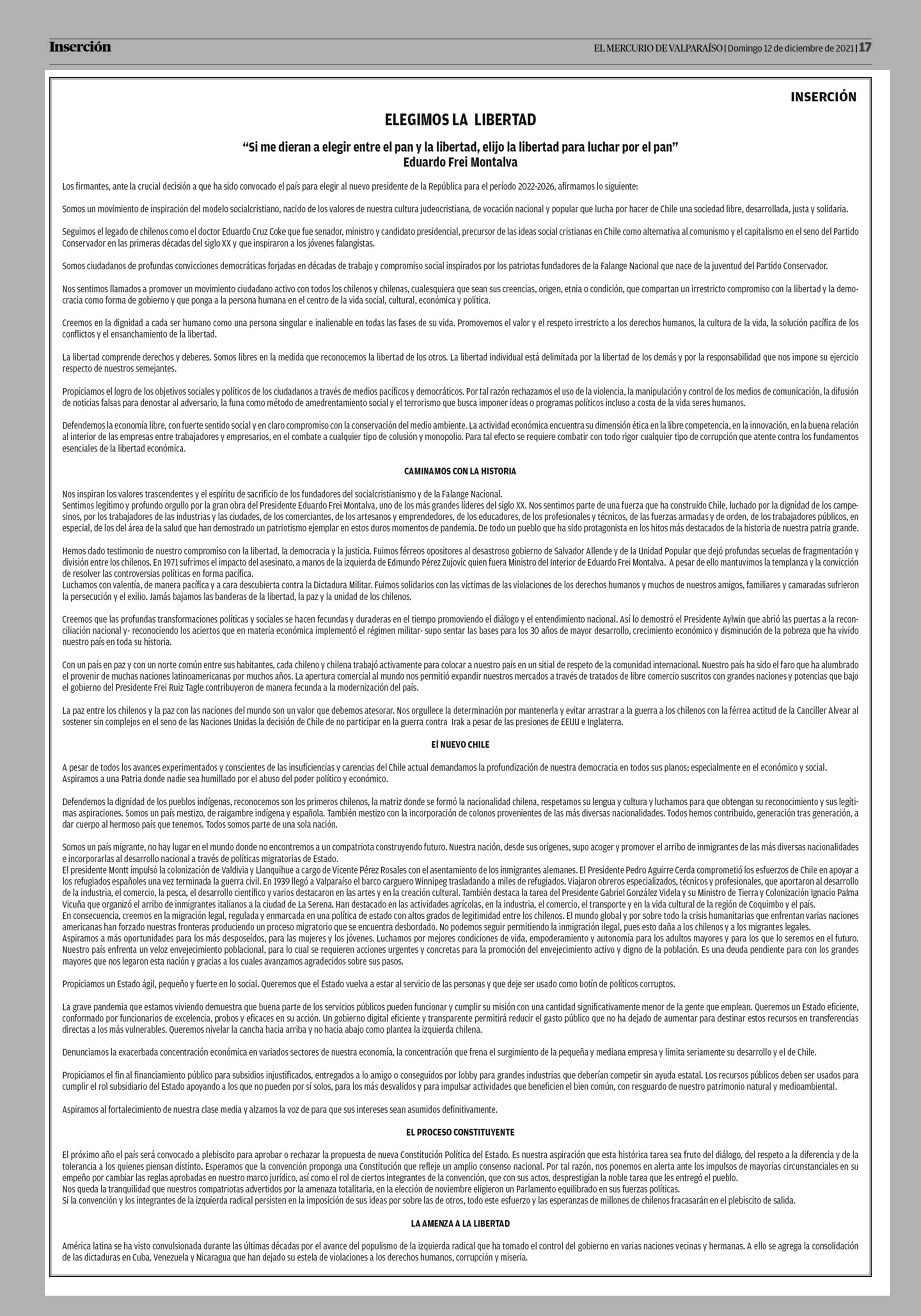 ELEGIMOS LA LIBERTAD “Si me dieran a elegir entre el pan y la libertad, elijo la libertad para luchar por el pan” Eduardo Frei Montalva 12-12-2021 El Mercurio de Valparaíso  |
