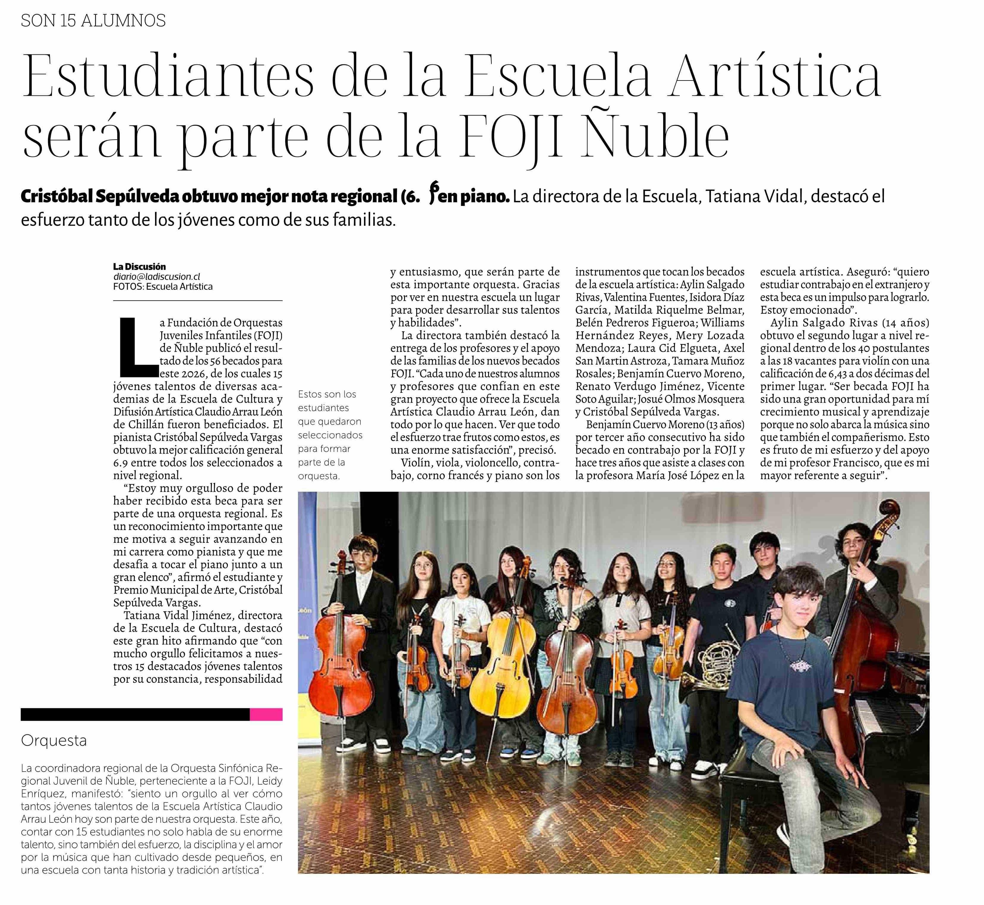 Estudiantes de la Escuela Artística serán parte de la FOJI Ñuble 11-04-2026 La Discusión |