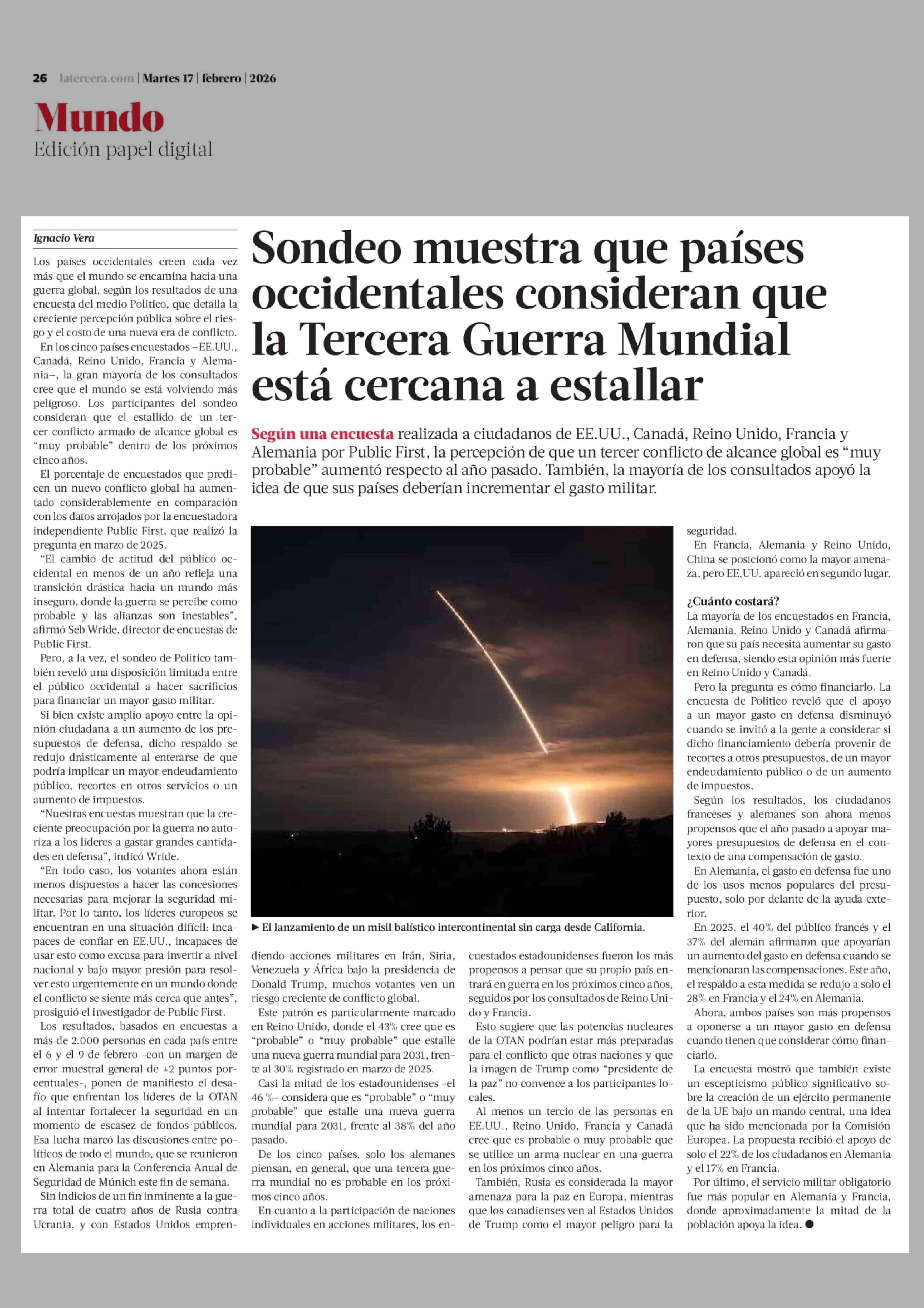 Título: Sondeo muestra que países occidentales consideran que la Tercera Guerra Mundial está cercana a estallar