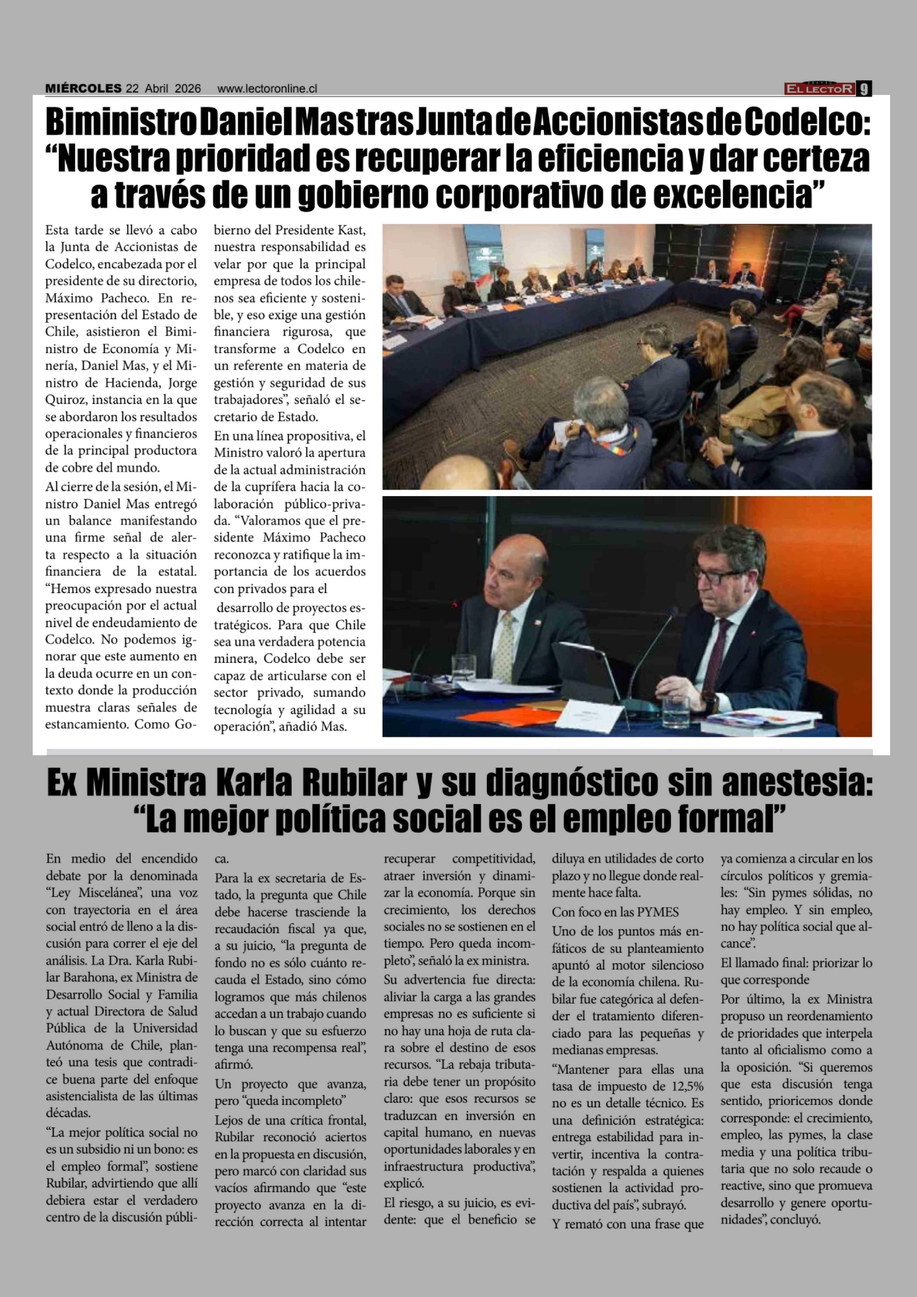 Título: Biministro Daniel Mas tras Junta de Accionistas de Codelco: "Nuestra prioridad es recuperar la eficiencia y dar certeza a través de un gobierno corporativo de excelencia"