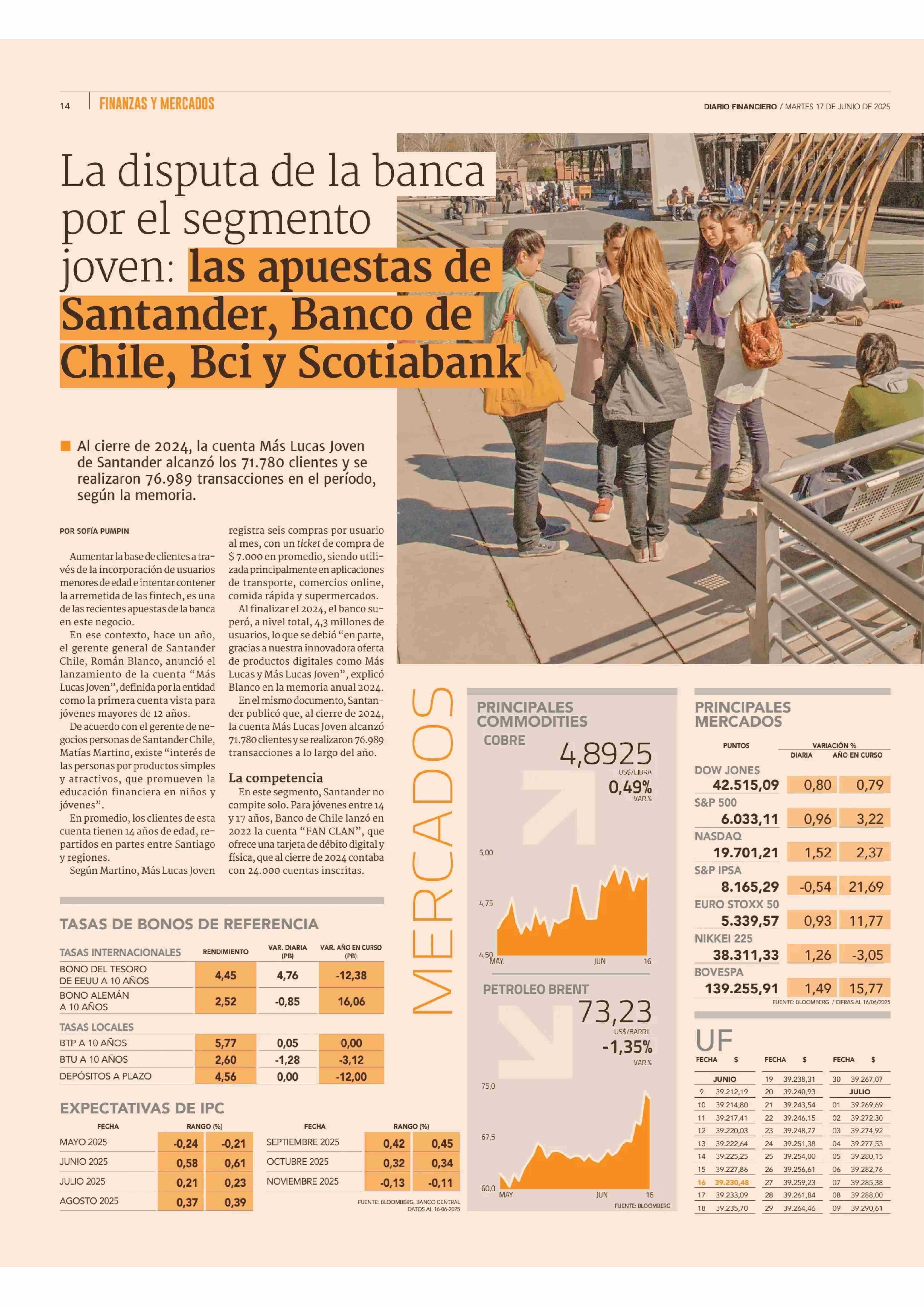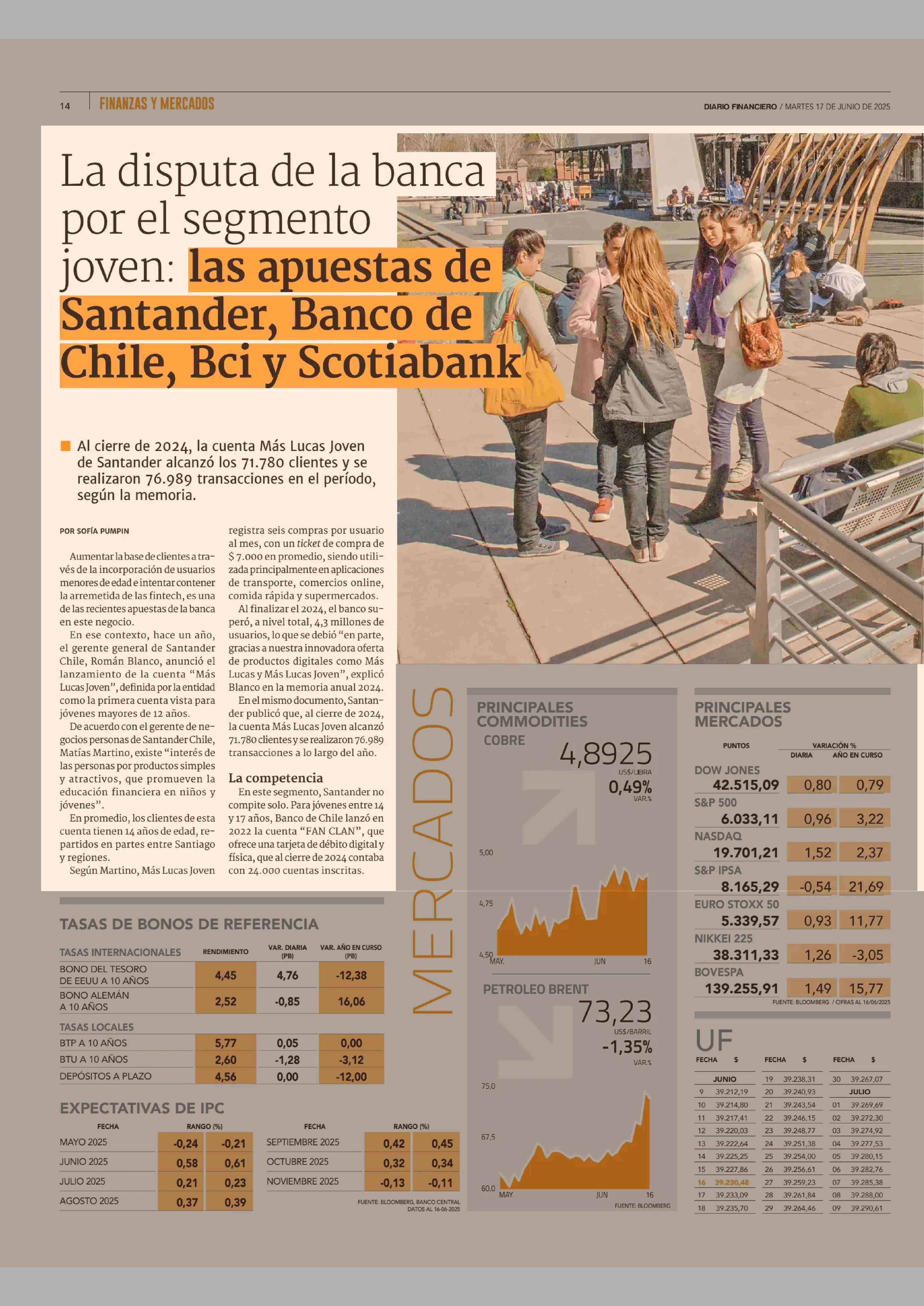 La disputa de la banca por el segmento joven: las apuestas de Santander, Banco de Chile, Bci y Scotiabank 17-06-2025 Diario Financiero |