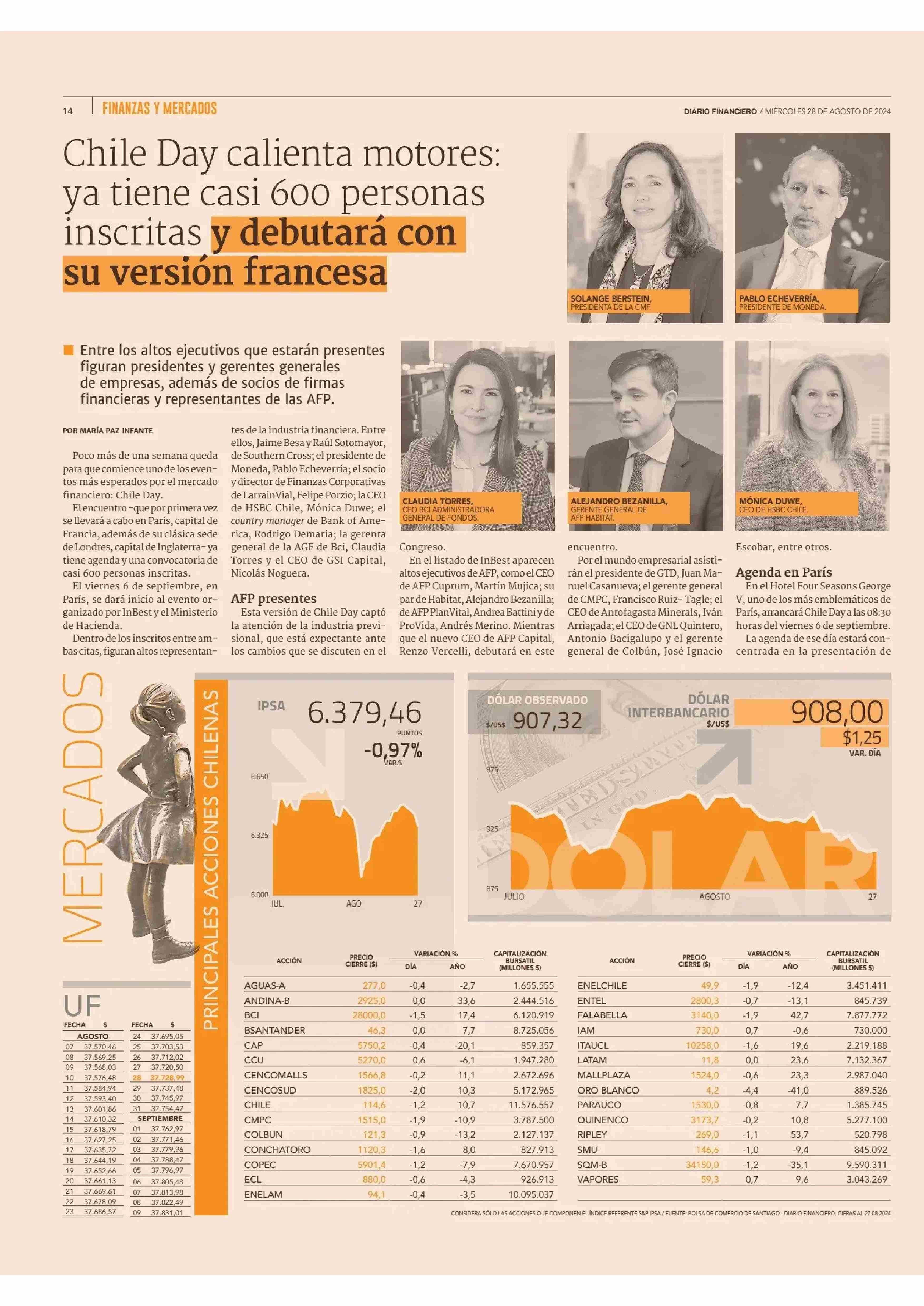 Chile Day calienta motores: ya tiene casi 600 personas inscritas y debutará con su versión francesa 28-08-2024 Diario Financiero |