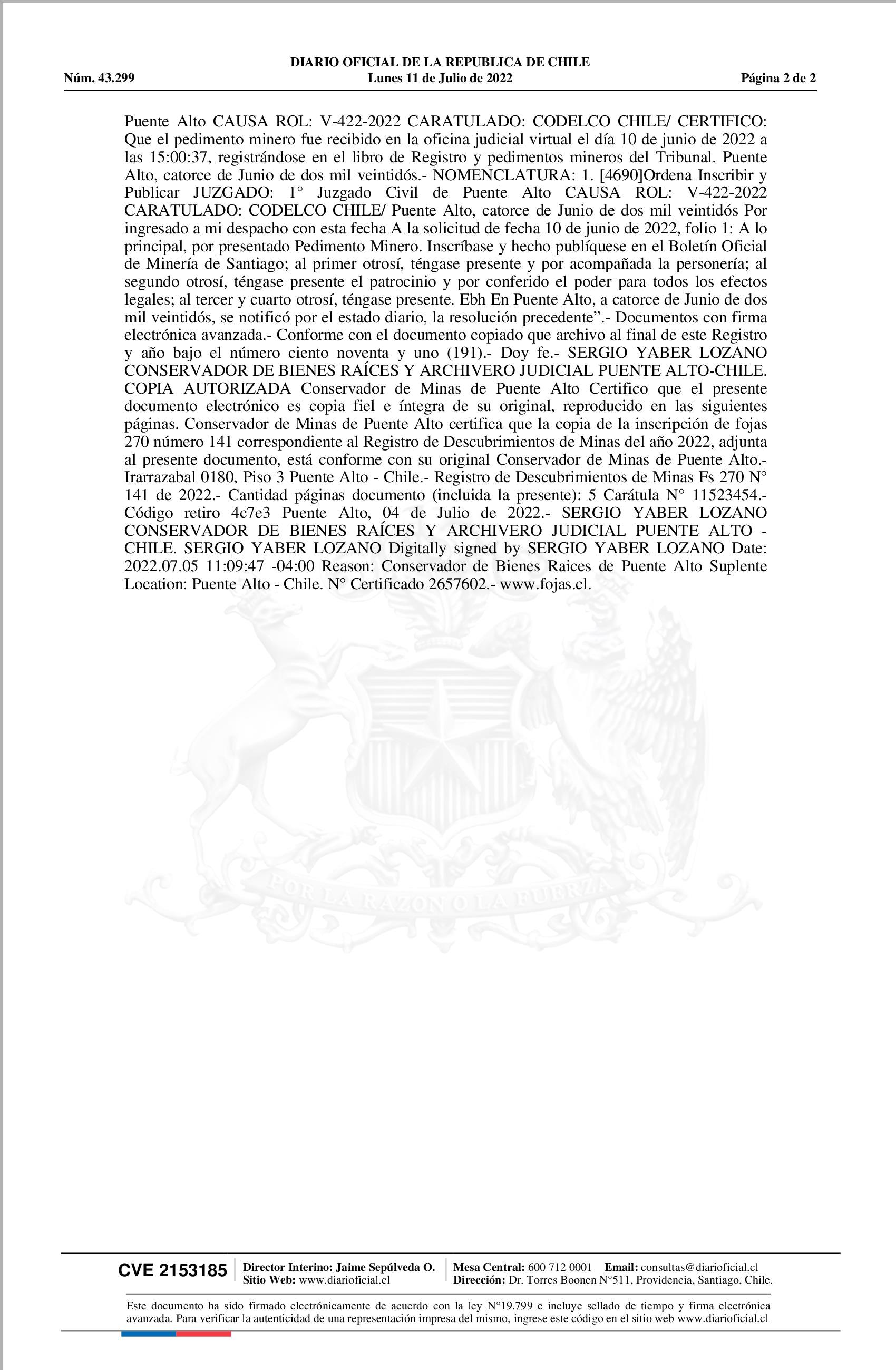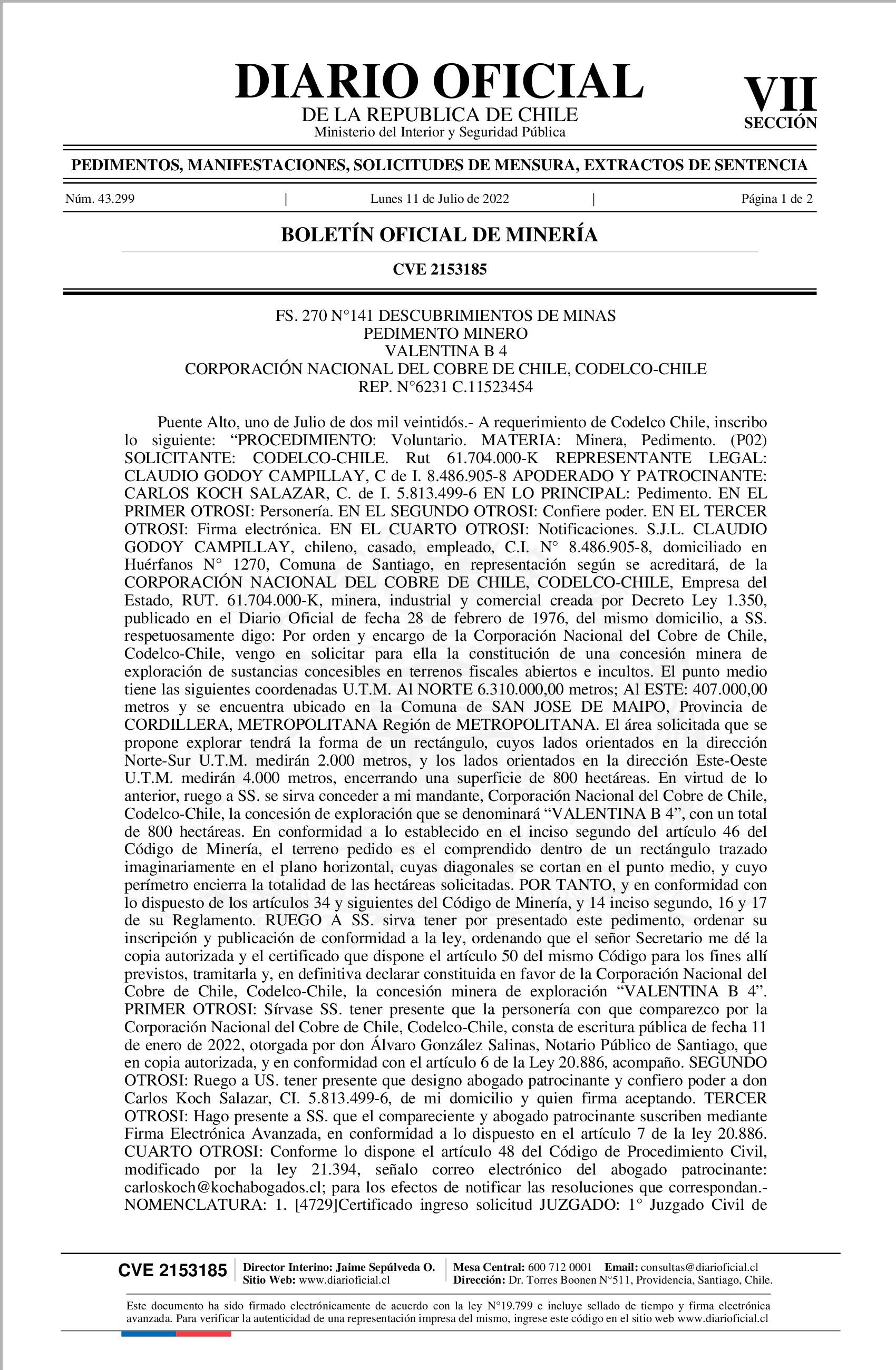 Pedimento Minero Valentina B 4 11-07-2022 Diario Oficial Edición Electrónica |