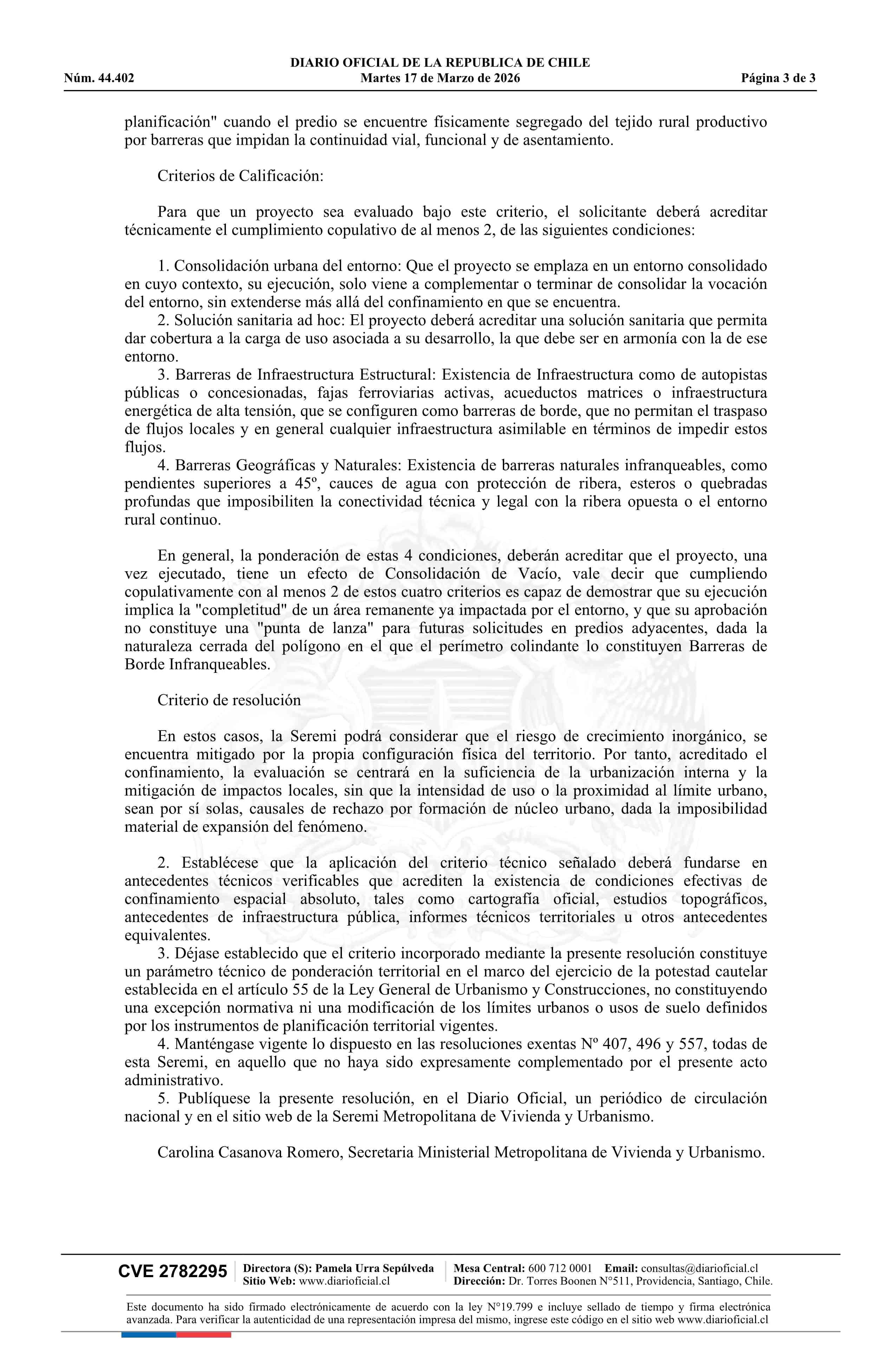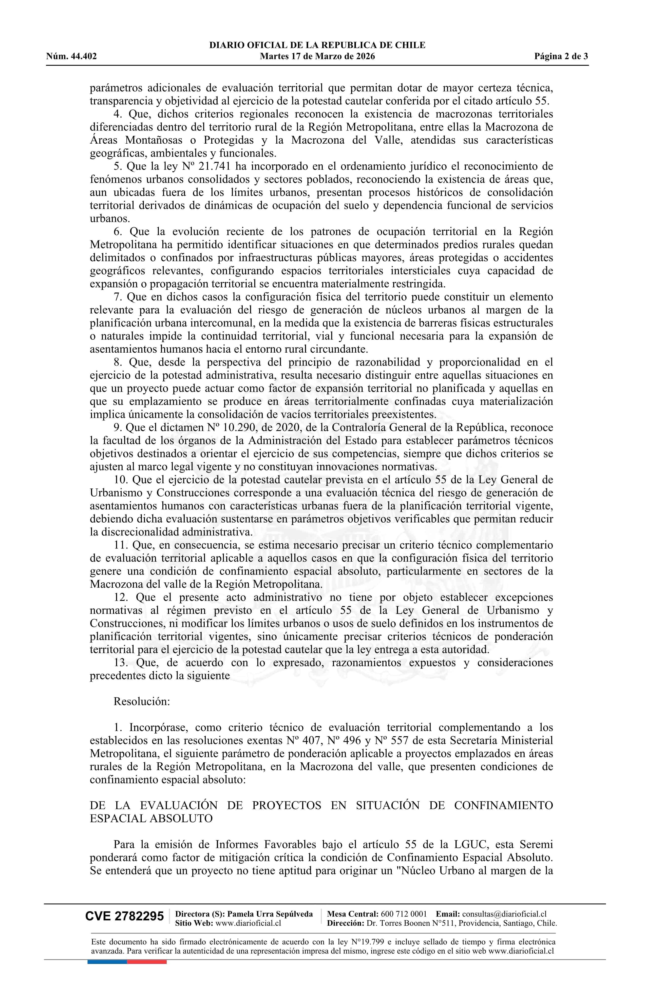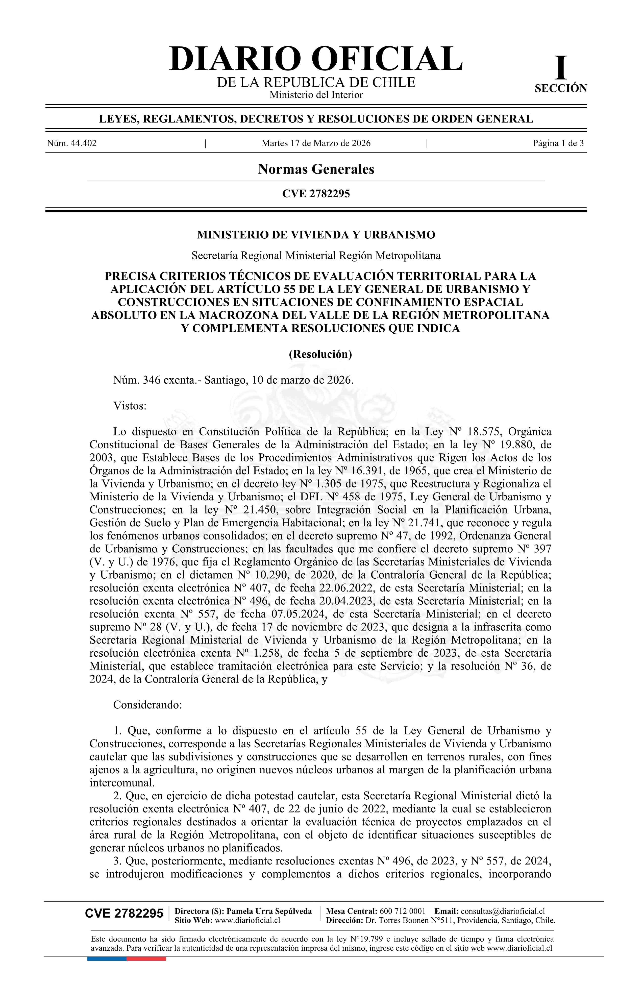 | Título: | Resolución exenta número 346, de 2026.- Precisa criterios técnicos de evaluación territorial para la aplicación del artículo 55 de la Ley General de Urbanismo y Construcciones en situaciones de confinamiento espacial absoluto en la Macrozona del Valle de la Región Metropolitana y complementa resoluc |
