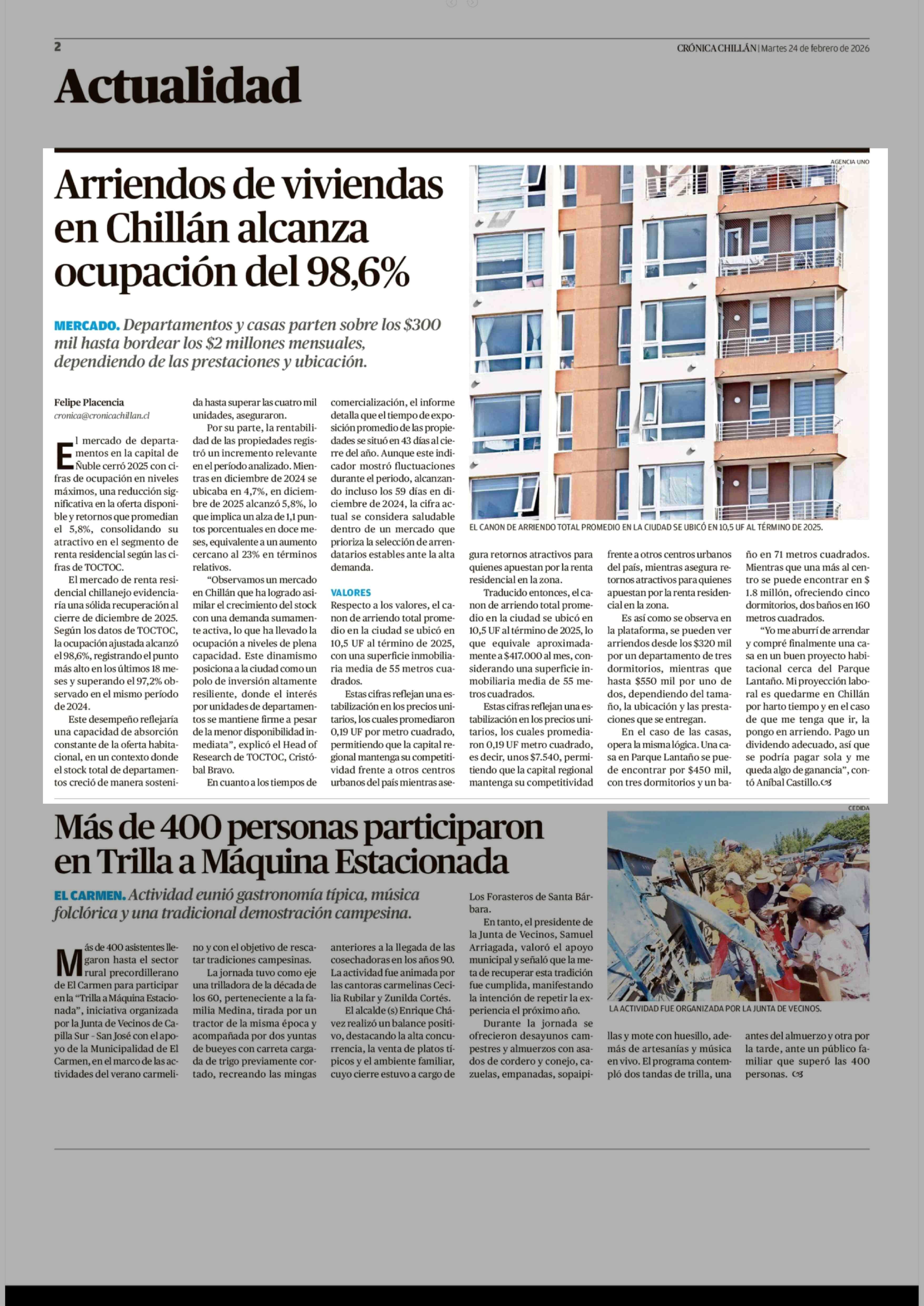 Arriendos de viviendas en Chillán alcanza ocupación del 98,6% 24-02-2026 Crónica de Chillán |