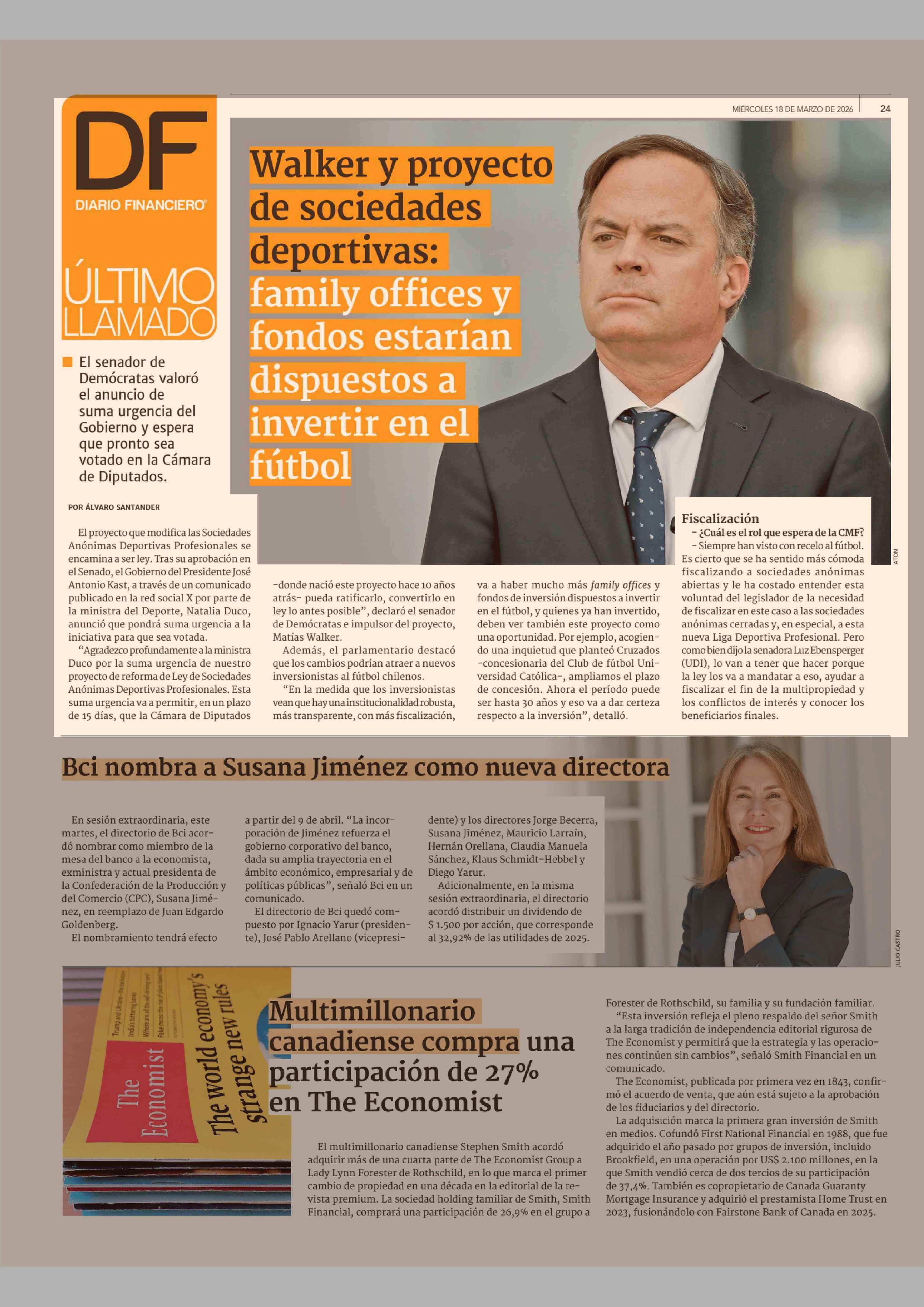 Walker y proyecto de sociedades deportivas: family offices y fondos estarían dispuestos a invertir en el fútbol 18-03-2026 Diario Financiero |