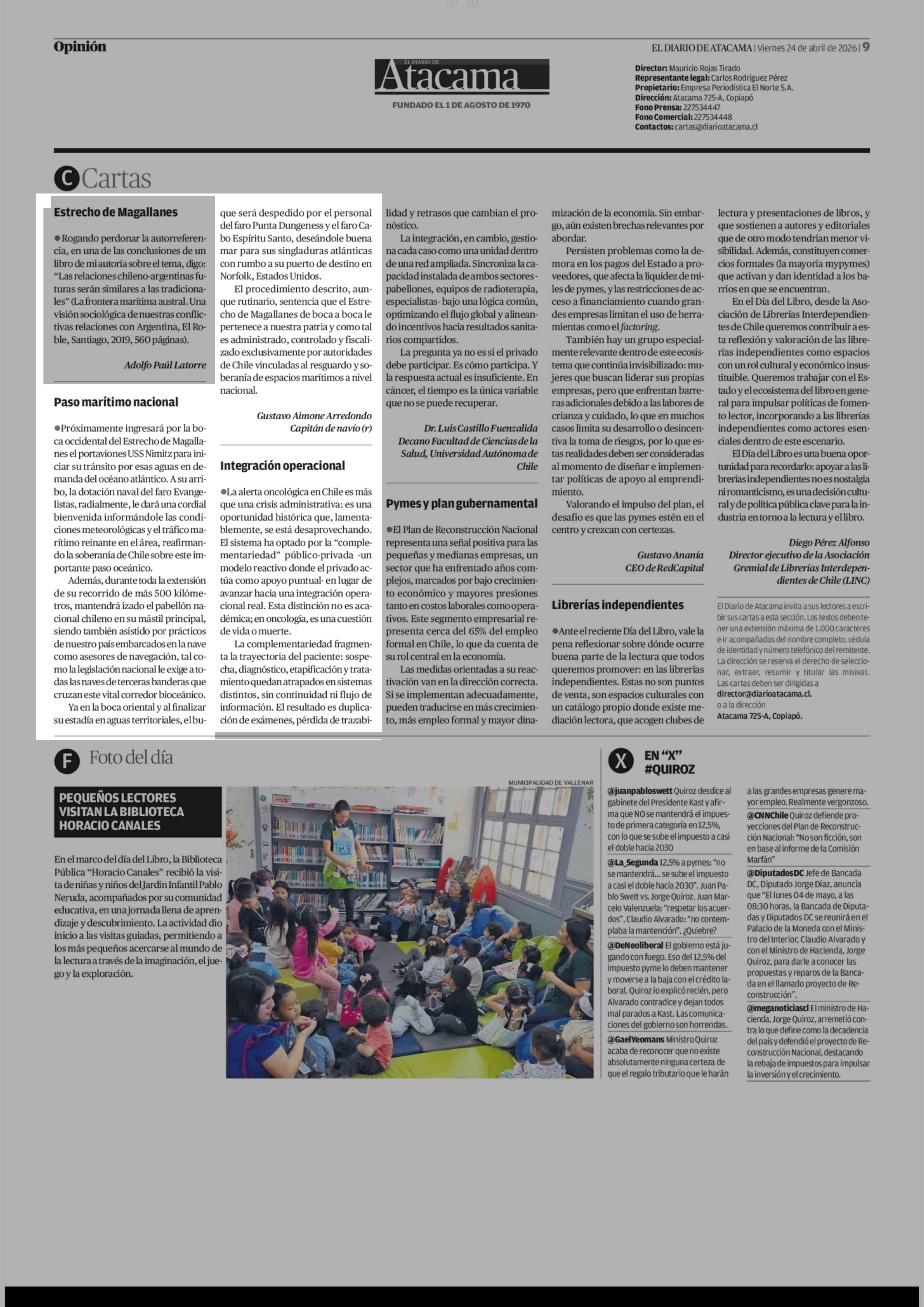 CARTAS: Paso marítimo nacional 24-04-2026 El Diario de Atacama |