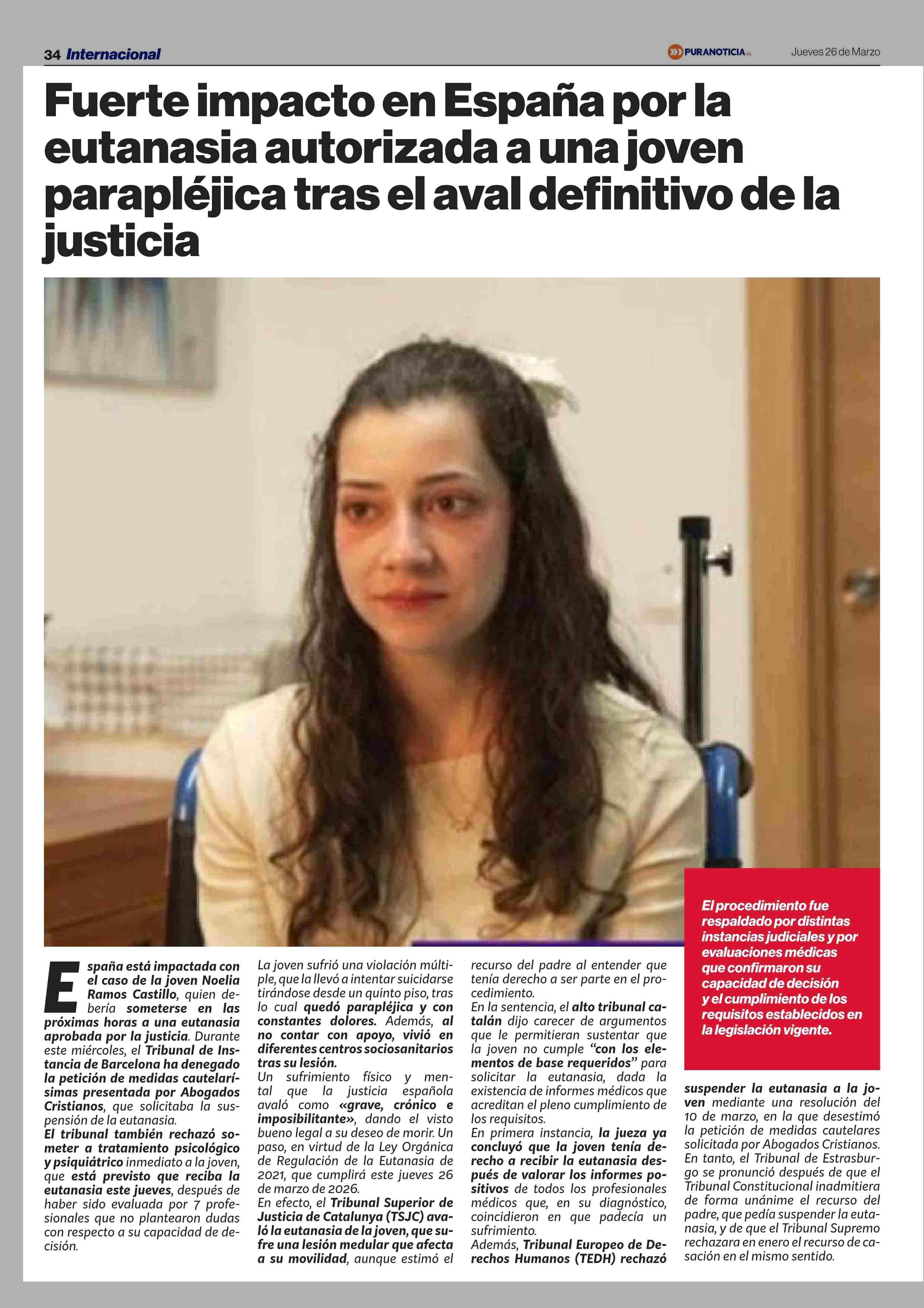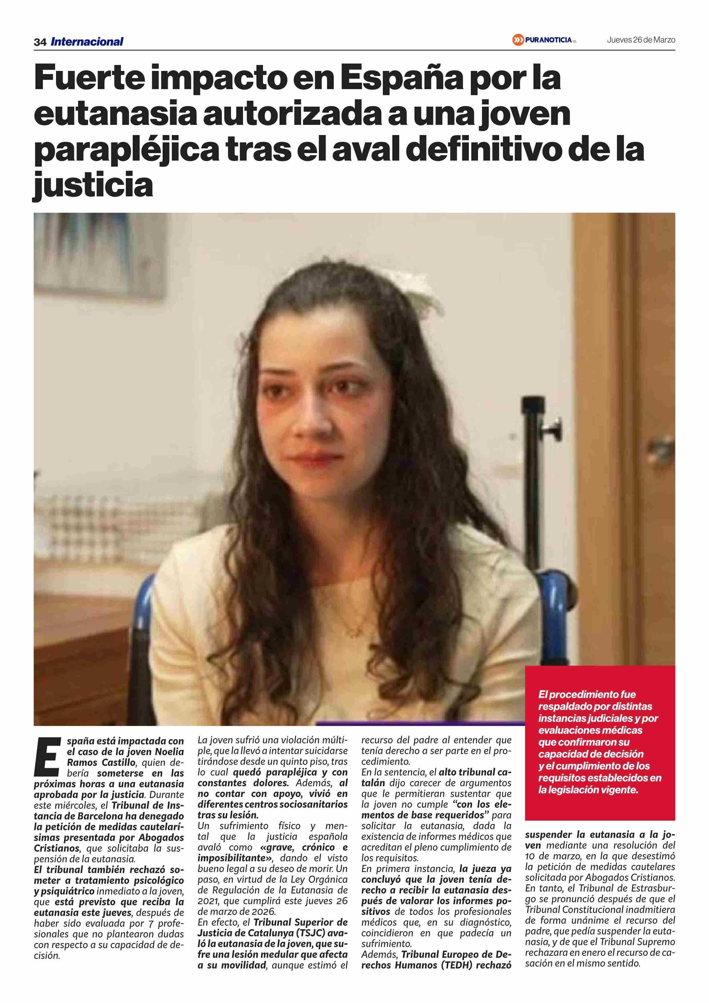 Título: Fuerte impacto en España por la eutanasia autorizada a una joven parapléjica tras el aval definitivo de la justicia