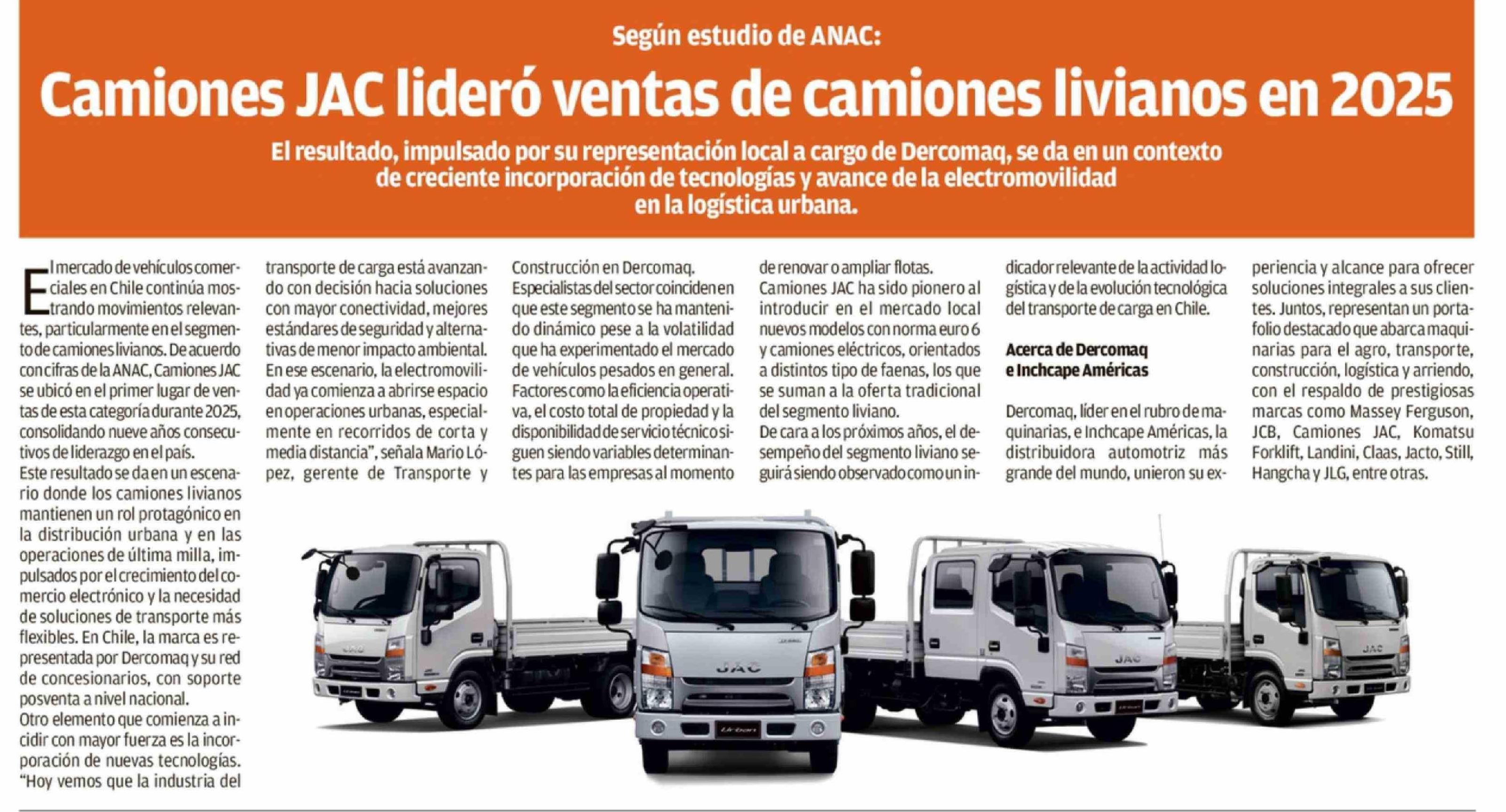 Camiones JAC lideró ventas de camiones livianos en 2025 12-03-2026 El Mercurio de Valparaíso |