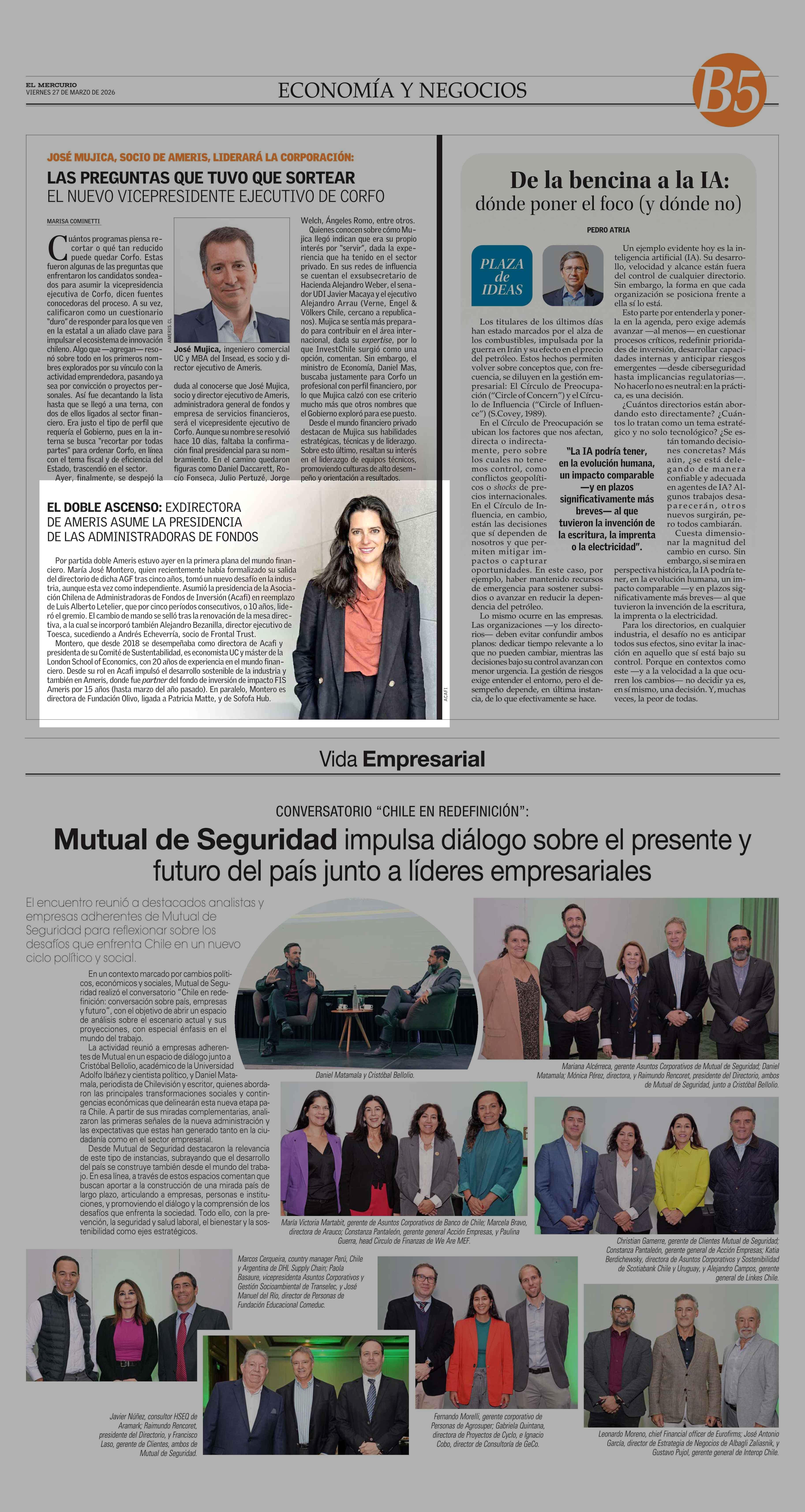 EL DOBLE ASCENSO: EXDIRECTORA DE AMERIS ASUME LA PRESIDENCIA DE LAS ADMINISTRADORAS DE FONDOS 27-03-2026 El Mercurio |