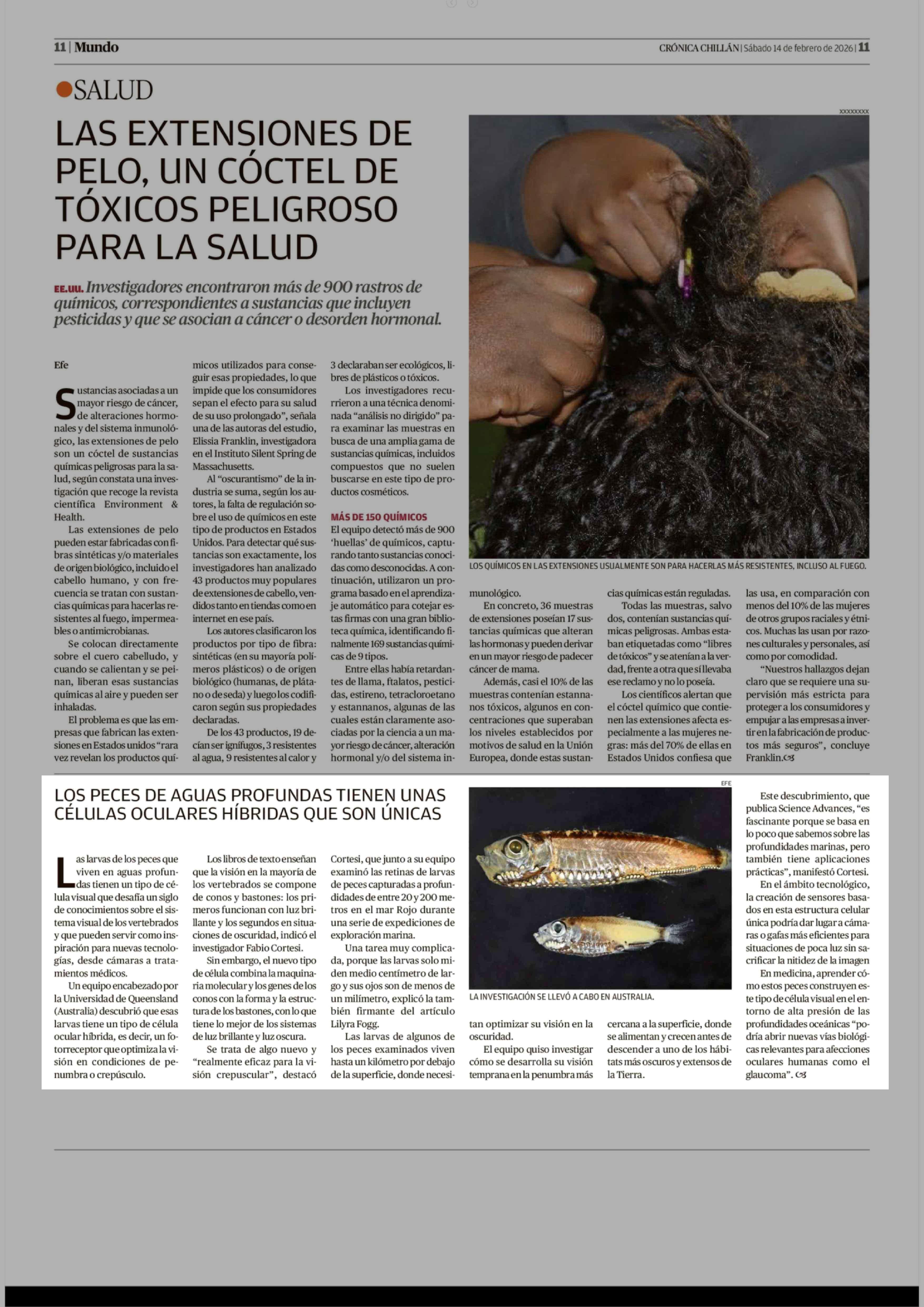 LOS PECES DE AGUAS PROFUNDAS TIENEN UNAS CÉLULAS OCULARES HÍBRIDAS QUE SON ÚNICAS 14-02-2026 Crónica de Chillán |