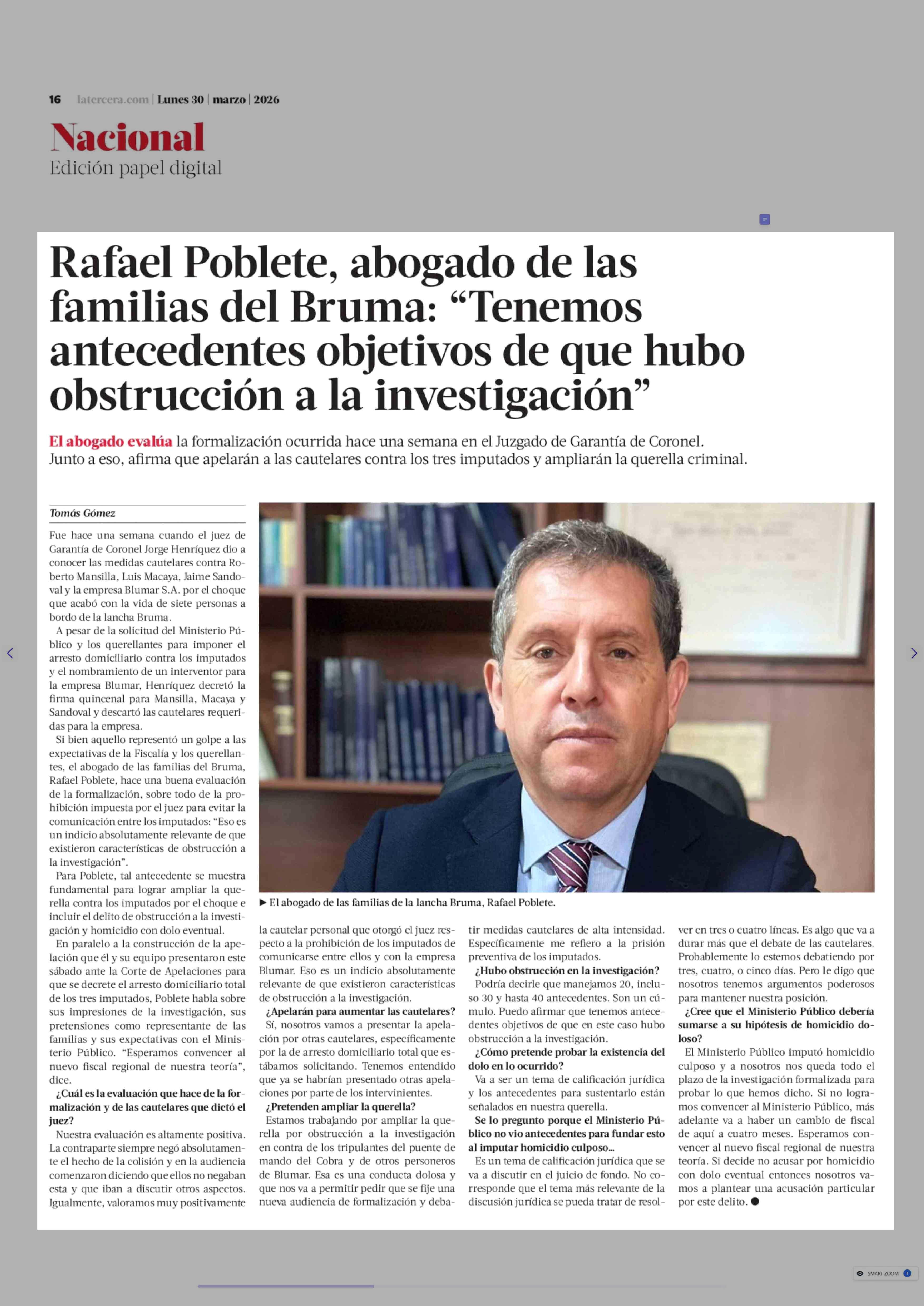 Título: Rafael Poblete, abogado de las familias del Bruma: "Tenemos antecedentes objetivos de que hubo obstrucción a la investigación"